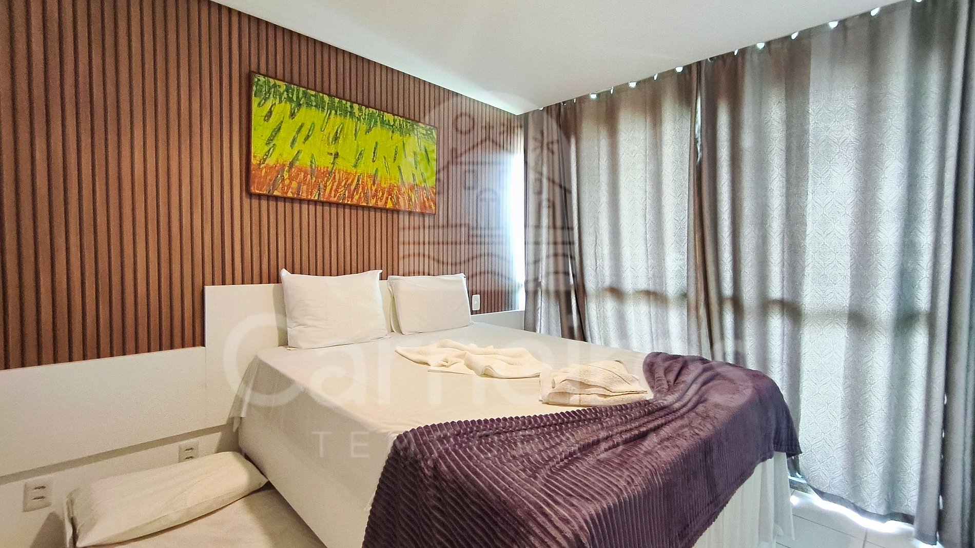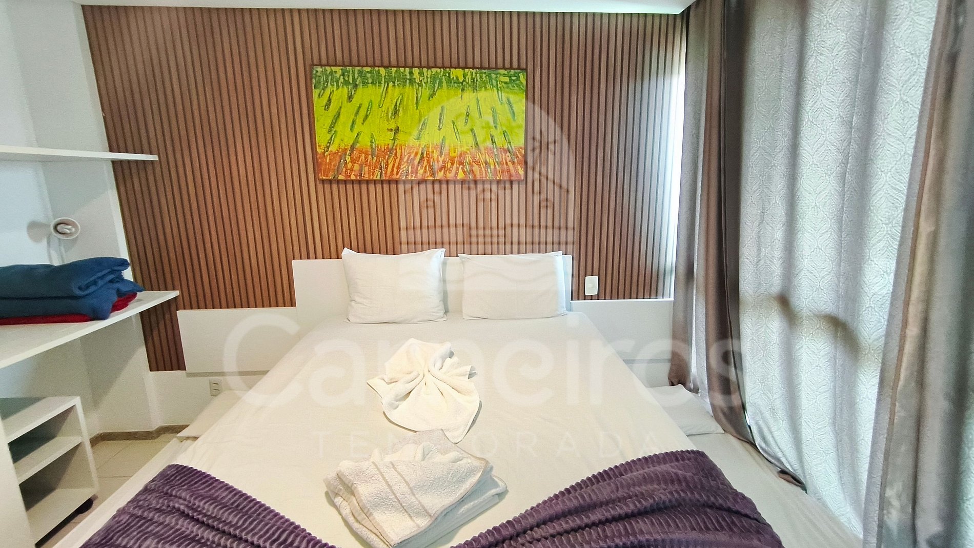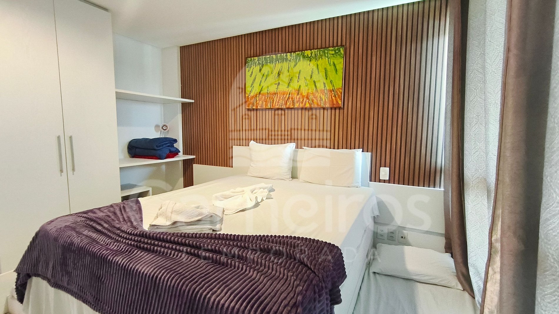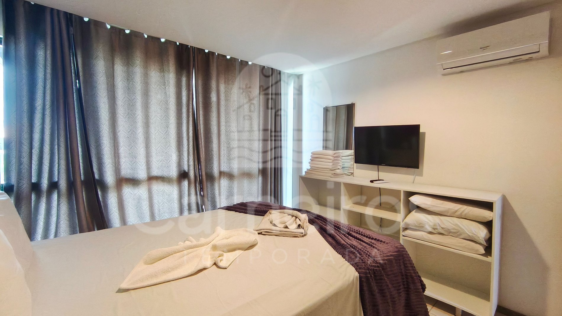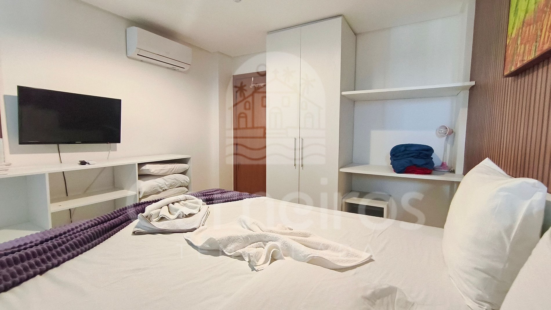- Quarto: cama de casal queen + 02 bicamas de solteiro + 1 colchão solteiro (acomoda até 05 pessoas), armário, TV e ar-condicionado;