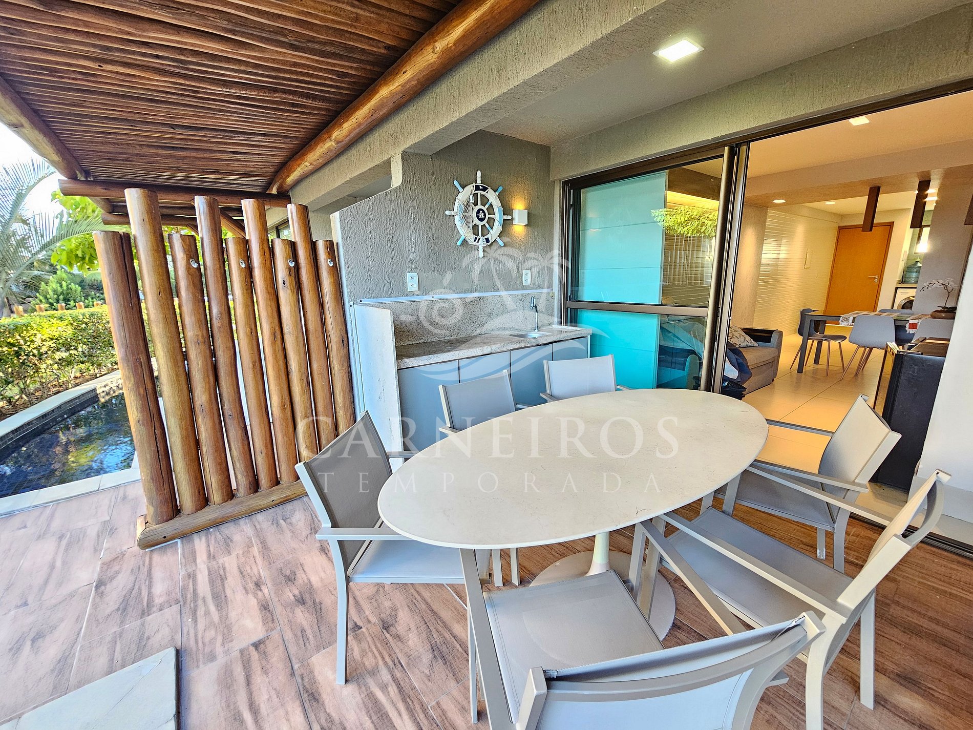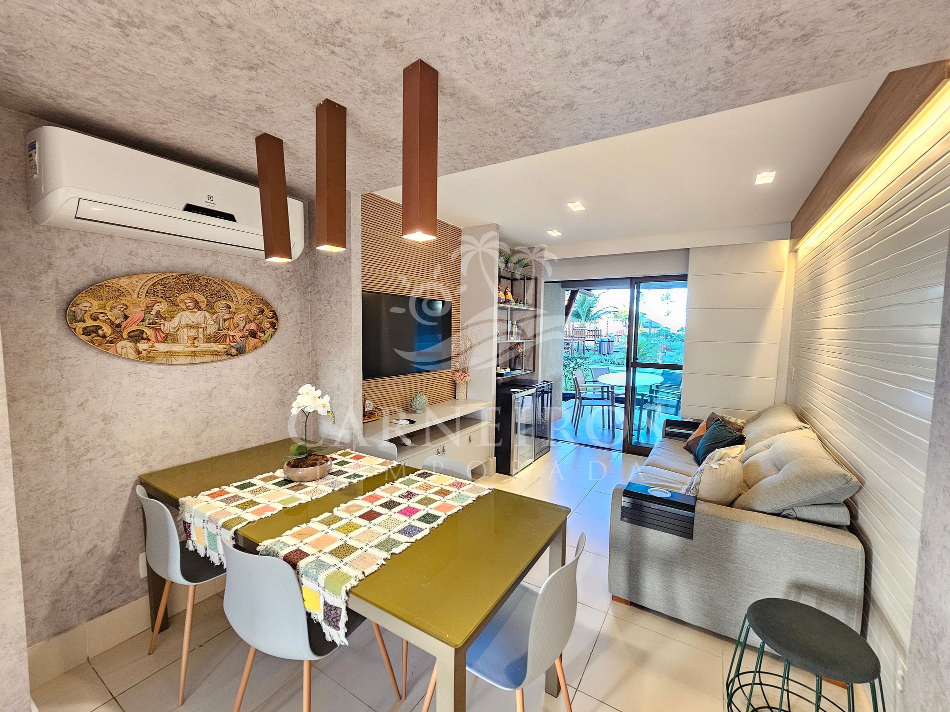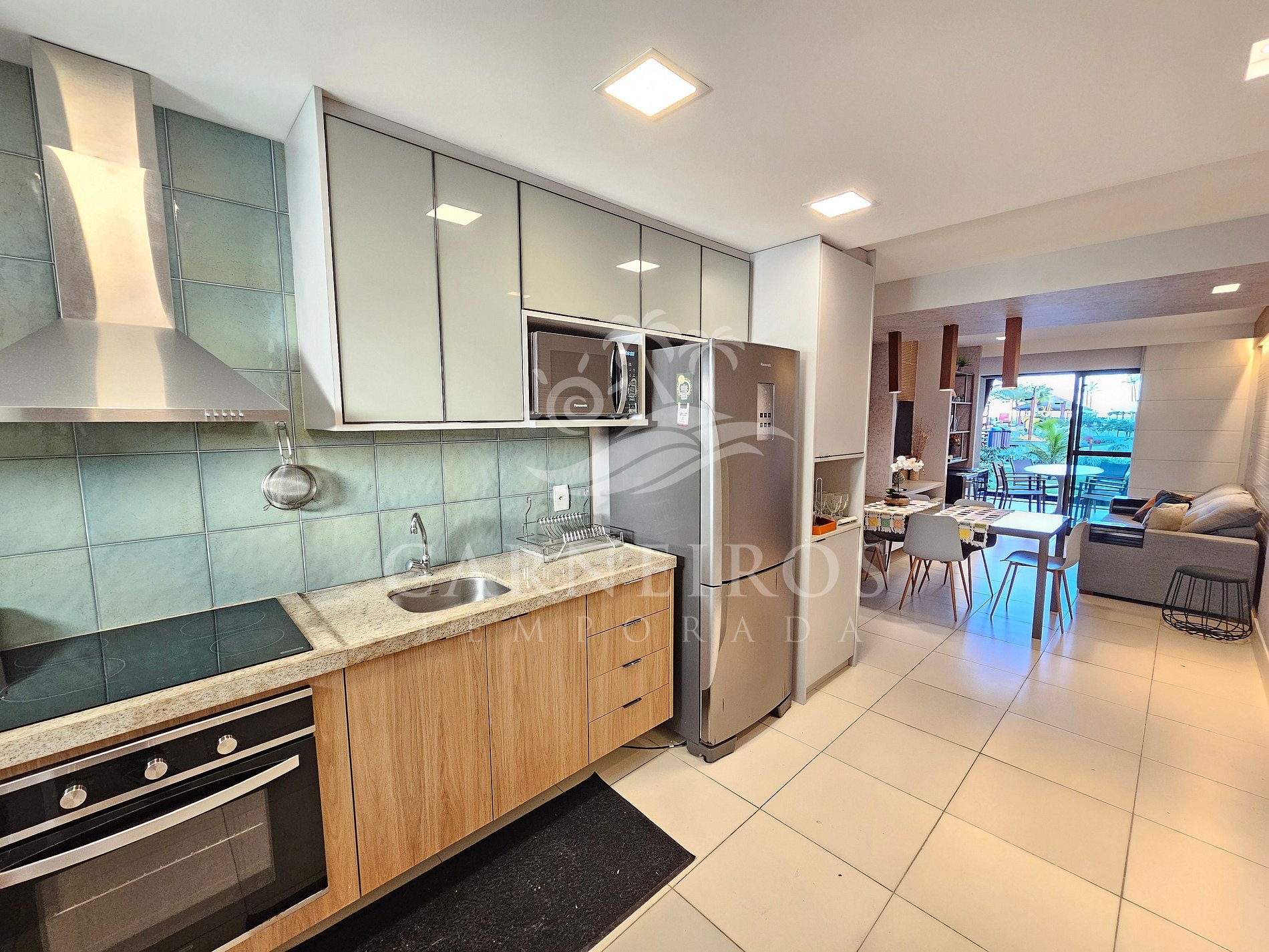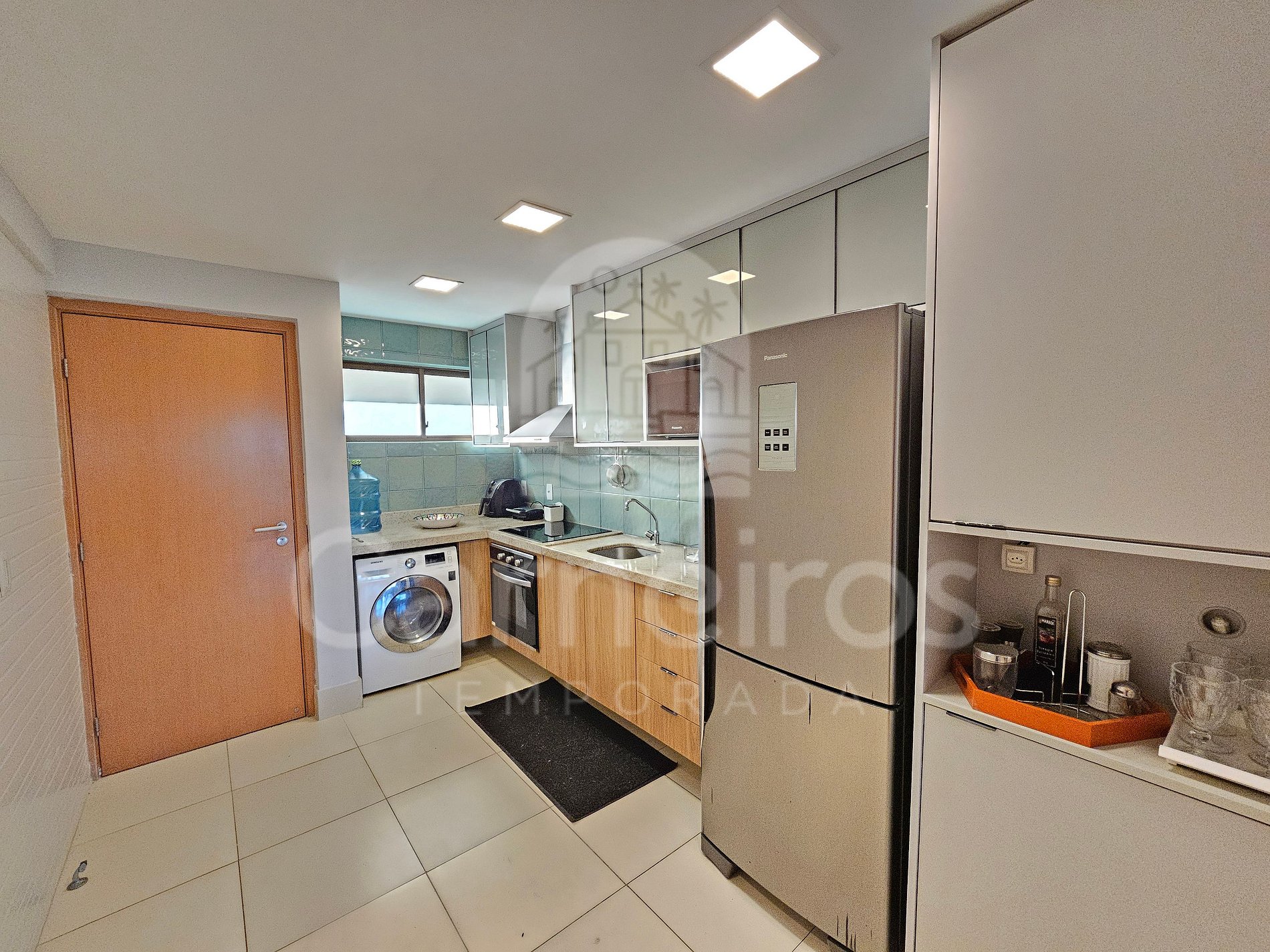 A sala de estar conta com uma linda decoração moderna, sofá, TV, cervejeira, adega, ar-condicionado e uma mesa de jantar com 5 cadeiras. A cozinha é equipada com os principais utensílios como louças, panelas, geladeira, micro-ondas, forno elétrico, fogão cooktop, liquidificador, air fryer, sanduicheira, bebedouro e outros. Possui também 02 banheiros completos.