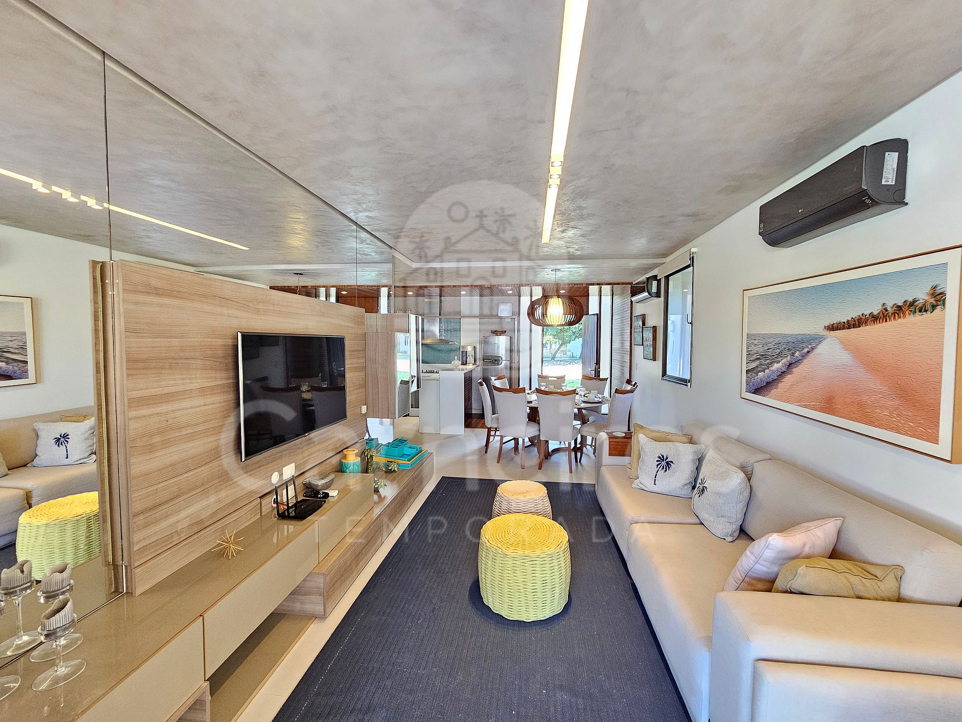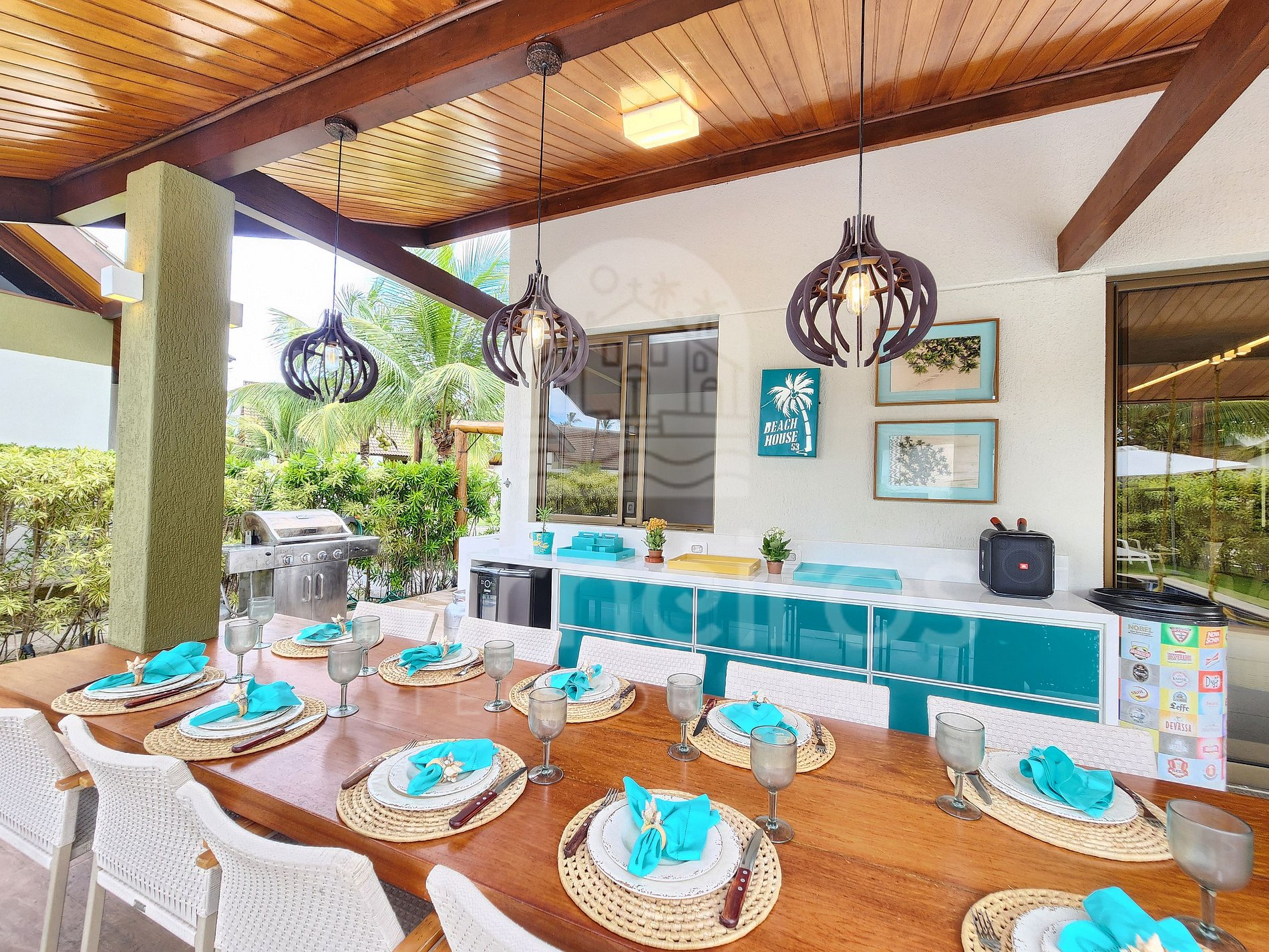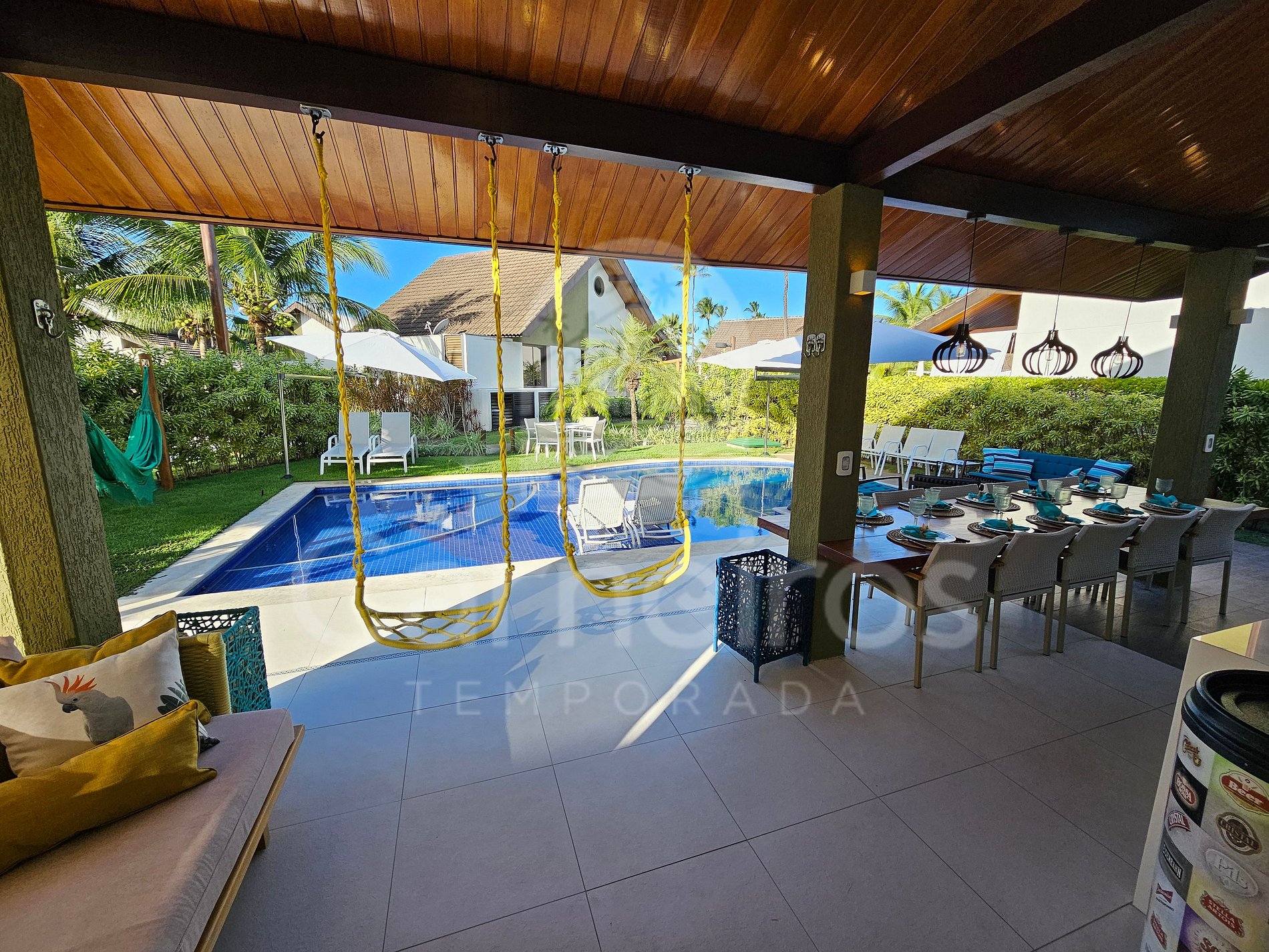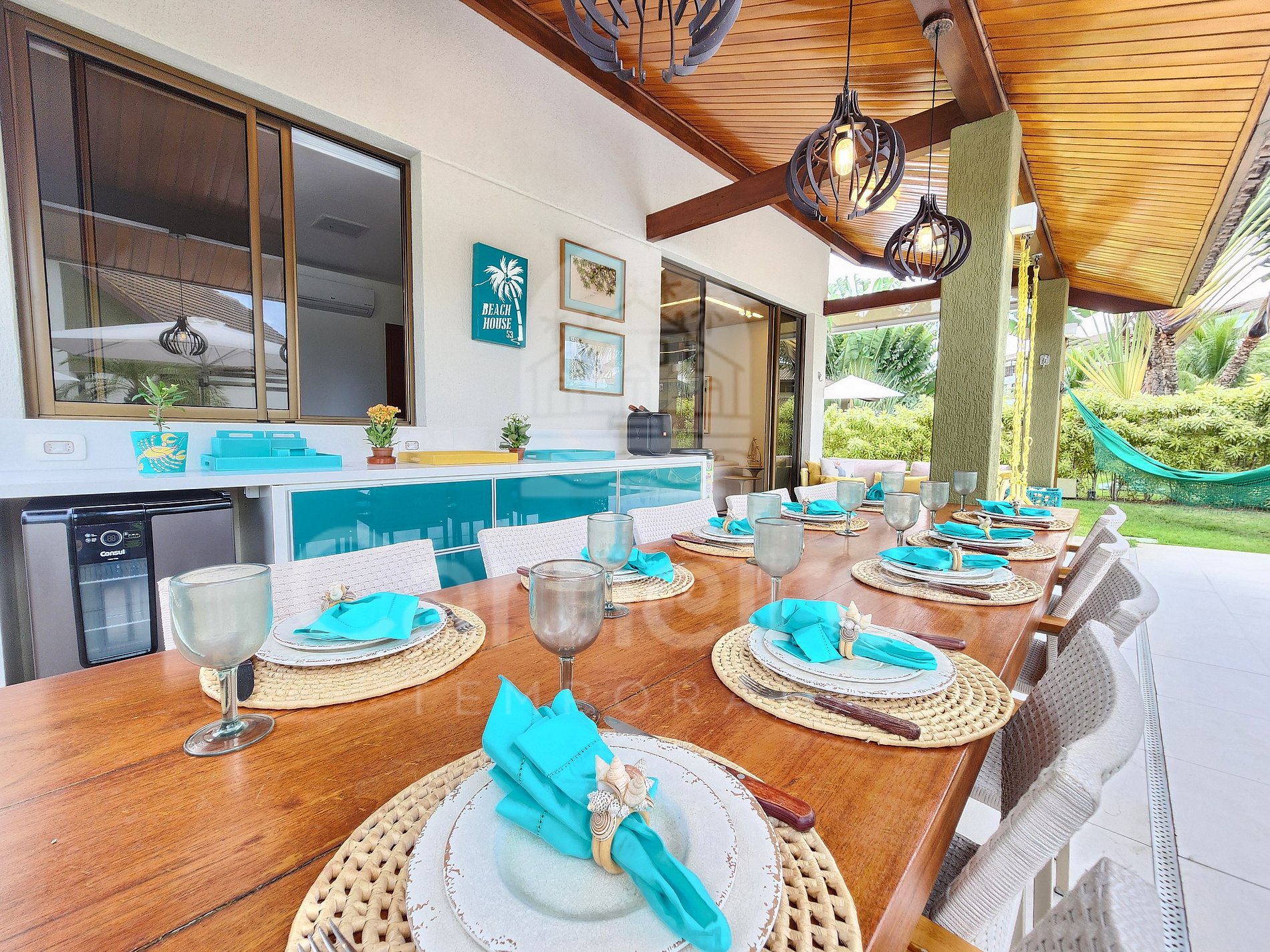 A sala de estar com agradável decoração possui sofá, ar-condicionado, cervejeira e TV. A cozinha é completa e possui diversos itens como geladeira, fogão, micro-ondas, liquidificador, sanduicheira, bebedouro, air fryer e outros utensílios. Há também uma sala de jantar com mesa para oito pessoas. O bangalô possui 3 banheiros completos.