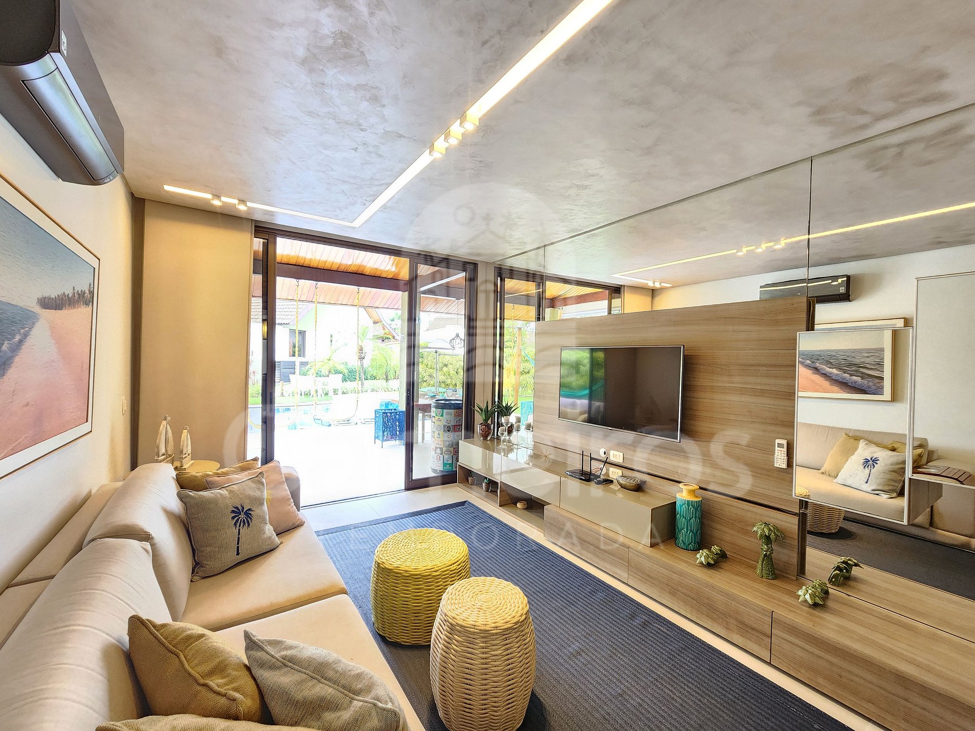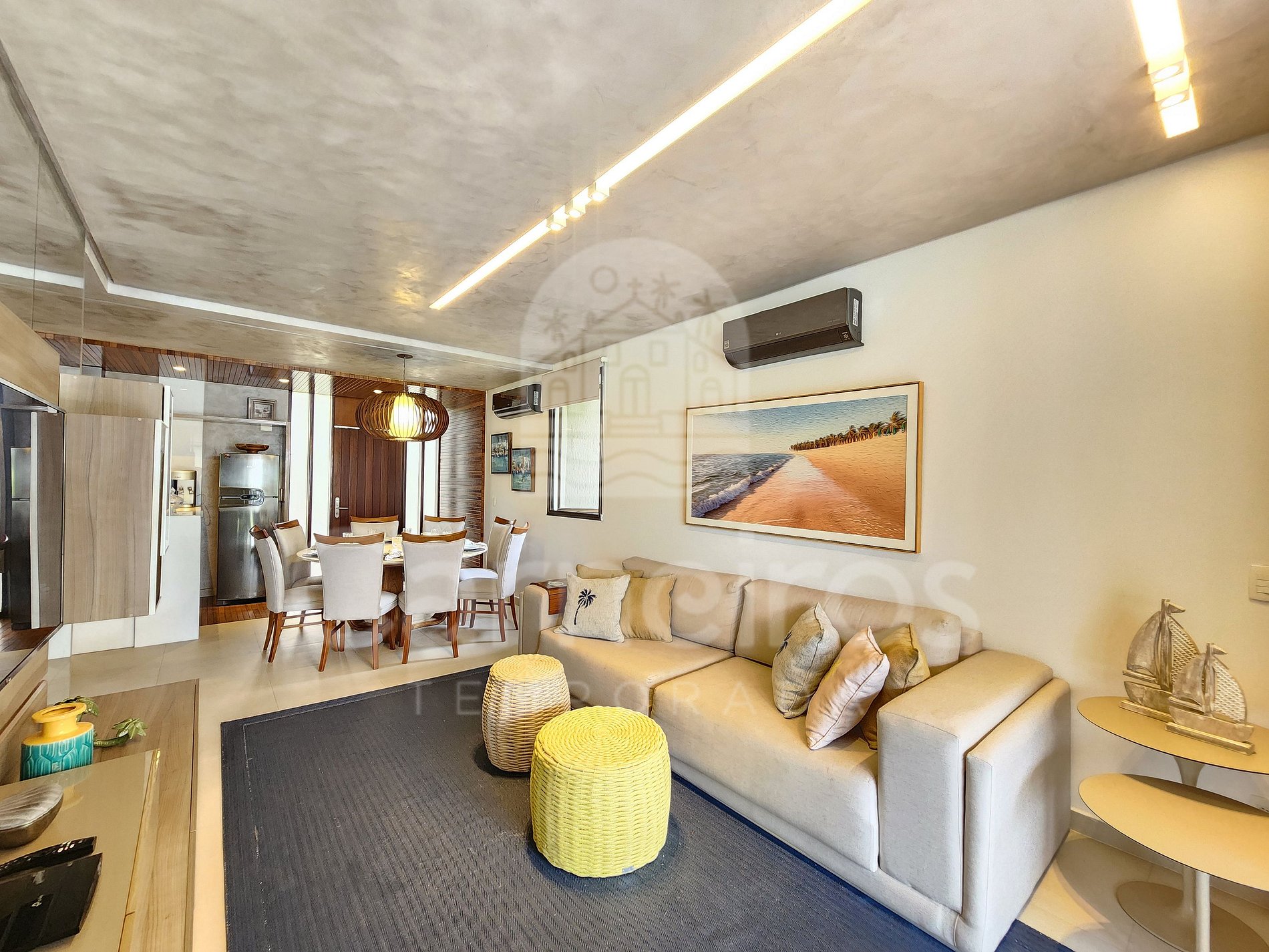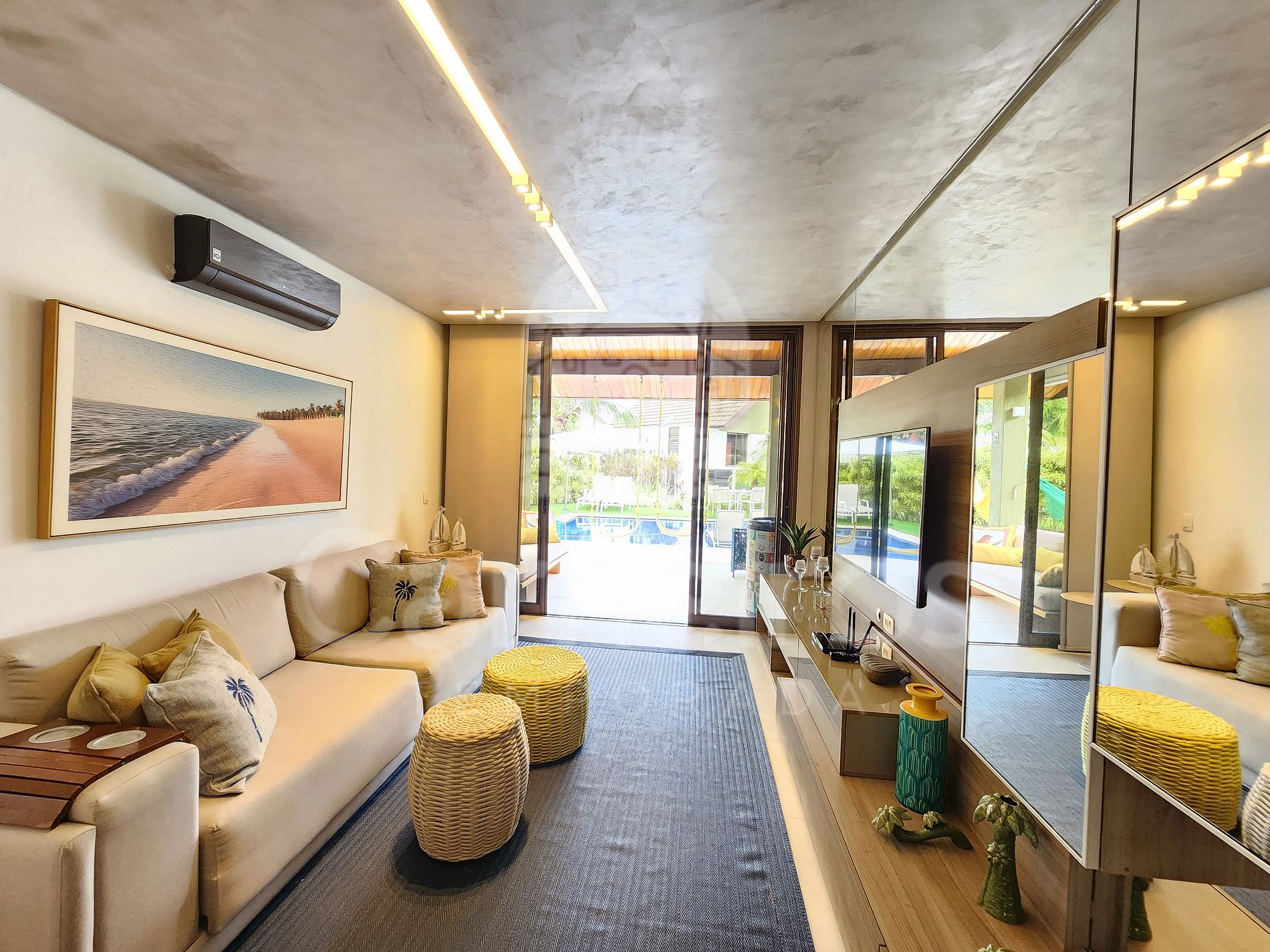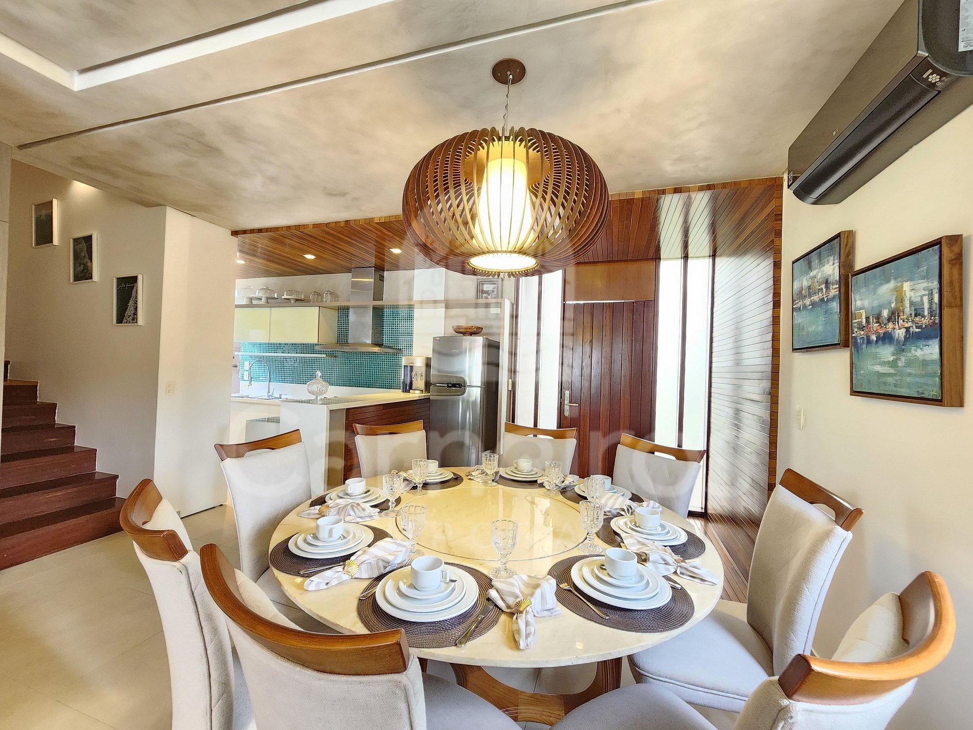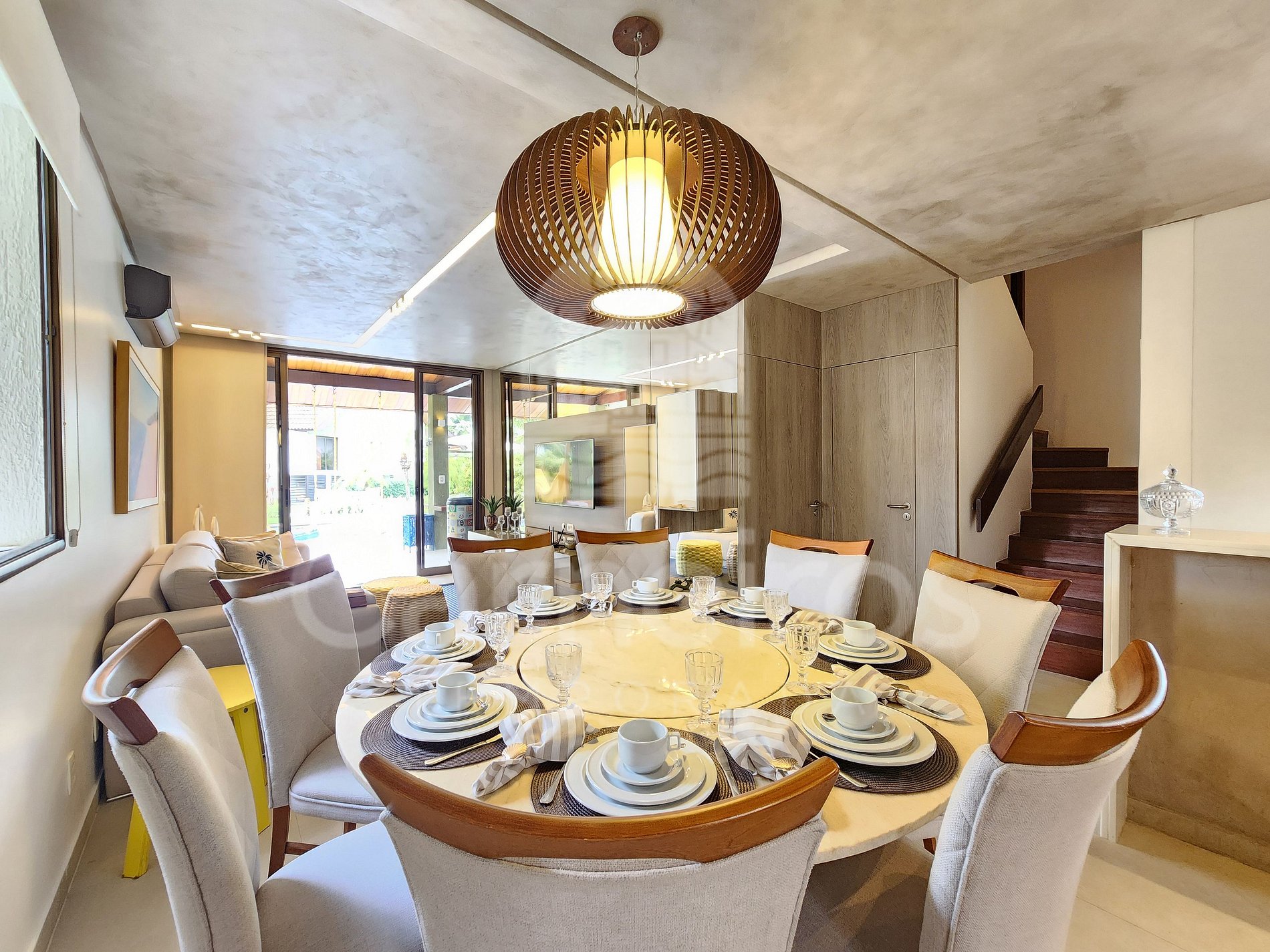 A sala de estar com agradável decoração possui sofá, ar-condicionado, cervejeira e TV. A cozinha é completa e possui diversos itens como geladeira, fogão, micro-ondas, liquidificador, sanduicheira, bebedouro, air fryer e outros utensílios. Há também uma sala de jantar com mesa para oito pessoas. O bangalô possui 3 banheiros completos.