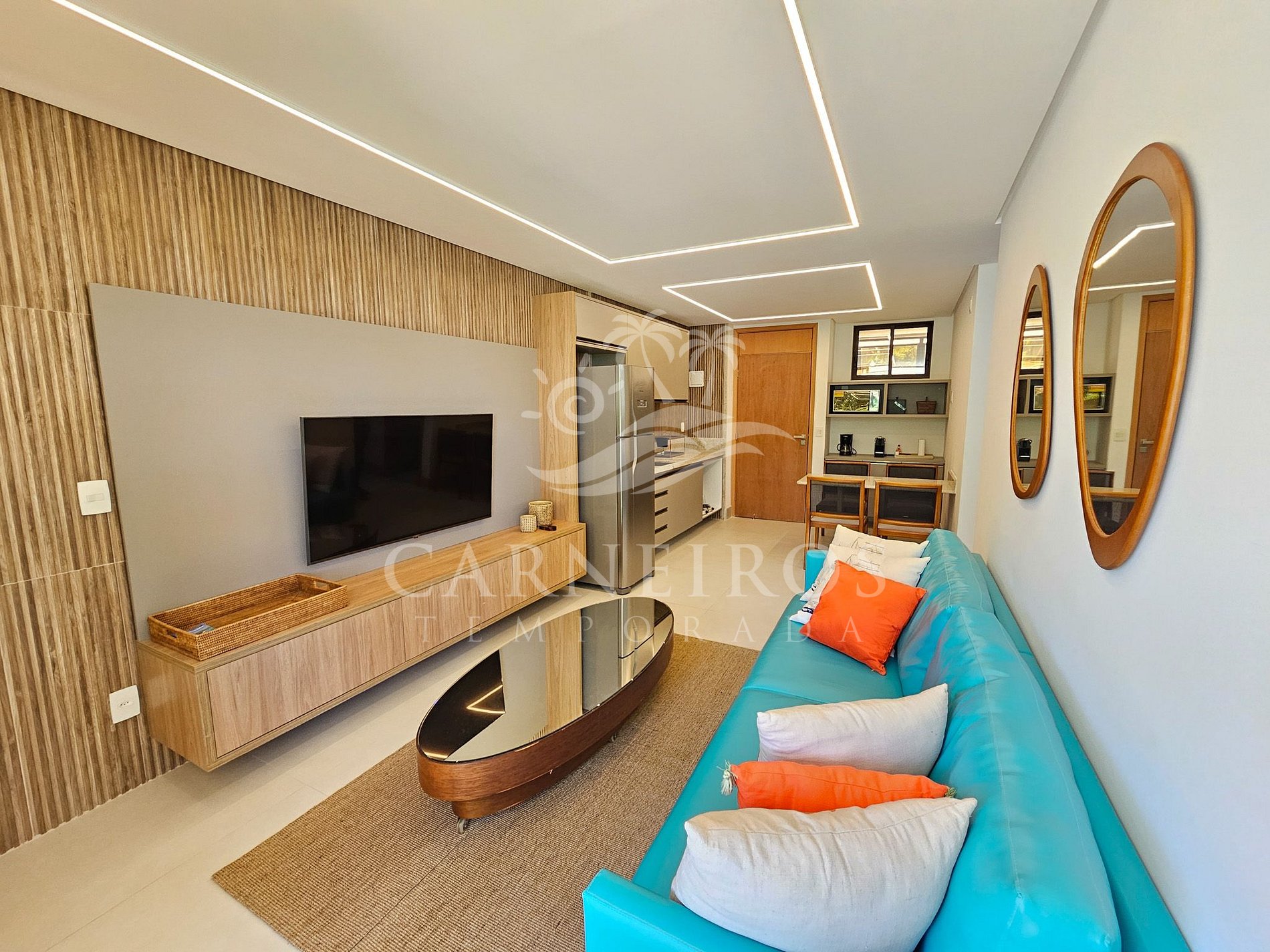A sala, decorada em estilo moderno, possui sofá, TV e ar-condicionado para momentos de conforto. Já a cozinha possui utensílios como louças, panelas, talheres e eletrodomésticos como geladeira, fogão duas bocas elétricos, micro-ondas, air fryer, cafeteira, liquidificador, entre outros. O flat também conta com 02 banheiros completos, sendo 1 suíte.