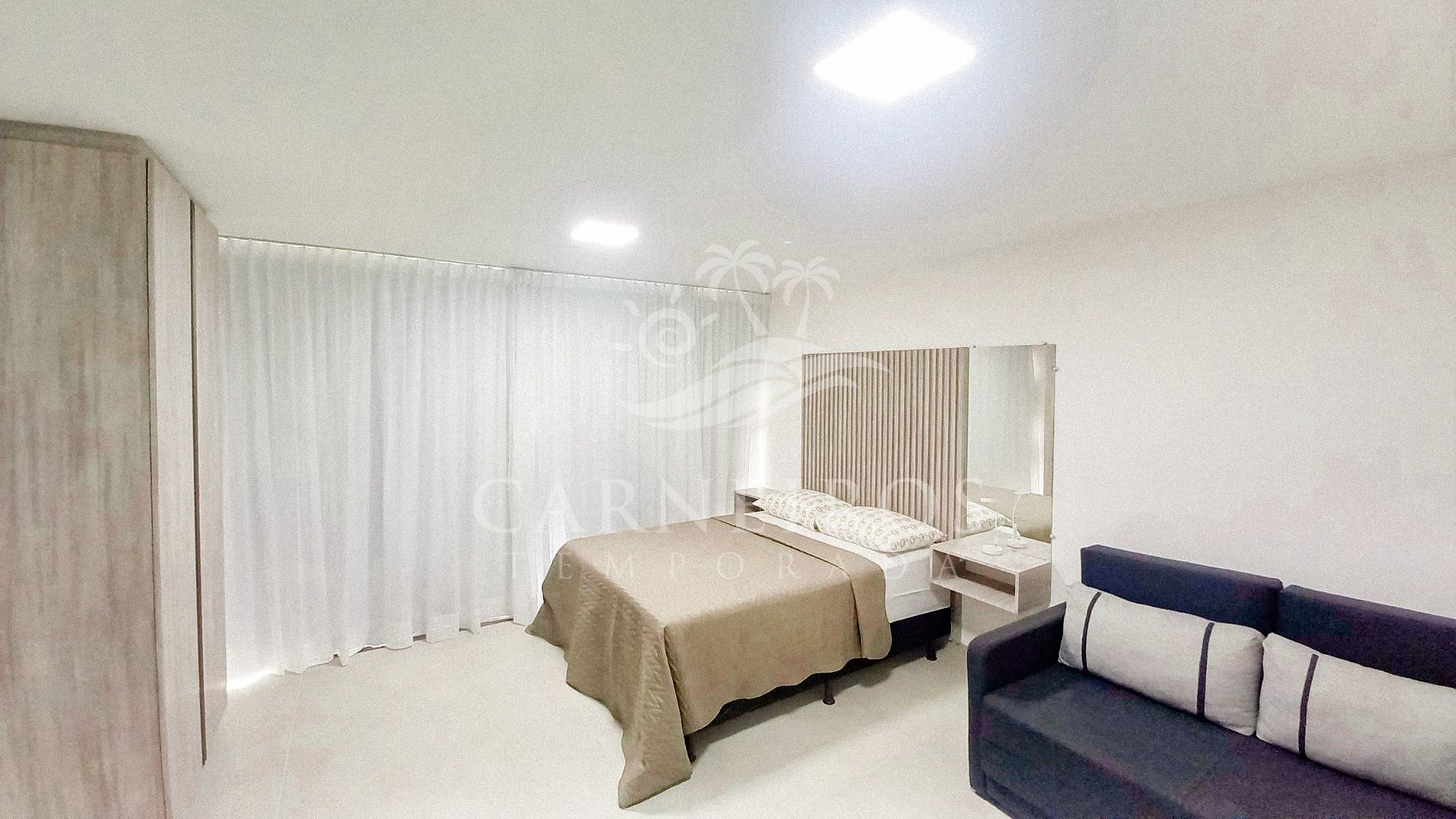 - Ambiente integrado: 1 sofá-cama casal + 1 cama box casal, armário, ar-condicionado e TV.