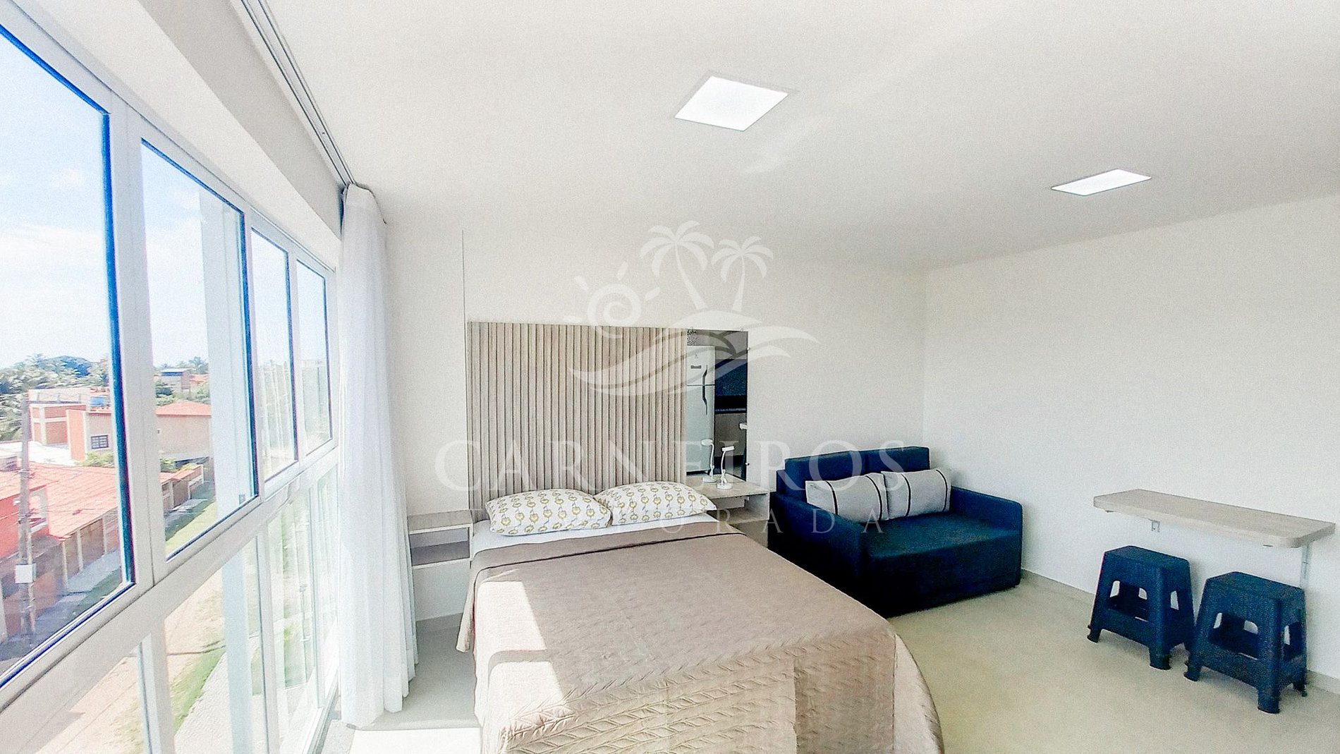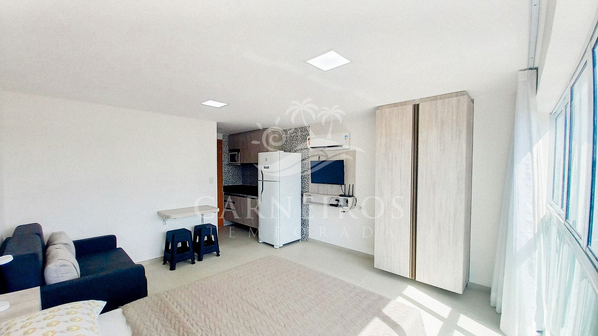 - Ambiente integrado: 1 sofá-cama casal + 1 cama box casal, armário, ar-condicionado e TV.