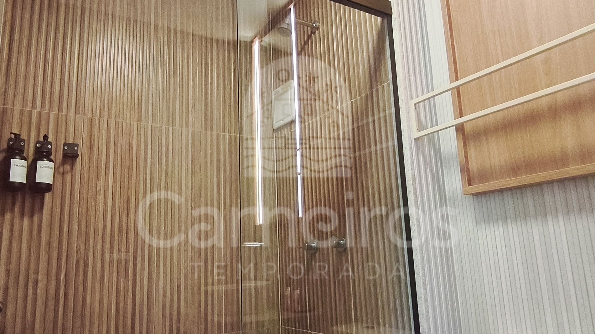 O ambiente integrado conta com sofá-cama, TV, ar-condicionado e cama de casal. A cozinha é equipada com louças, panelas, talheres, geladeira, fogão cooktop 2 bocas, micro-ondas e outros. Além disso, possui espaço para refeições com mesa e duas cadeiras e também um banheiro completo.