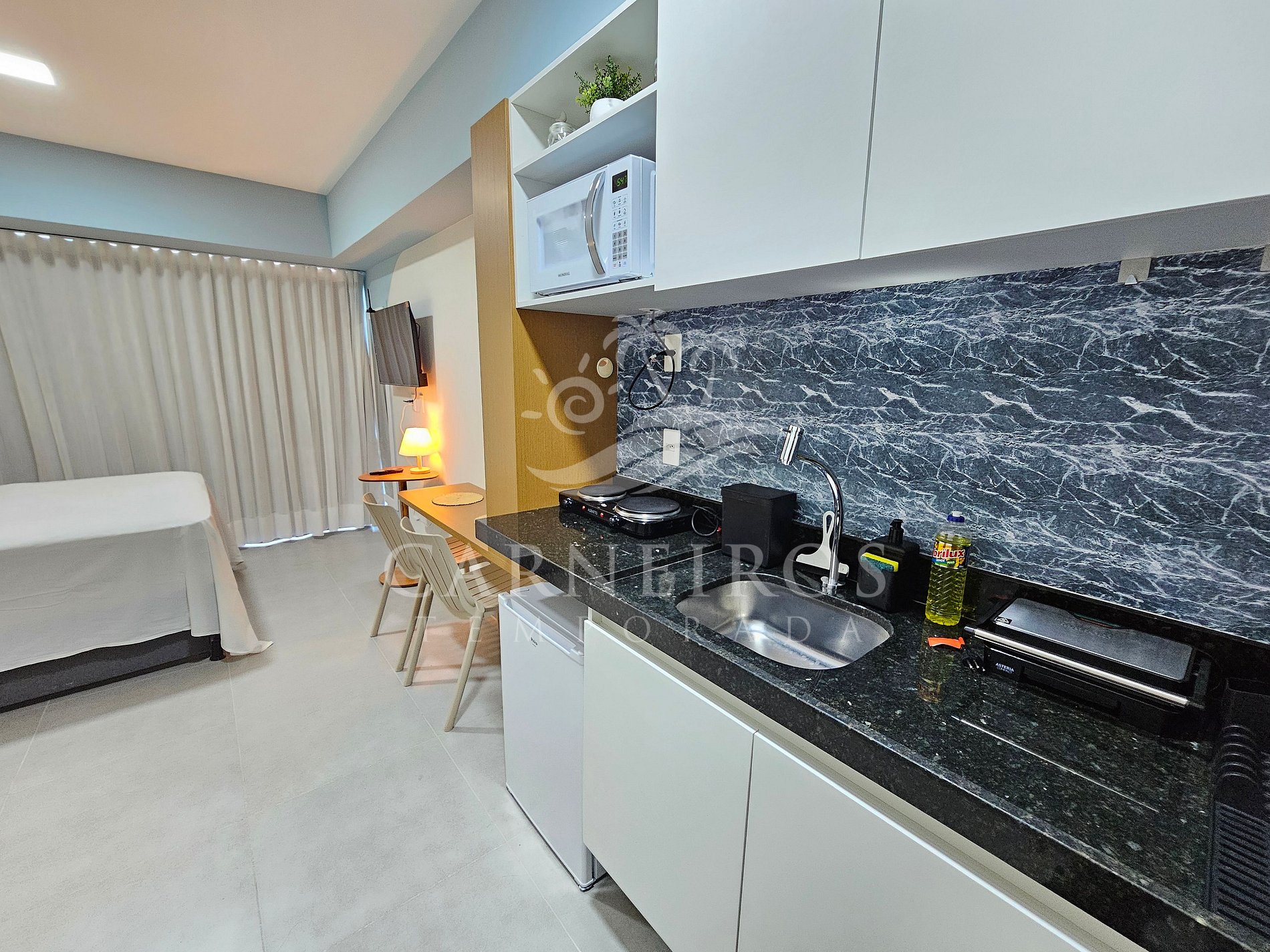 Na sala de estar você encontrará uma decoração agradável com TV possuindo serviço de Streaming, cama de casal e ar-condicionado. A cozinha é completa e compacta e possui itens como louça, panelas, talheres, batedeira, micro-ondas, fogão, frigobar, sanduicheira, air fryer e diversos utensílios. O apartamento possui 01 banheiro completo com secador de cabelo.