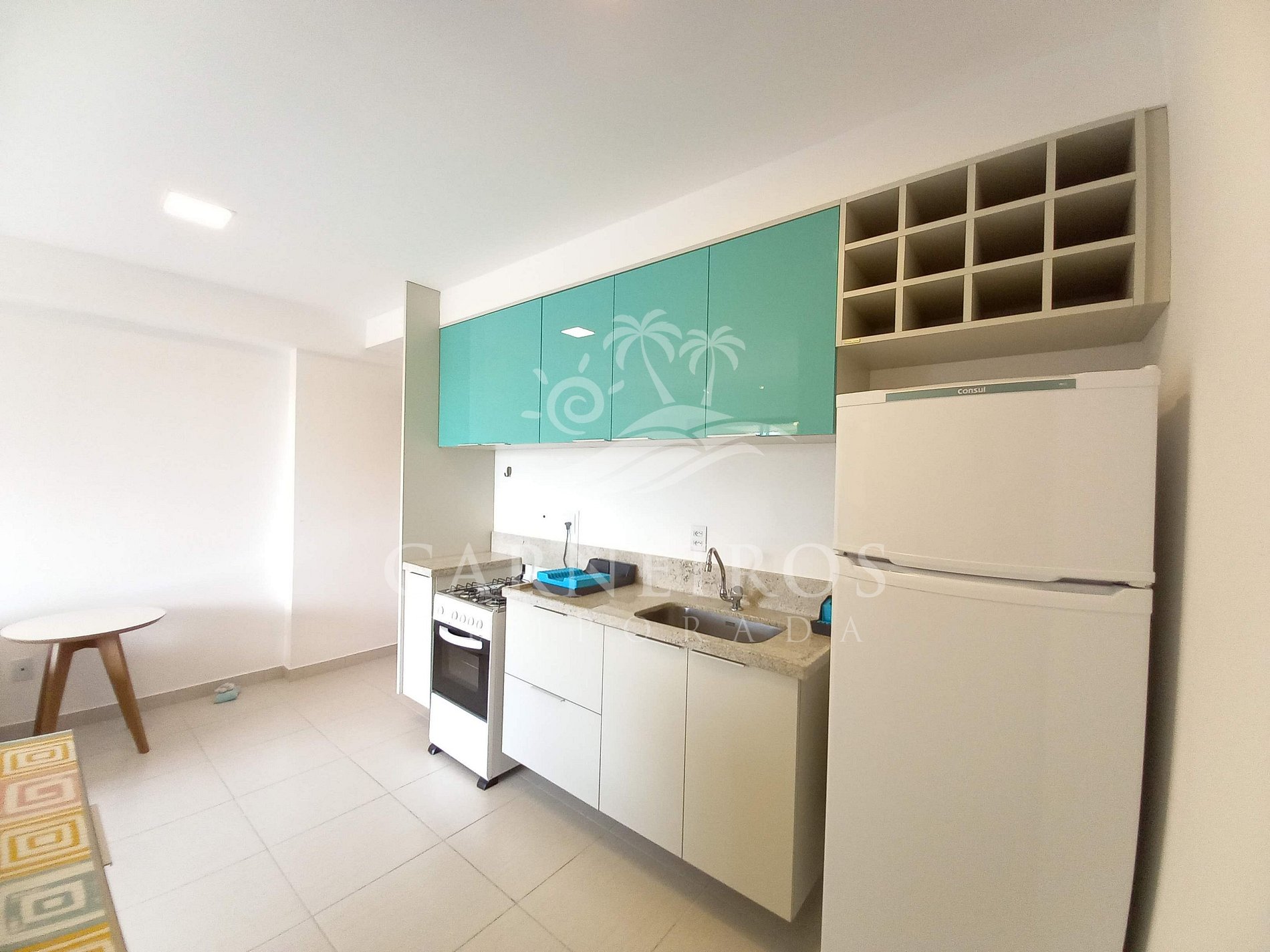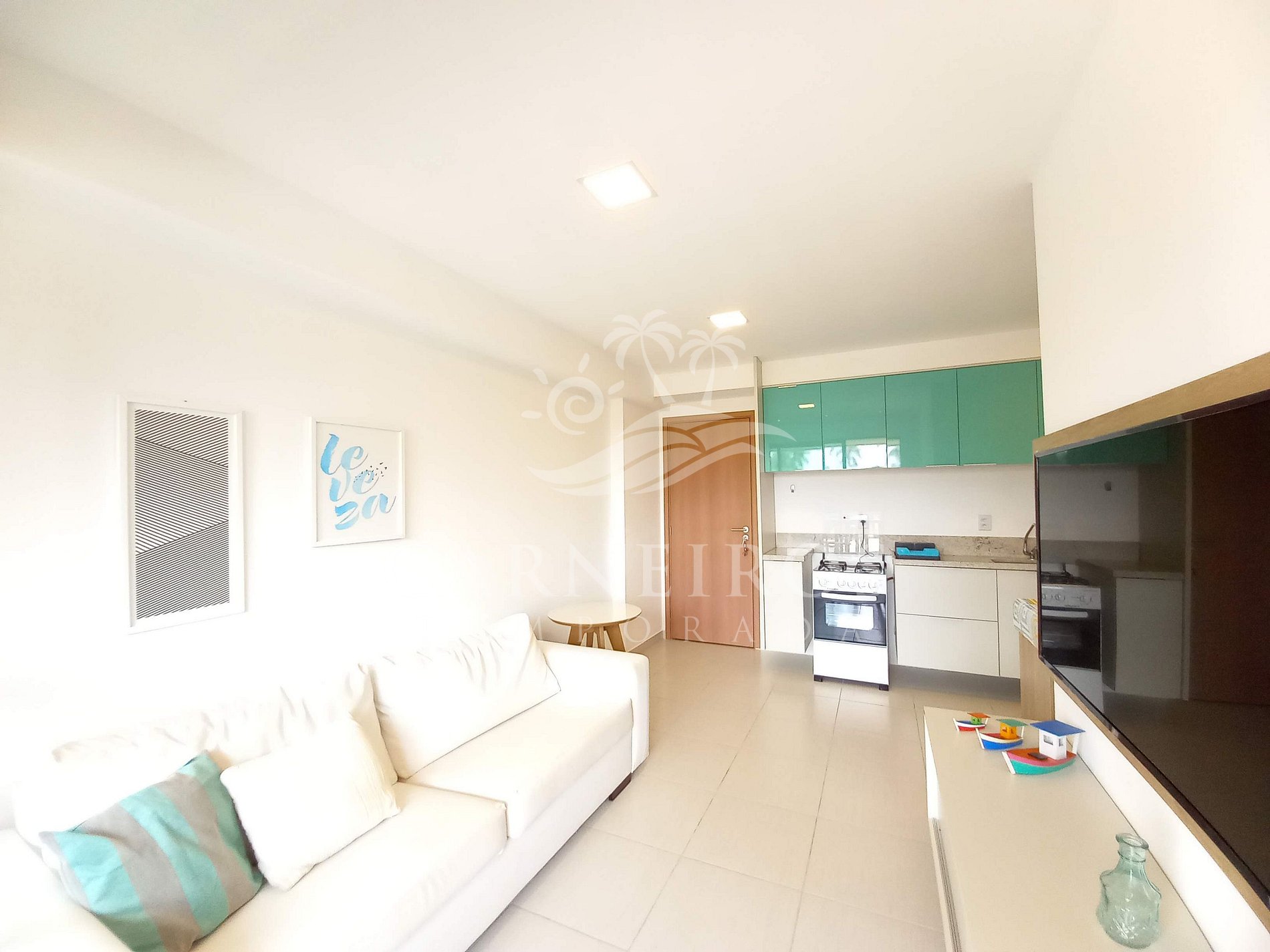 A sala de estar possui uma linda decoração minimalista que conta com uma TV com serviço de streaming e sofá. A cozinha é completa e equipada com os principais utensílios como geladeira, micro-ondas, fogão de 04 bocas, forno, liquidificador, sanduicheira, torradeira, cafeteira e outros. Possui também 1 banheiro social completo com box, ducha higiênica e chuveiro, além do banheiro da suíte.