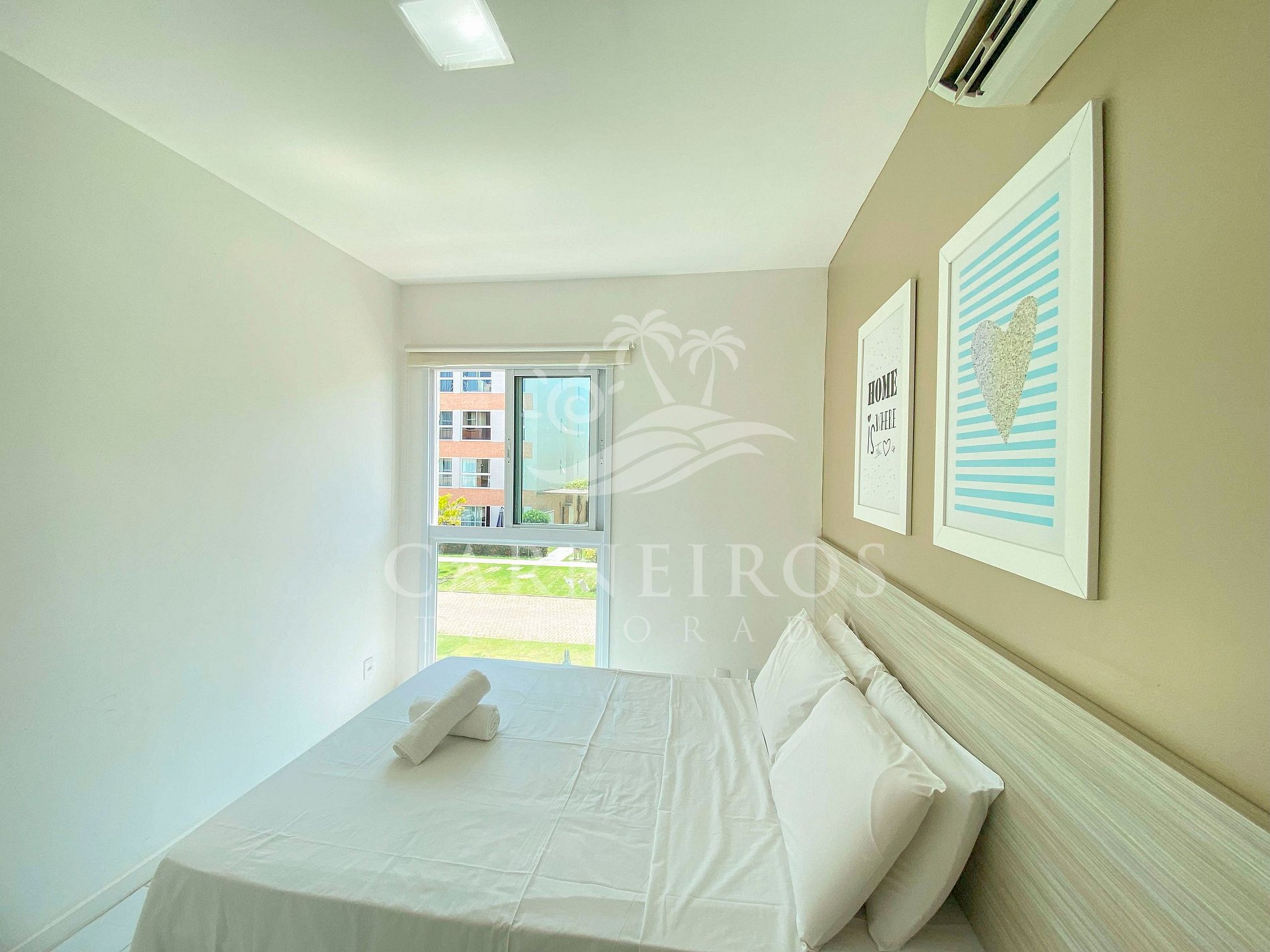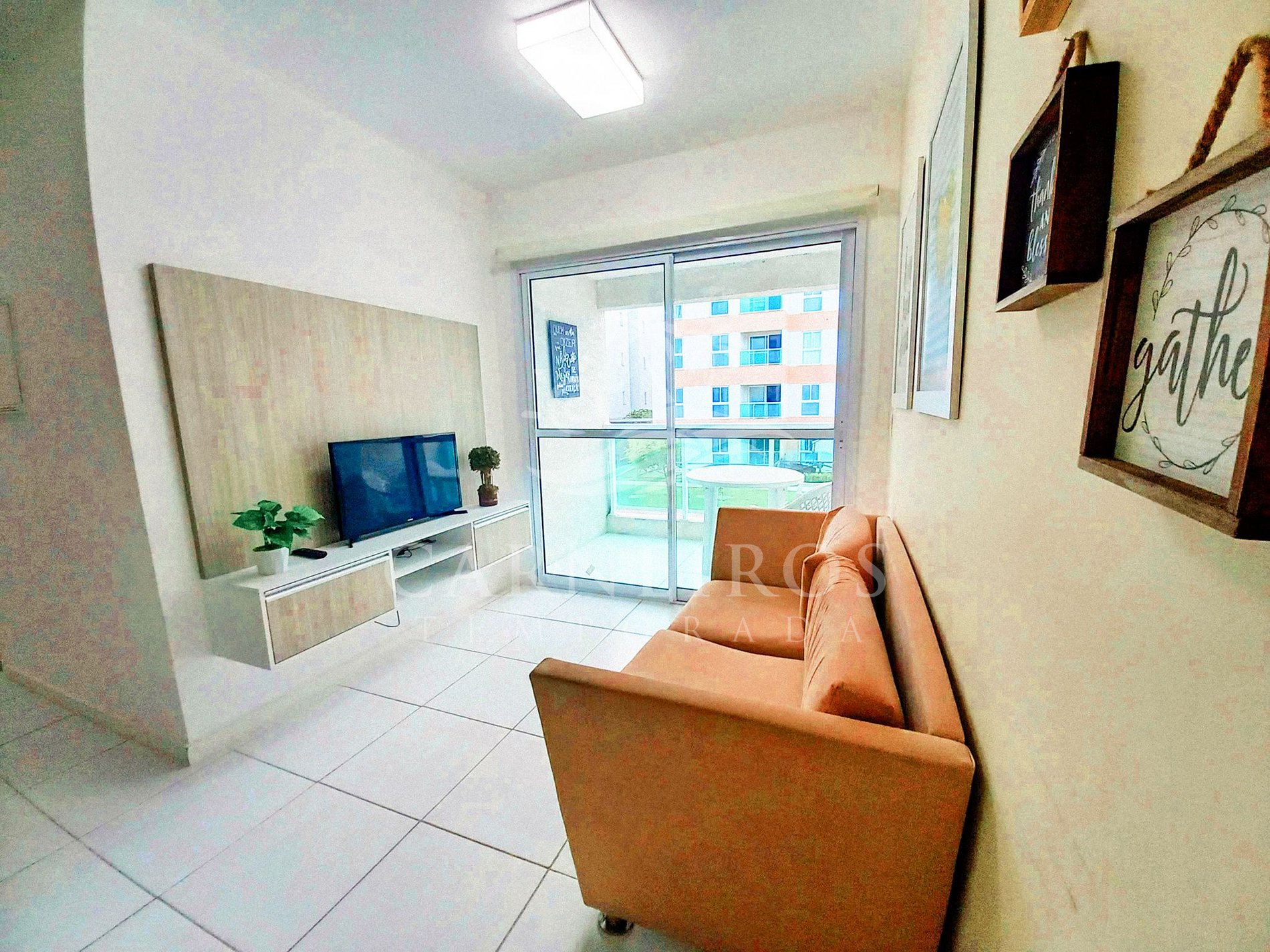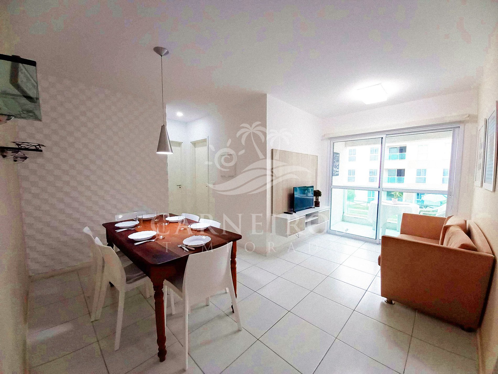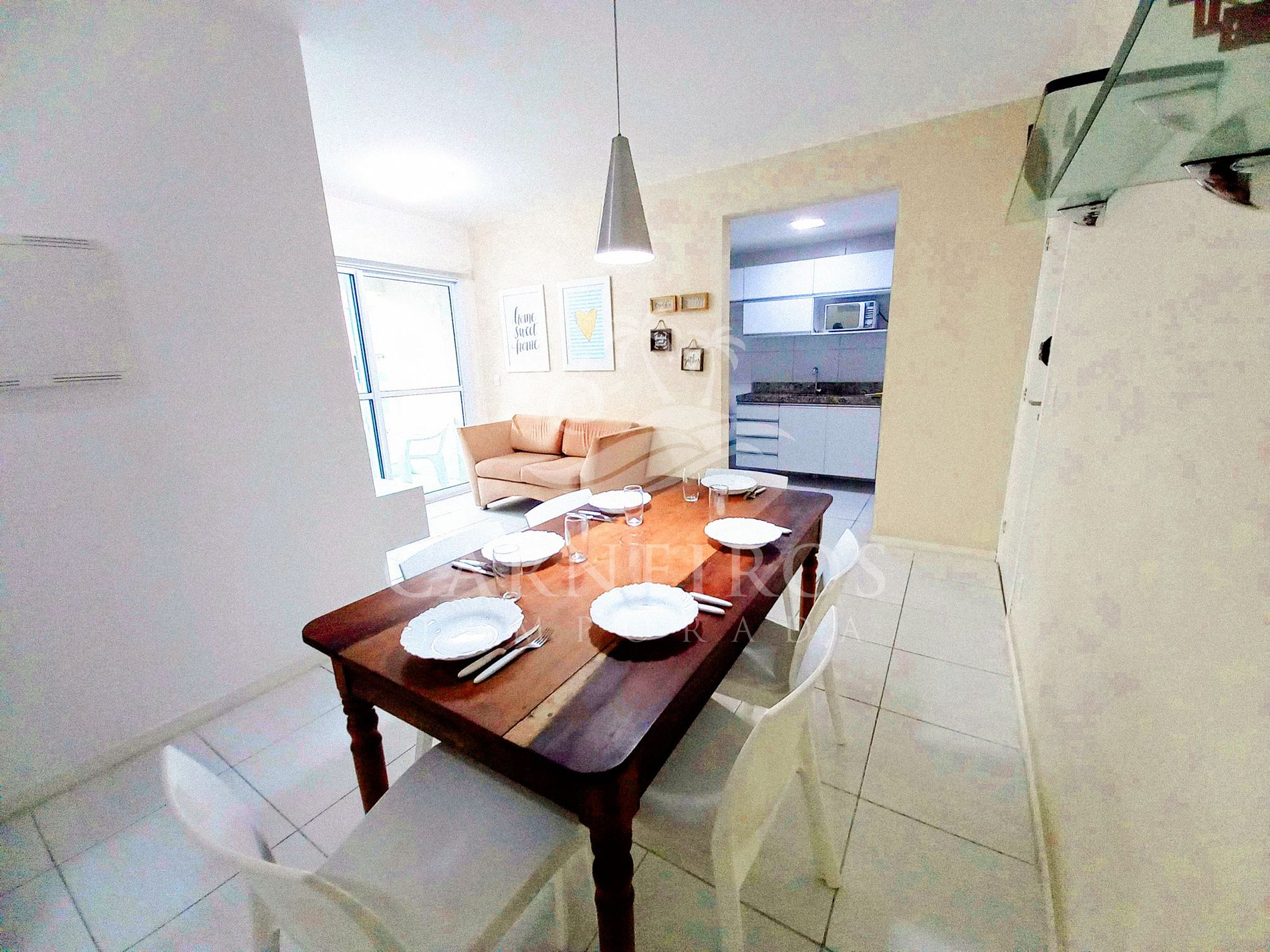 A sala de estar conta com uma decoração minimalista e possui uma TV, sofá e mesa de jantar com 06 cadeiras. A cozinha é completa e equipada com os principais utensílios como louça, copos, panelas, talheres, sanduicheira, liquidificador, micro-ondas, fogão 04 bocas, forno, geladeira e outros. Possui também 2 banheiros com ducha quente os quais atendem às necessidades diárias.