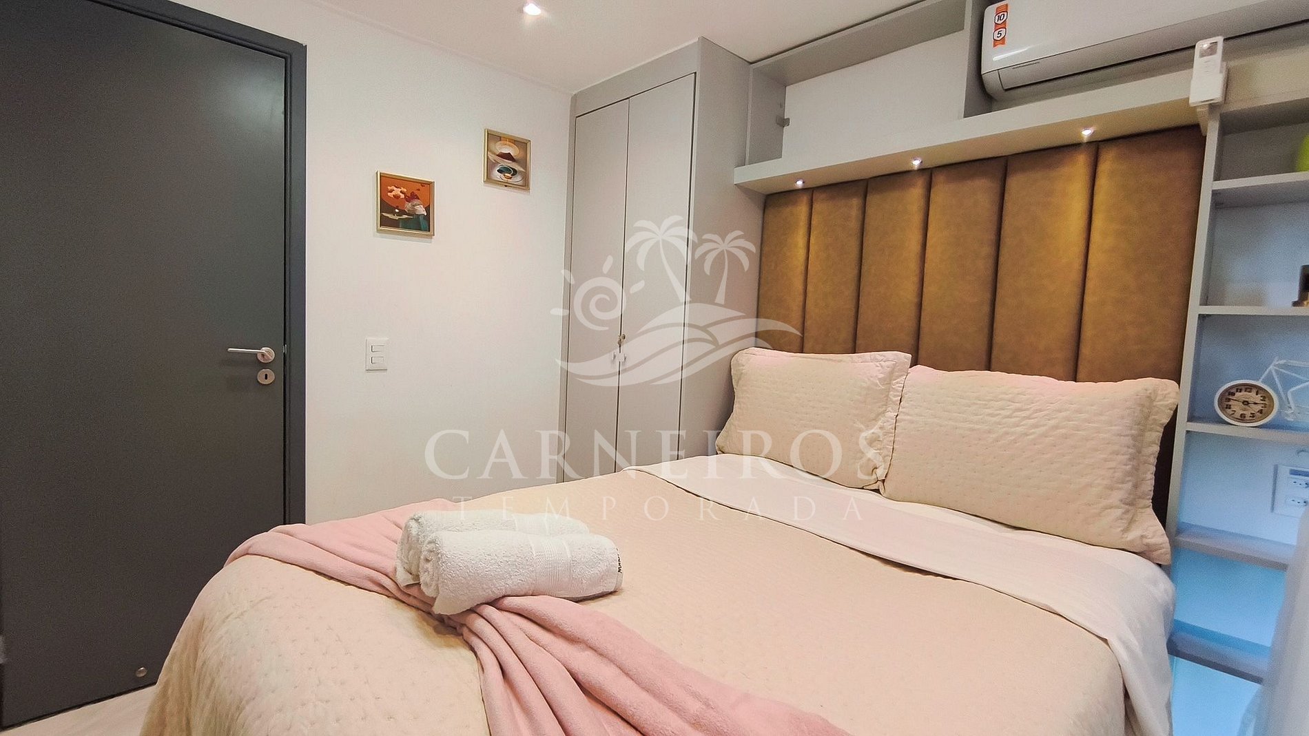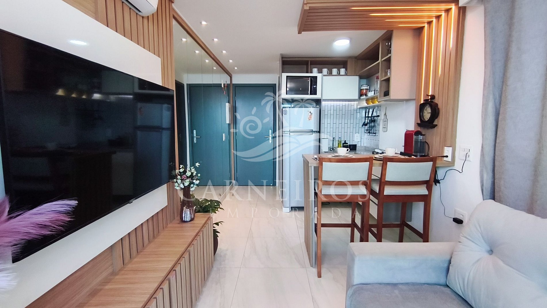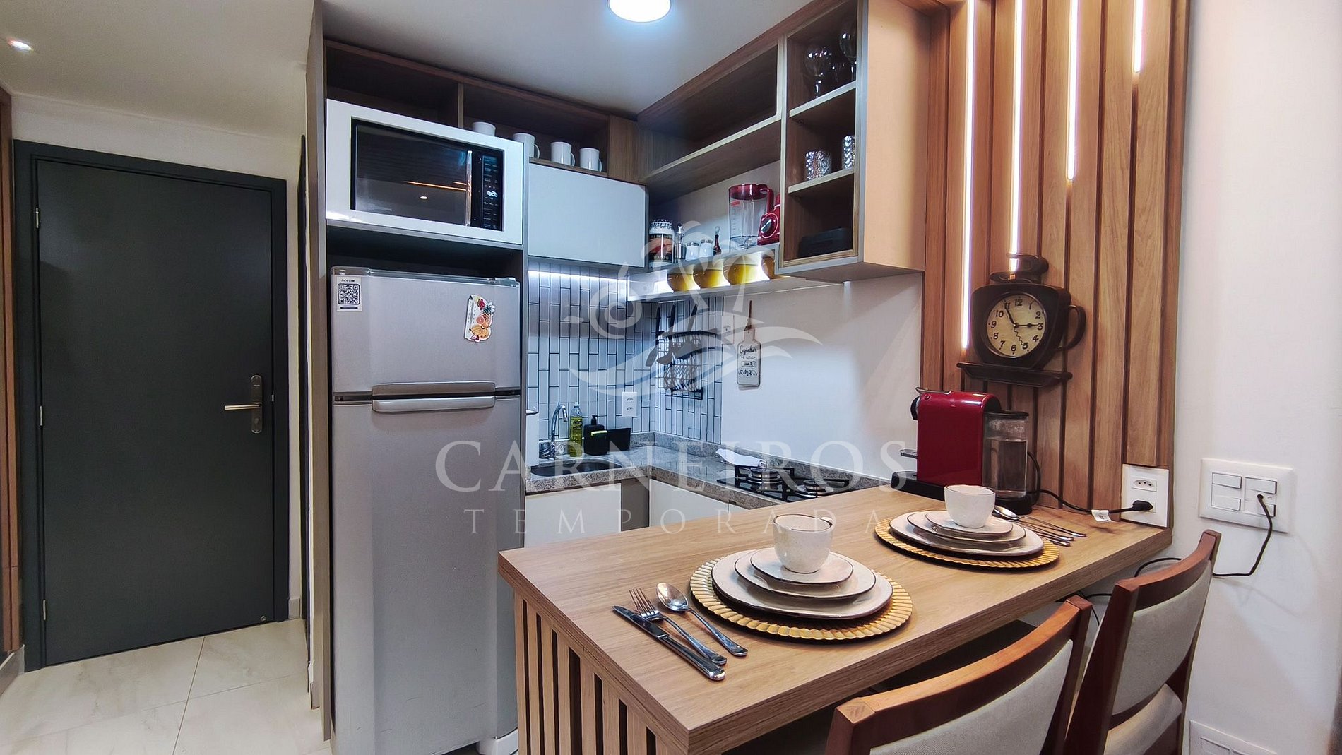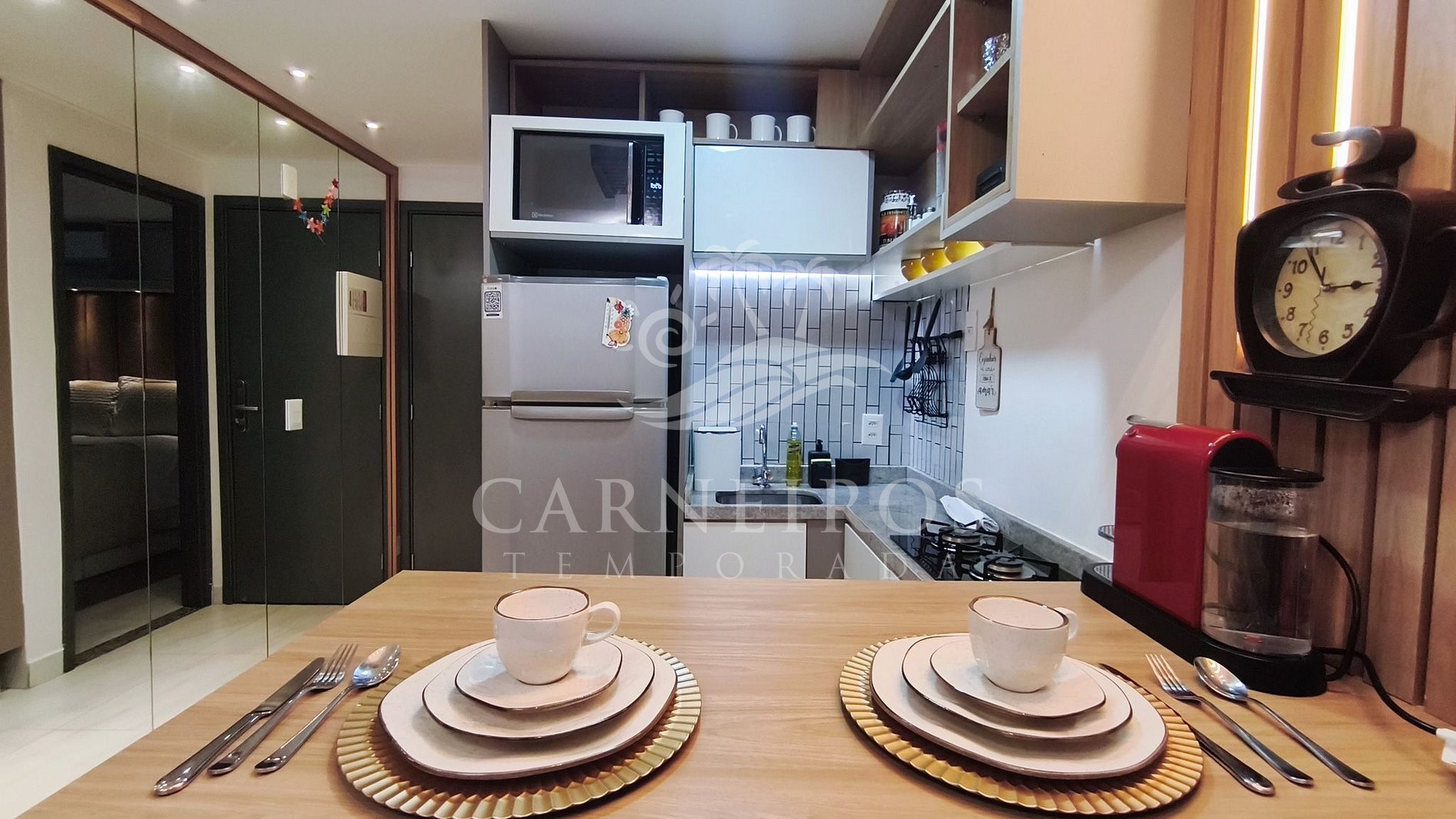 A sala de estar, com uma decoração moderna, conta com um sofá-cama casal, TV e ar-condicionado. A cozinha é completa e equipada com os principais utensílios como louça, copos, panelas, talheres, sanduicheira, liquidificador, micro-ondas, fogão cooktop 2 bocas, cafeteira, geladeira e outros. Possui também 1 banheiro completo.