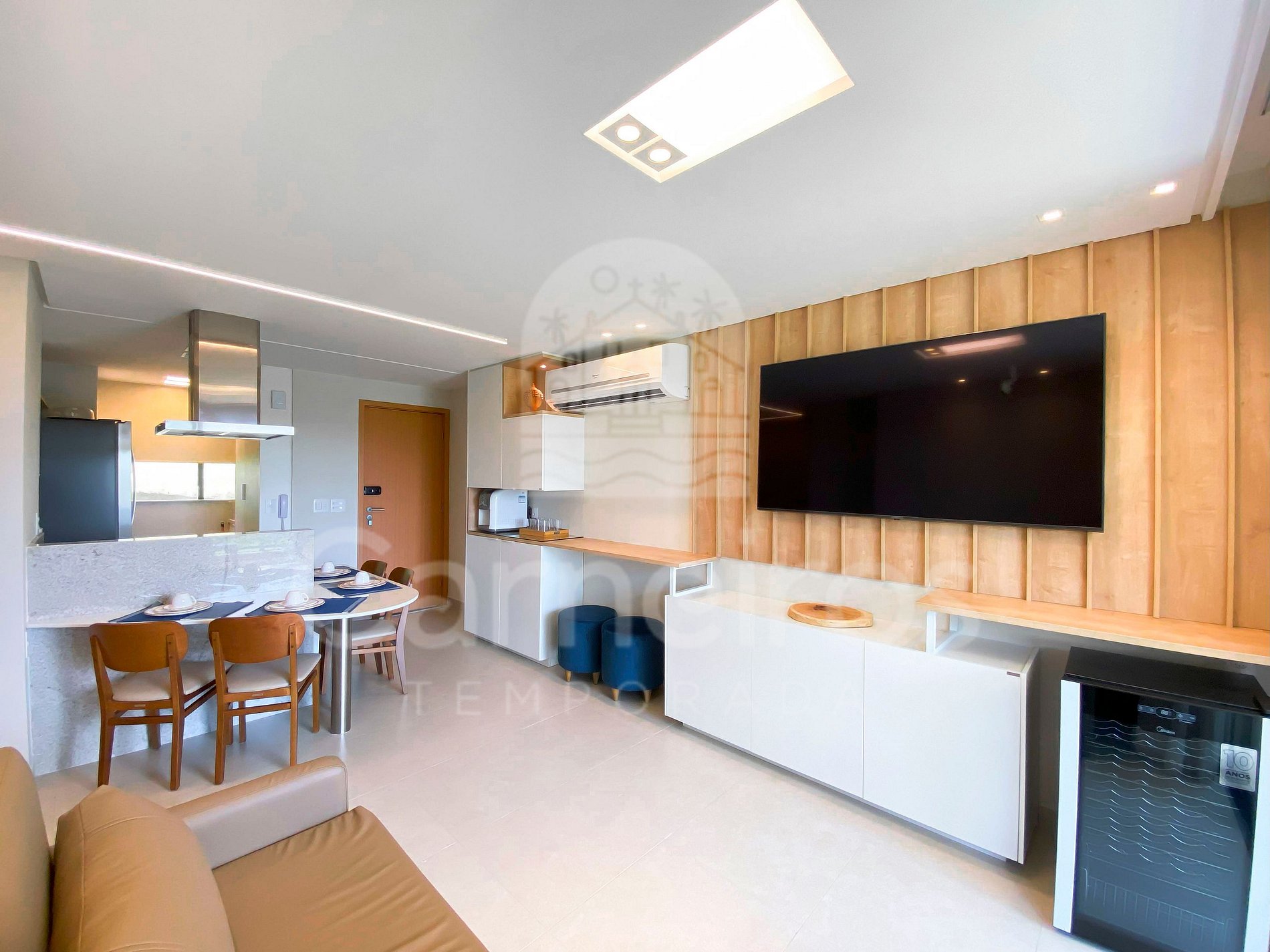 Na sala, o imóvel dispõe de sofá cama de casal, cervejeira, adega, TV com serviço de streaming e ar-condicionado. A cozinha é completa e possui diversos itens como louças, copos, talheres, geladeira, fogão, forno, micro-ondas, liquidificador, sanduicheira, air fryer, cafeteira, bebedouro, botijão de água/purificador e diversos utensílios. O flat possui uma área para refeições com mesa de jantar e quatro cadeiras, além de 2 banheiros completos.