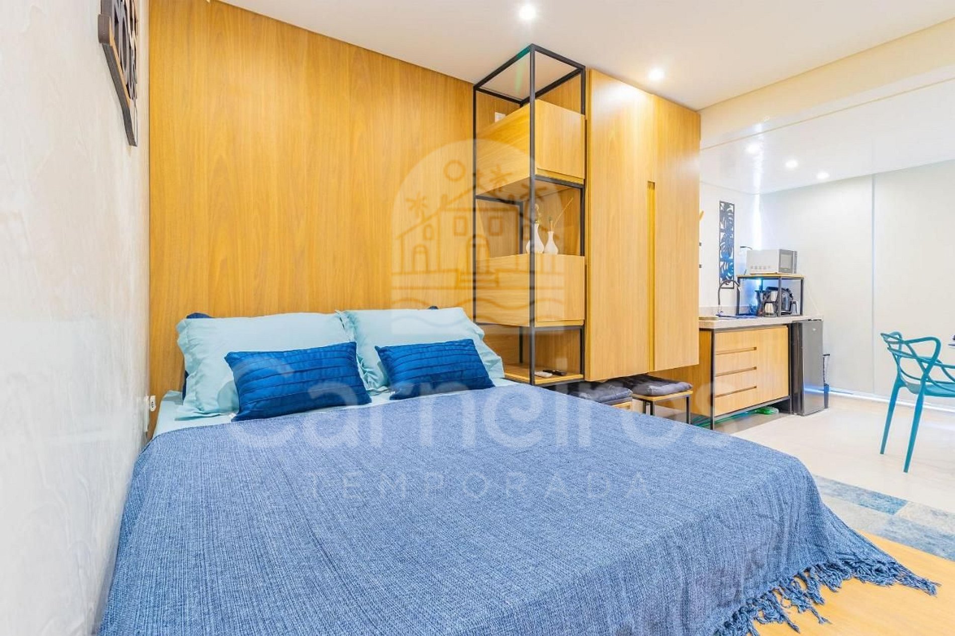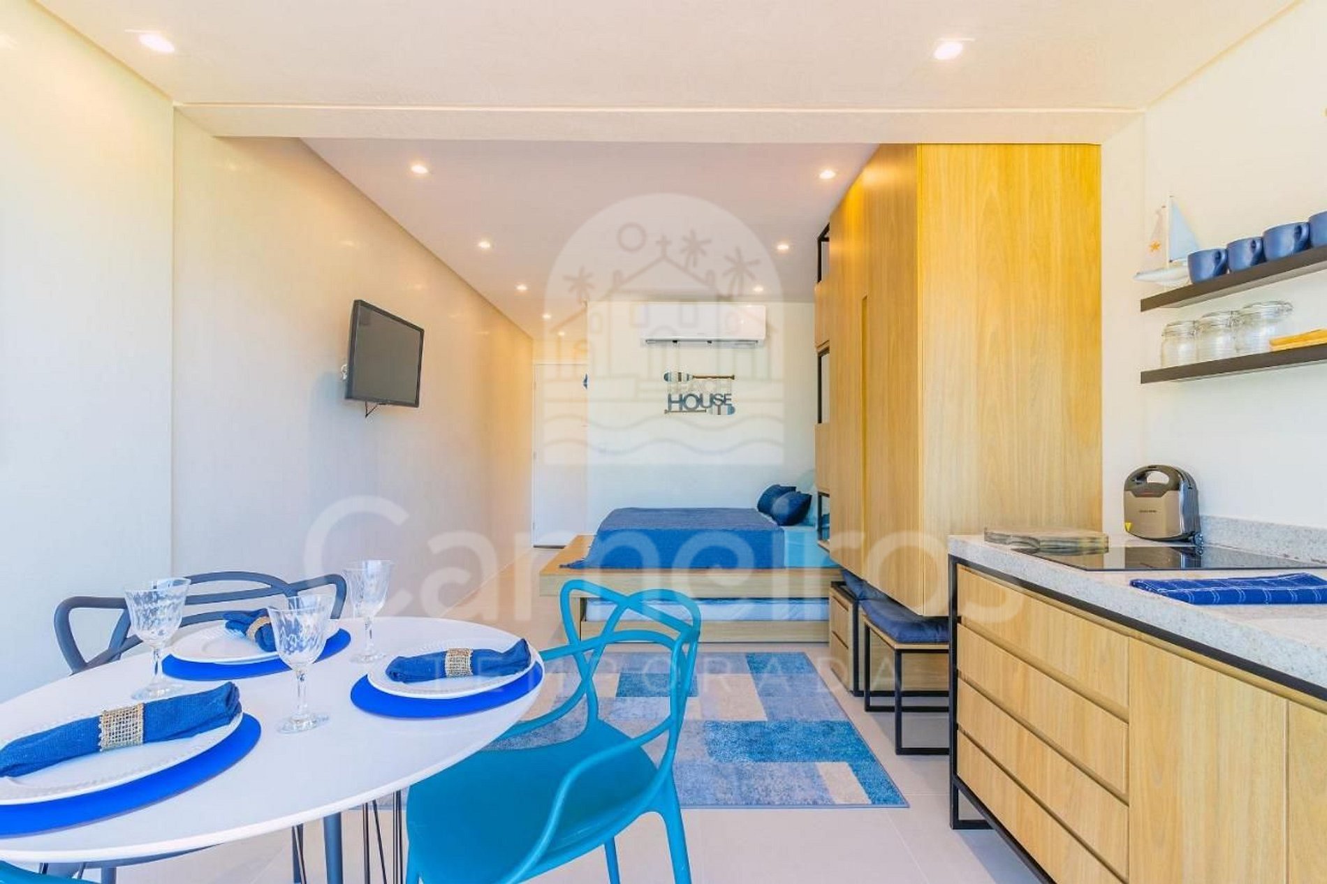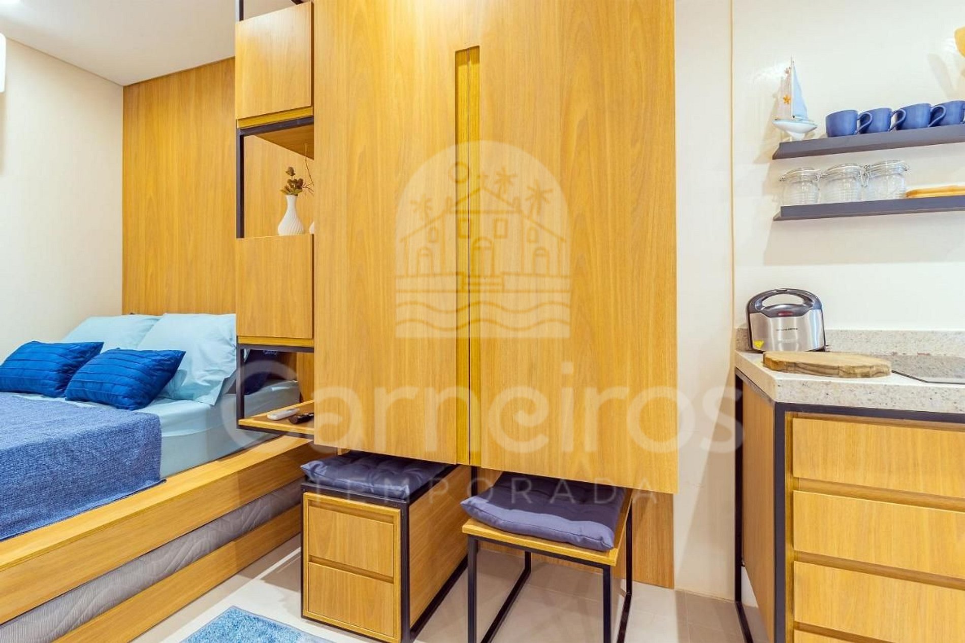 No ambiente integrado você encontrará uma decoração agradável, TV, mesa e cadeiras e ar-condicionado. A cozinha é completa e possui diversas comodidades como louça, copos, panelas, talheres, micro-ondas, fogão cooktop 2 bocas, frigobar, cafeteira, sanduicheira, airfryer e diversos utensílios. O estúdio possui 01 banheiro completo.