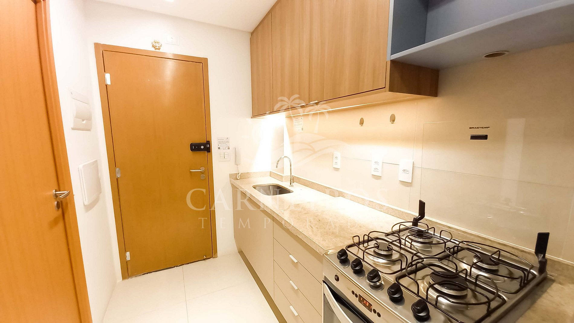 Na sala de estar, além da decoração aconchegante, você encontrará uma TV, sofá-cama e ar-condicionado. A cozinha é completa e possui diversos itens como micro-ondas, fogão 04 bocas com forno, geladeira, sanduicheira e diversos utensílios. Há também uma área para refeições com quatro cadeiras. O flat possui 1 banheiro completo.