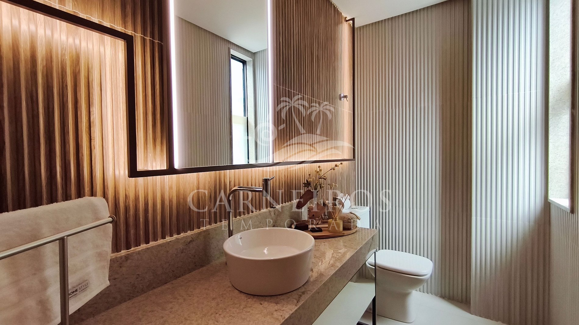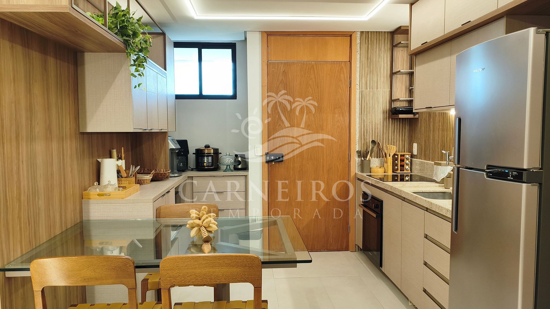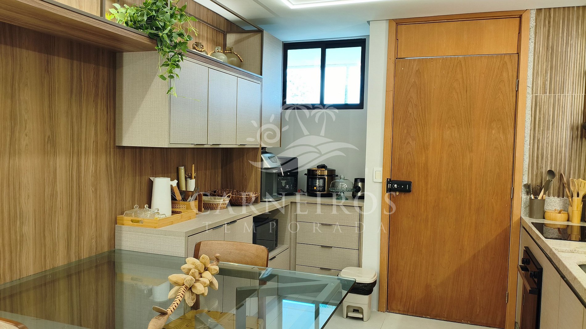 O imóvel oferece duas salas com um design moderno e um ambiente aconchegante. A cozinha é completa com louças, panelas, talheres, geladeira, fogão, forno, sanduicheira, micro-ondas, cafeteira, liquidificador e outros. Para maior comodidade, o imóvel conta 3 banheiros e 1 lavabo.