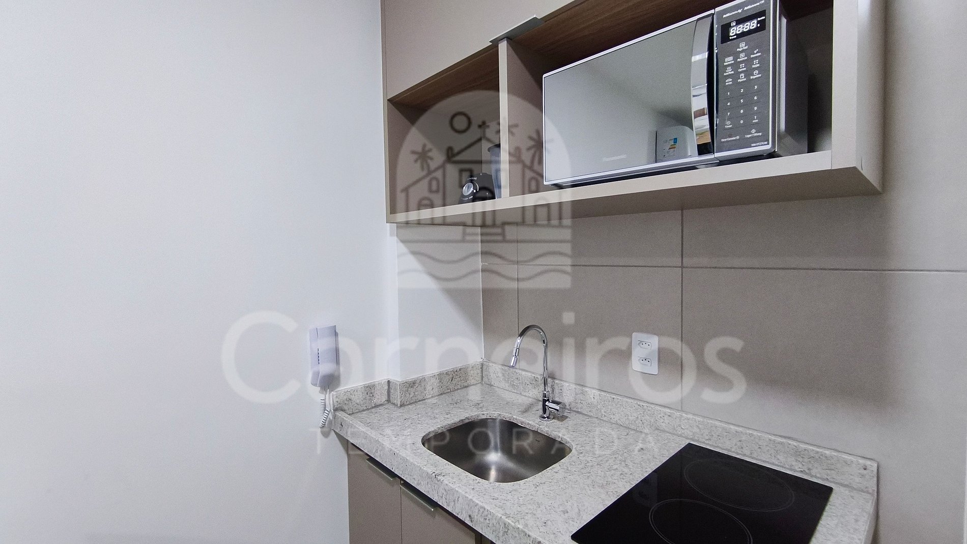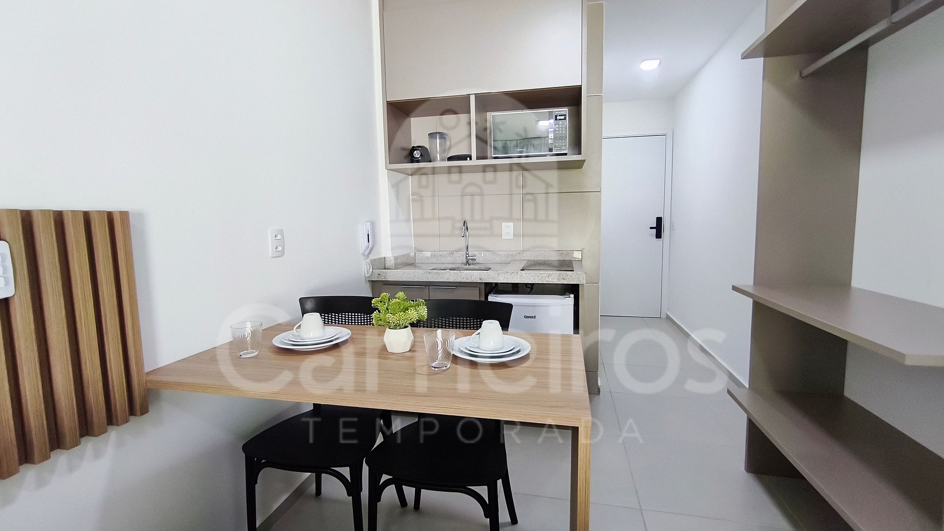 O Studio contém uma TV, ar-condicionado e cama. A cozinha é equipada com os principais itens como louça, copos, talheres, fogão cooktop 2 bocas, micro-ondas, liquidificador e frigobar. A acomodação possui 01 banheiro completo.
