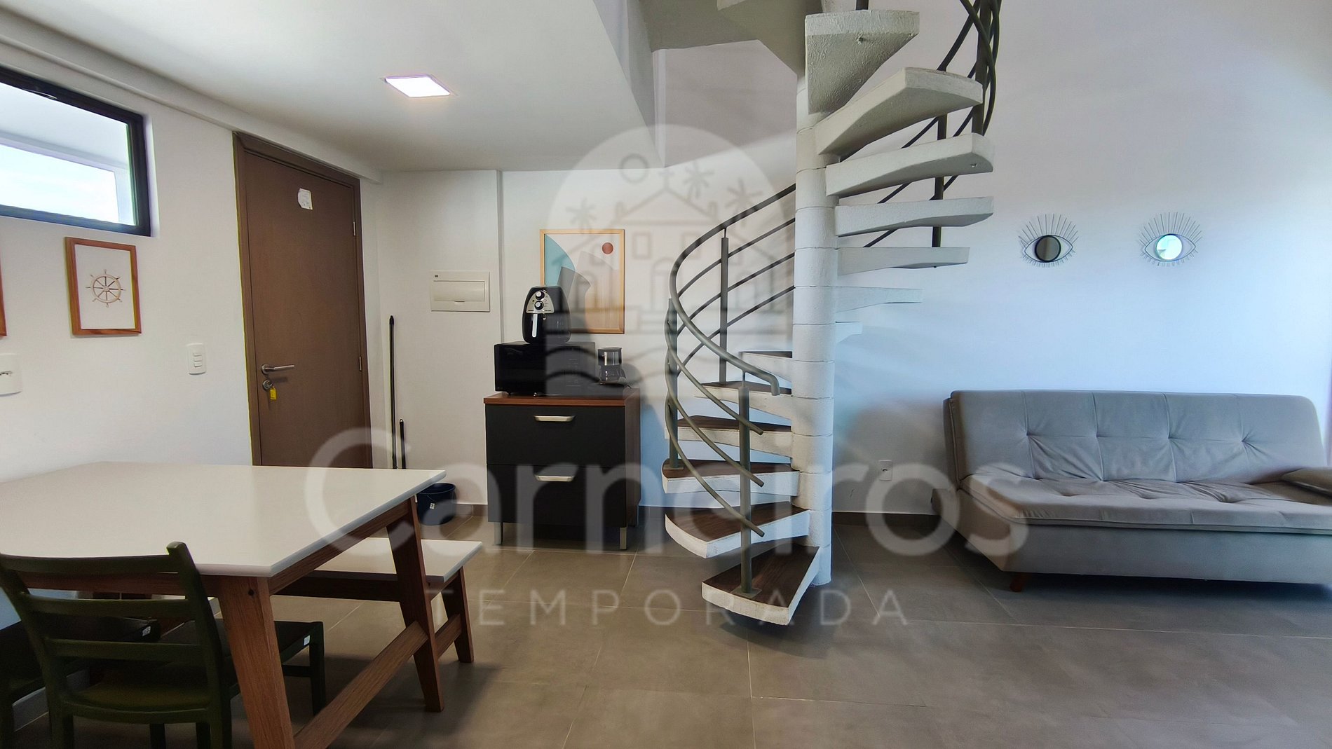 A sala de estar conta com decoração agradável e possui TV, sofá-cama de casal e ar-condicionado. A cozinha é equipada com os principais utensílios como louça, copos, panelas, talheres, micro-ondas, fogão cooktop 2 bocas, geladeira, airfryer e diversos utensílios. O flat possui 2 banheiros completos.