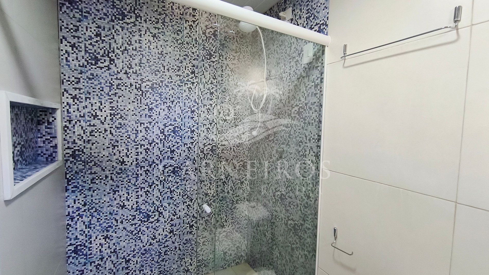 A sala possui uma decoração agradável com sofá e TV. A cozinha é completa e equipada com os principais itens como louça, copos, panelas, talheres, geladeira, micro-ondas, fogão, forno, liquidificador, airfryer e outros. O flat possui 04 banheiros completos.