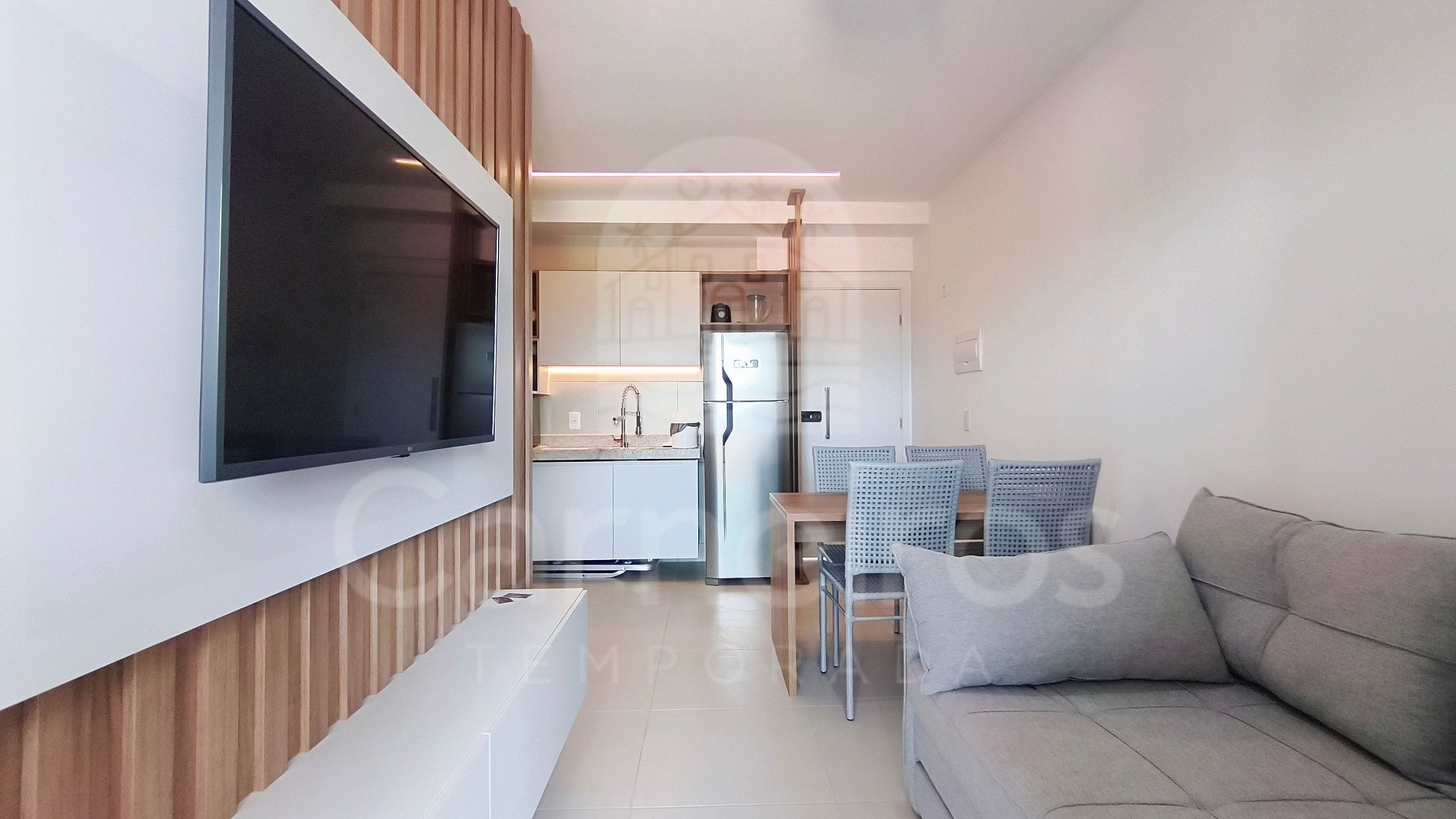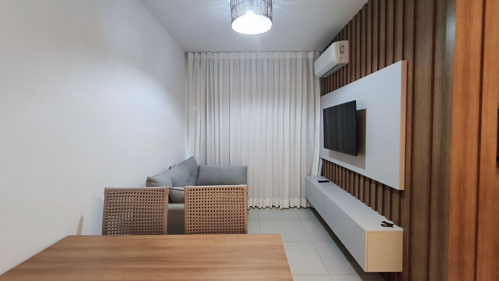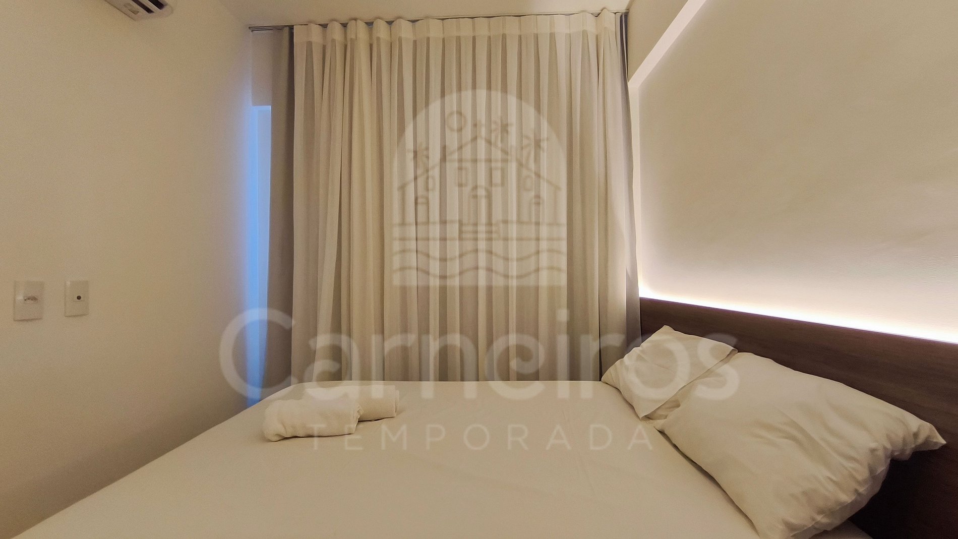 - Sala: Sofá-cama casal, ar-condicionado, ventilador de teto e TV;