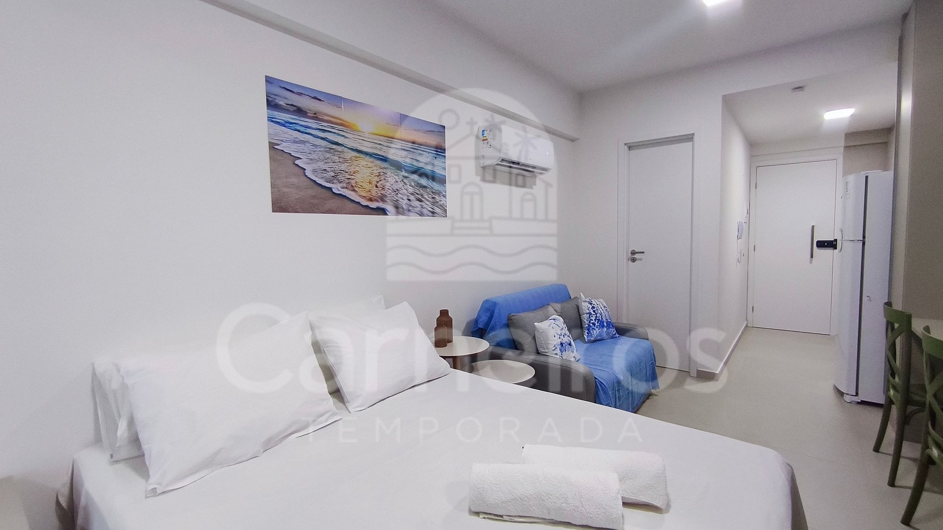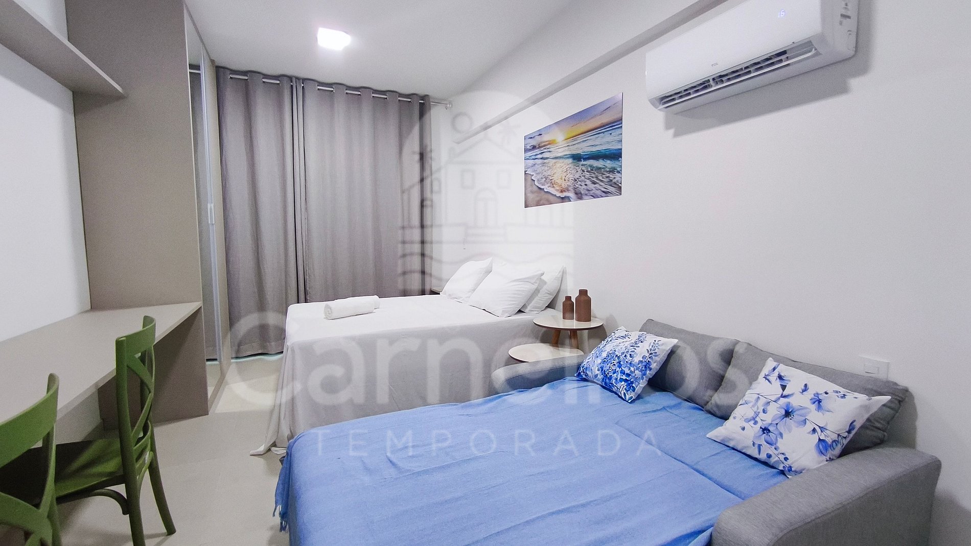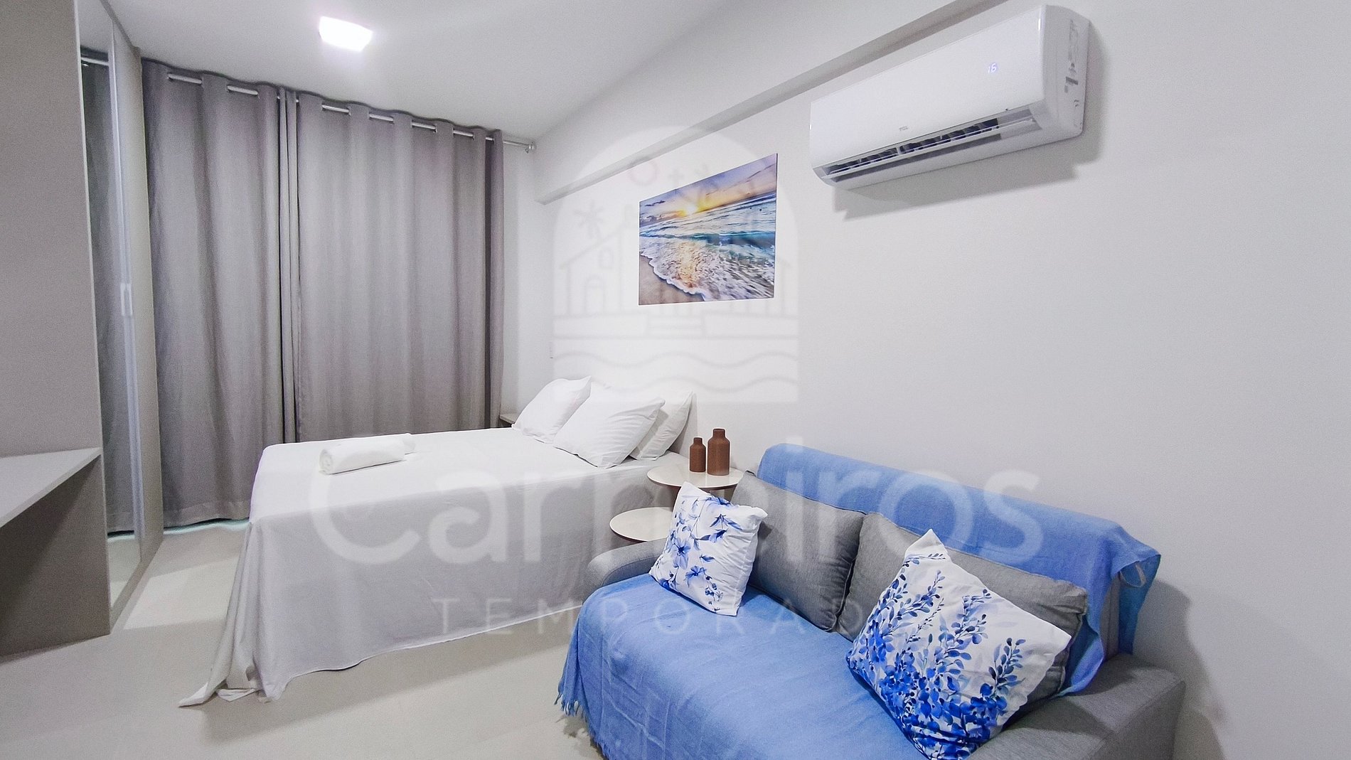 - Studio: 1 cama casal + 01 Sofá-cama casal, TV e ar-condicionado;