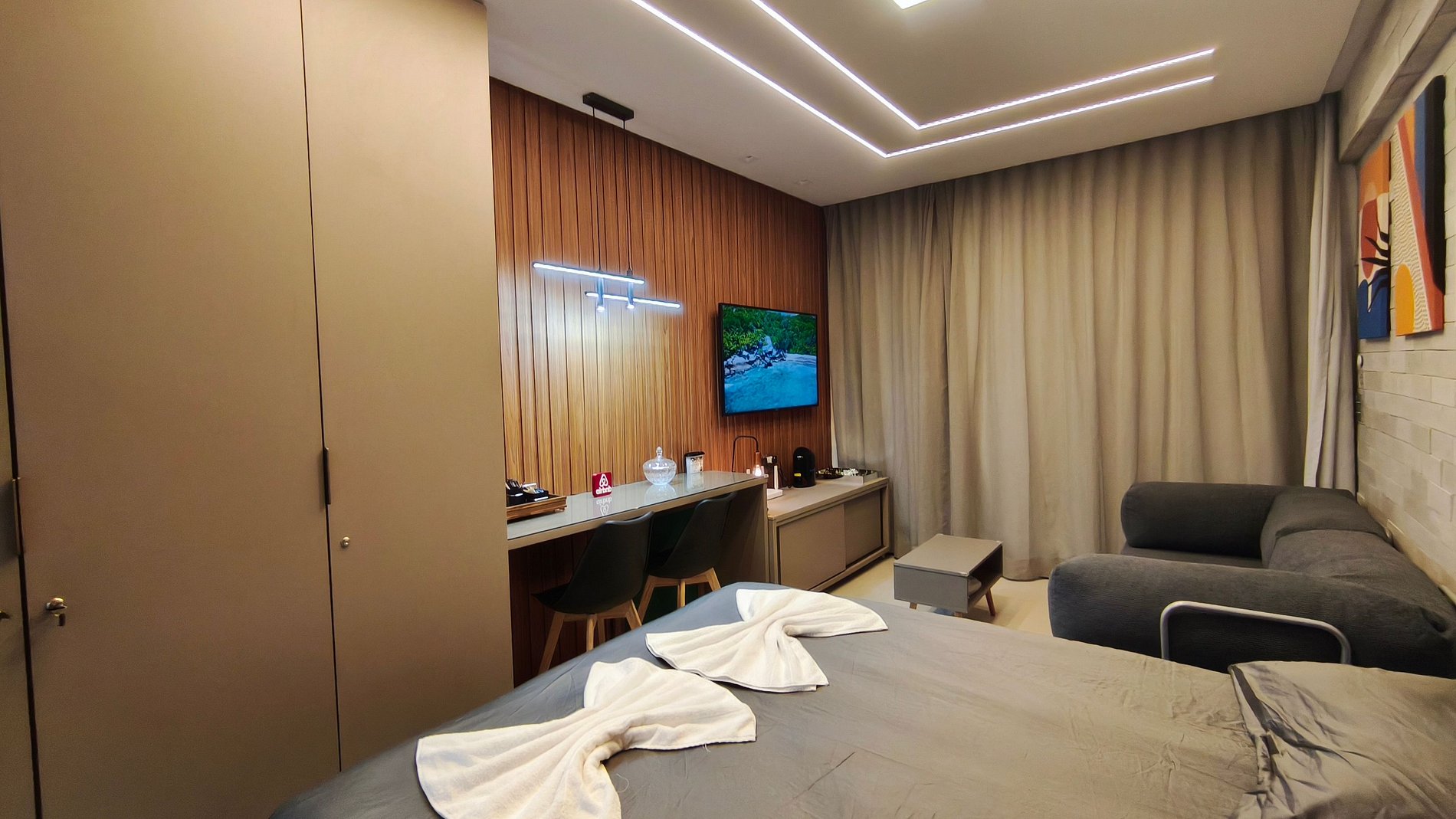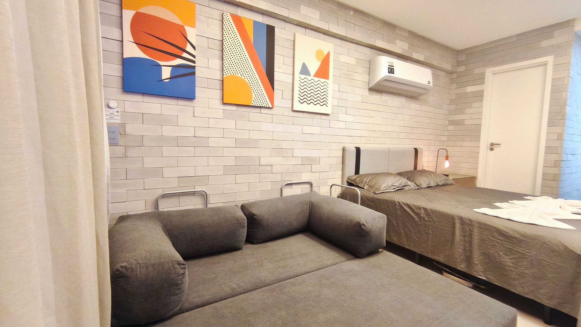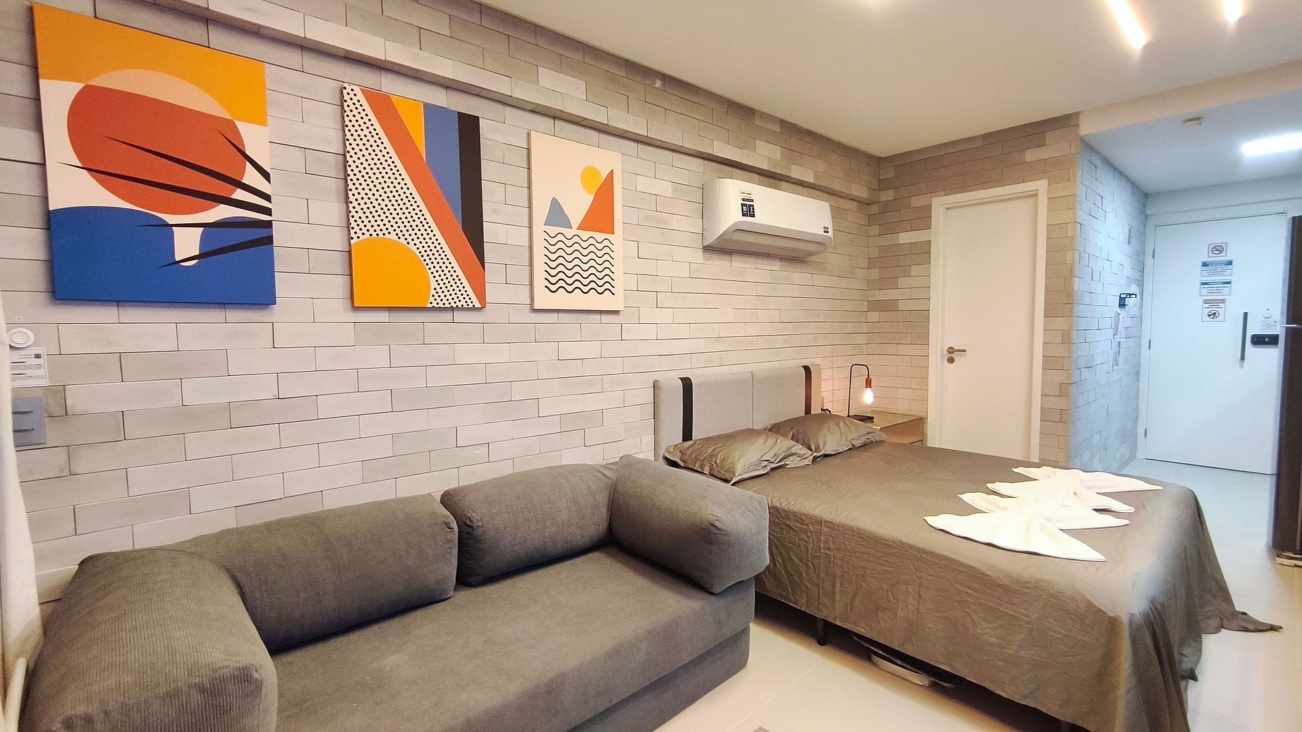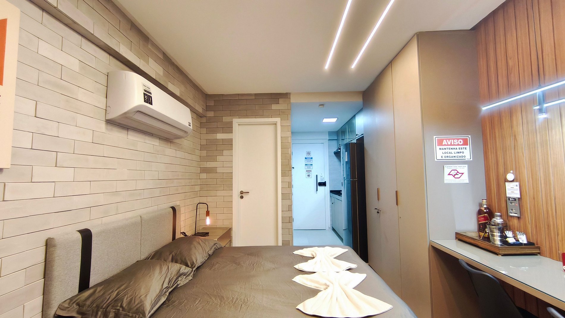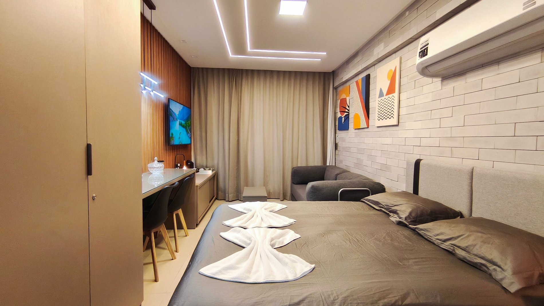 - Studio: 1 cama queen + 01 Sofá-cama casal, TV e ar-condicionado;