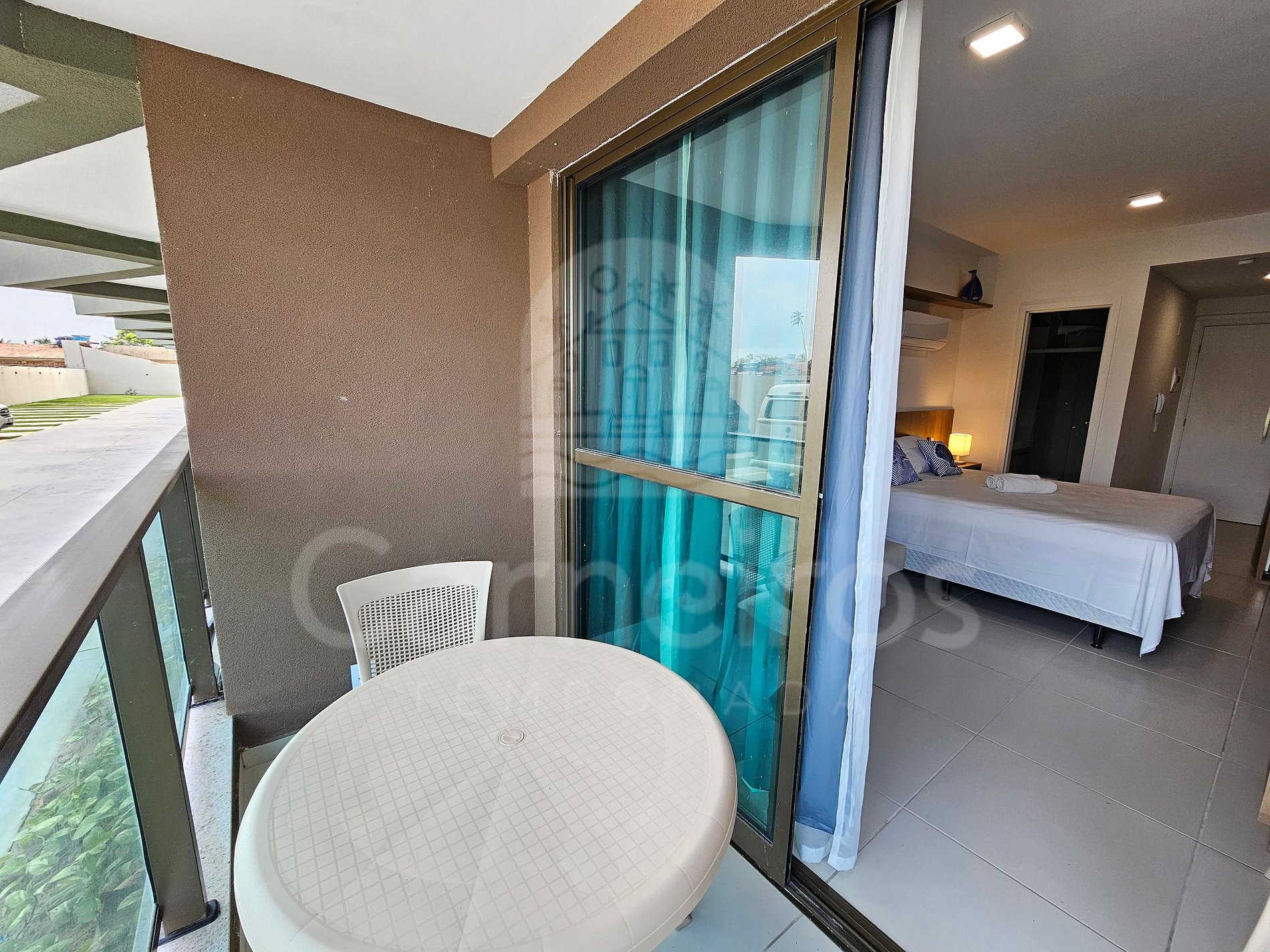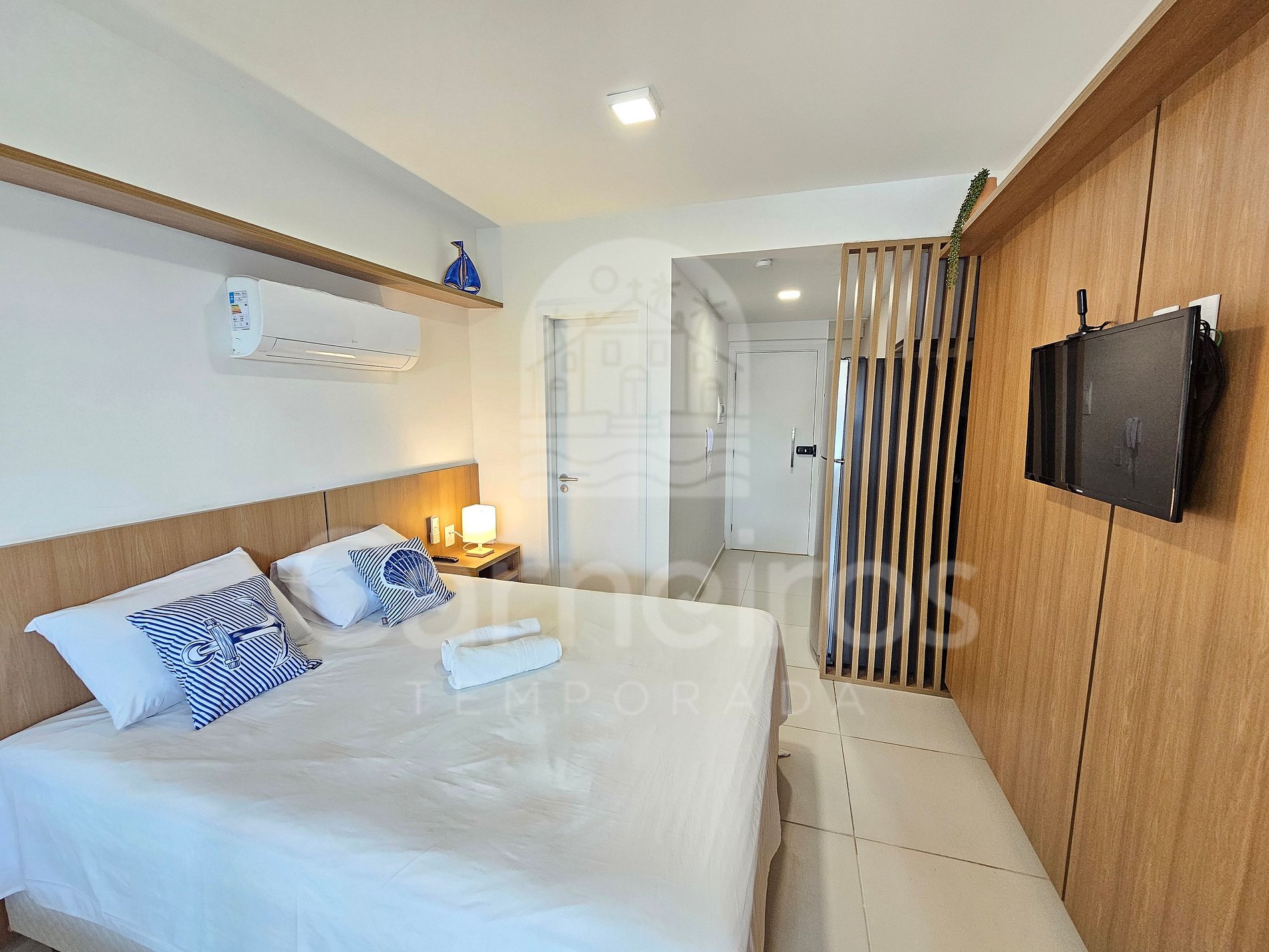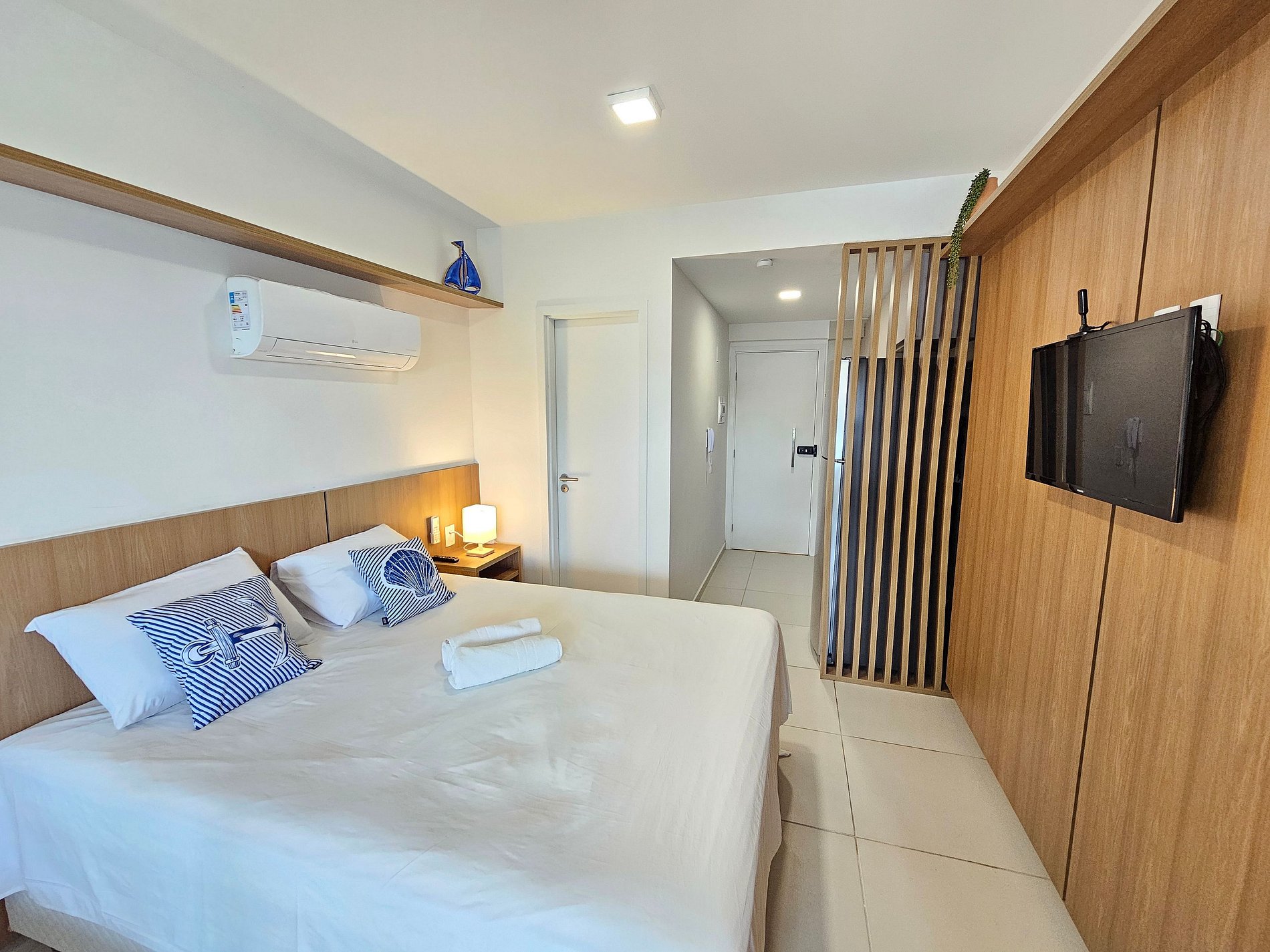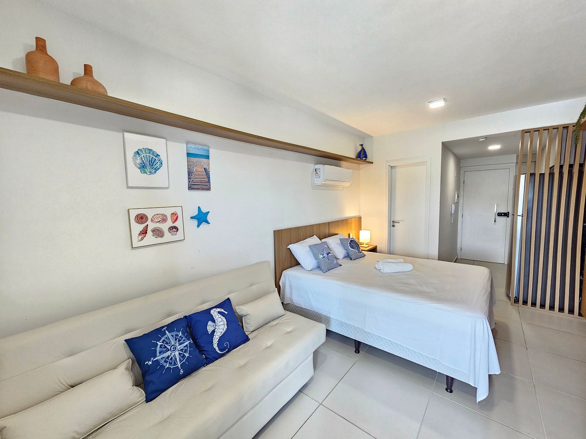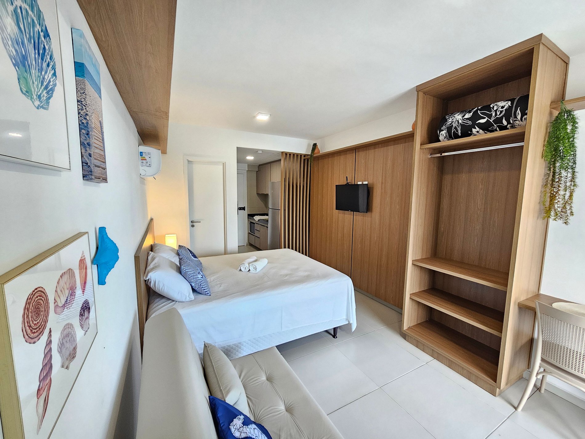 - Studio: 1 cama Queen + 1 sofá-cama, TV e ar-condicionado;