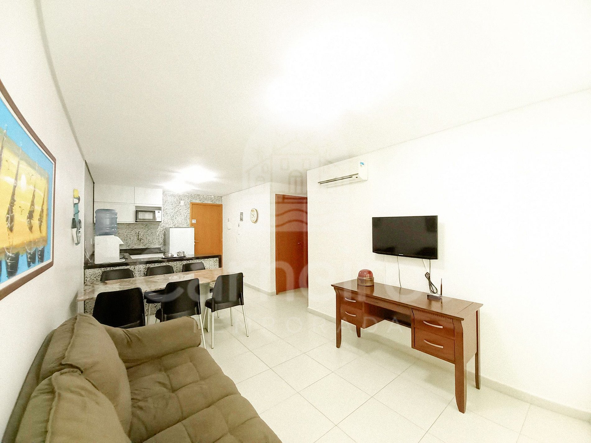 Na sala de estar você encontrará uma decoração agradável, uma TV, sofá e ar condicionado. A cozinha é completa e possui ítens como louça, copos, panelas, talheres, sanduicheira, cafeteira elétrica, micro-ondas, fogão cooktop, gelágua, geladeira, liquidificador e diversos utensílios. Além disso, possui uma sala de jantar com mesa de vidro e 05 cadeiras. O flat possui 02 banheiros completos.