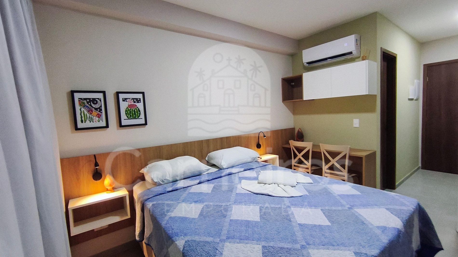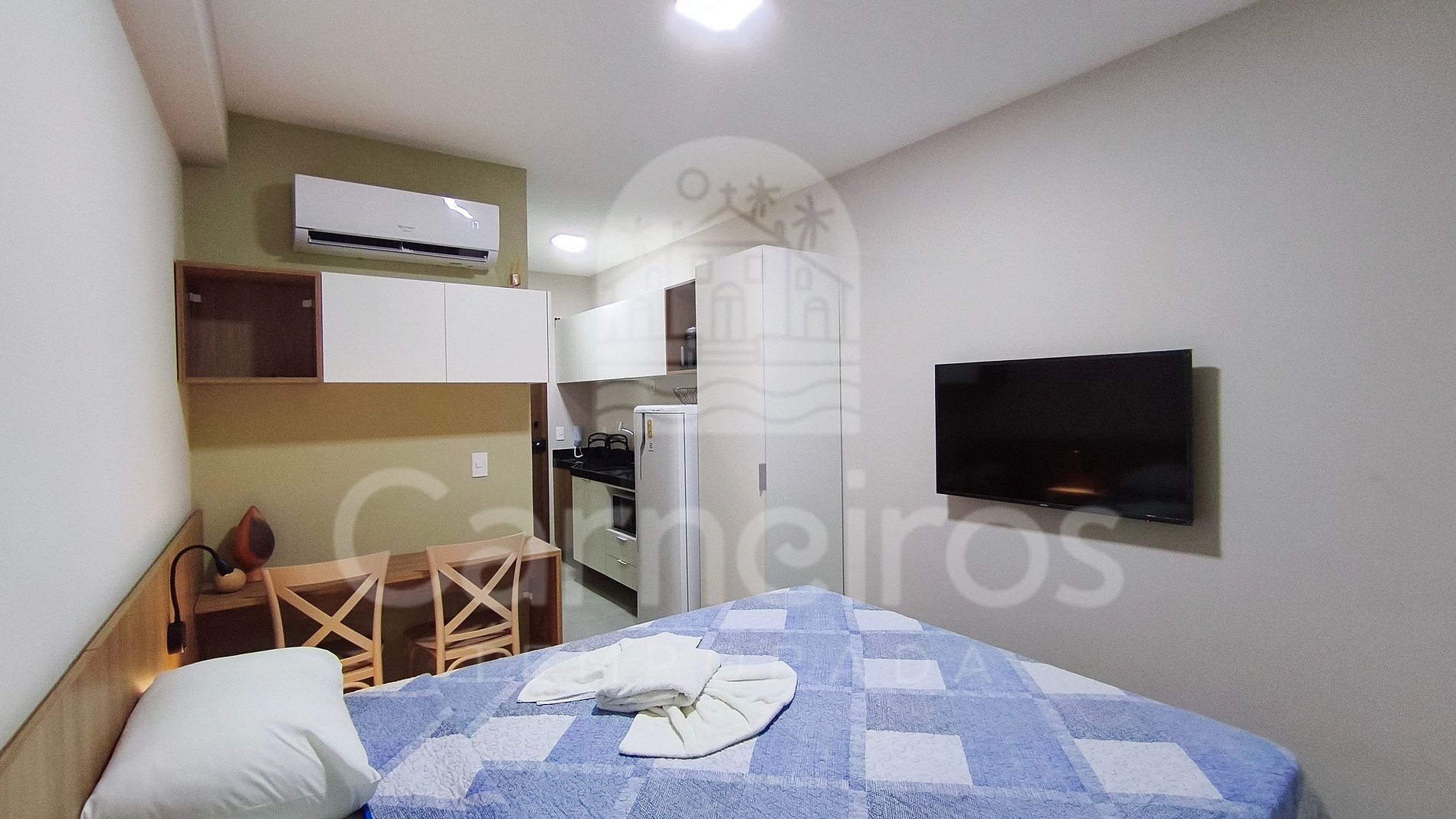 Estúdio: 01 cama de casal + 01 bicama de solteiro, TV e ar-condicionado;