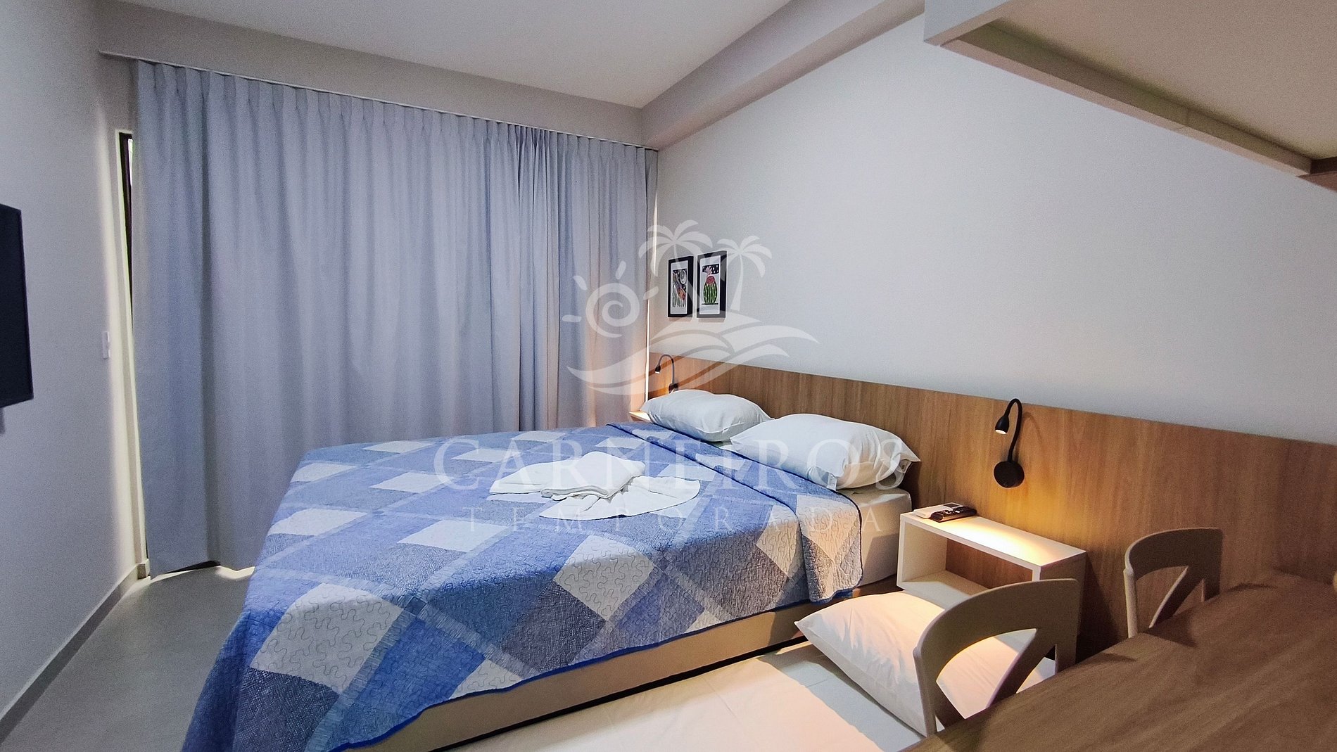 Estúdio: 01 cama de casal + 01 bicama de solteiro, TV e ar-condicionado;