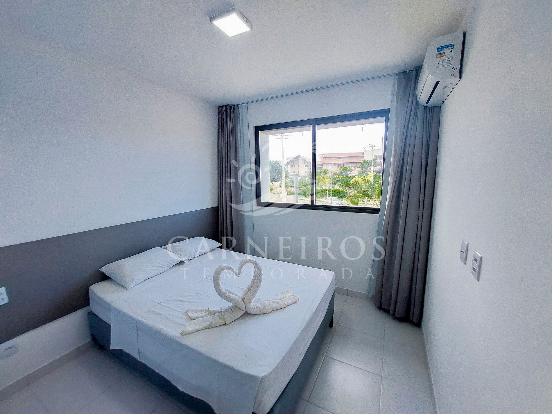 - Suíte 01: Cama box de casal, armário, ar-condicionado e banheiro;