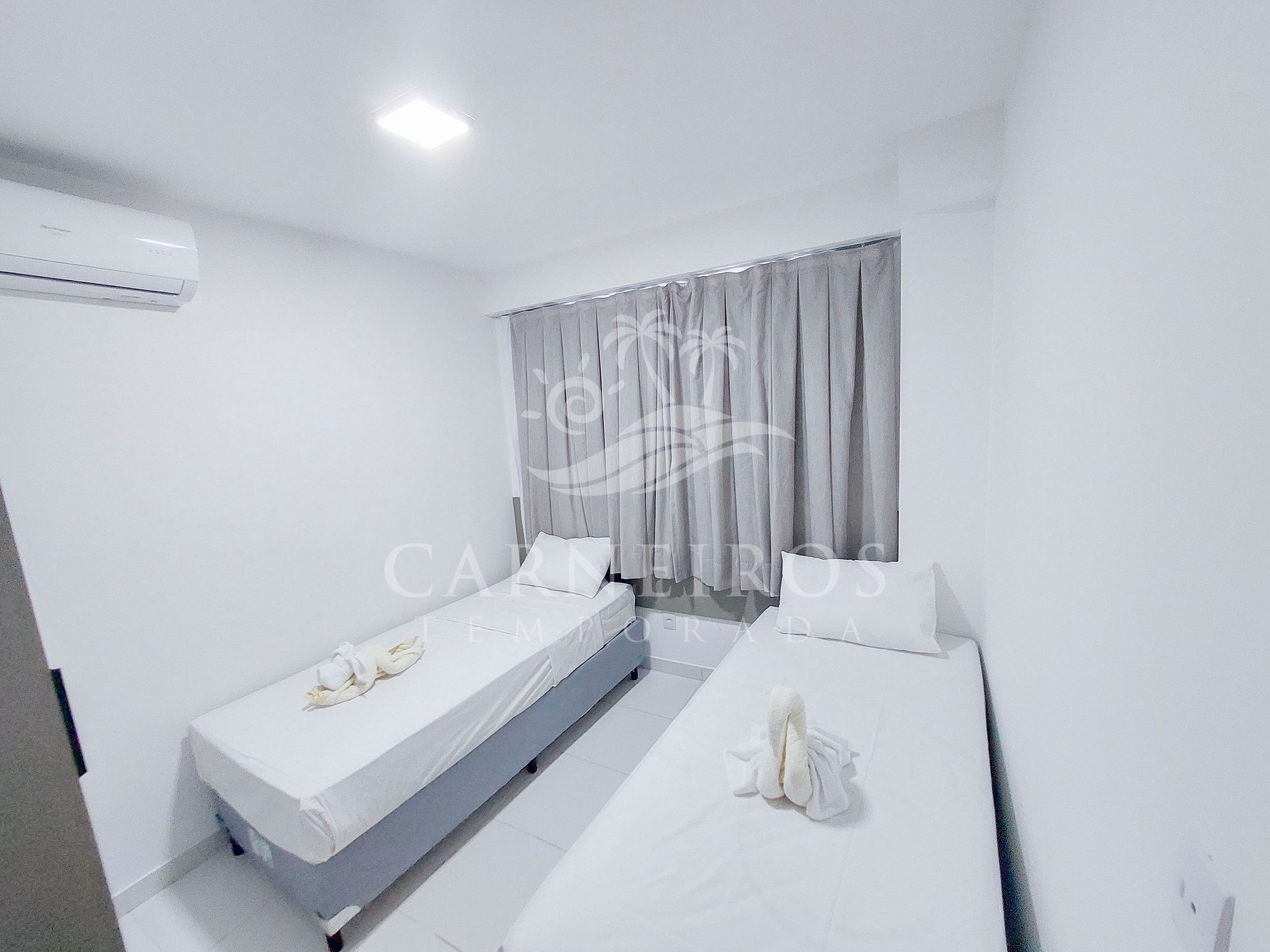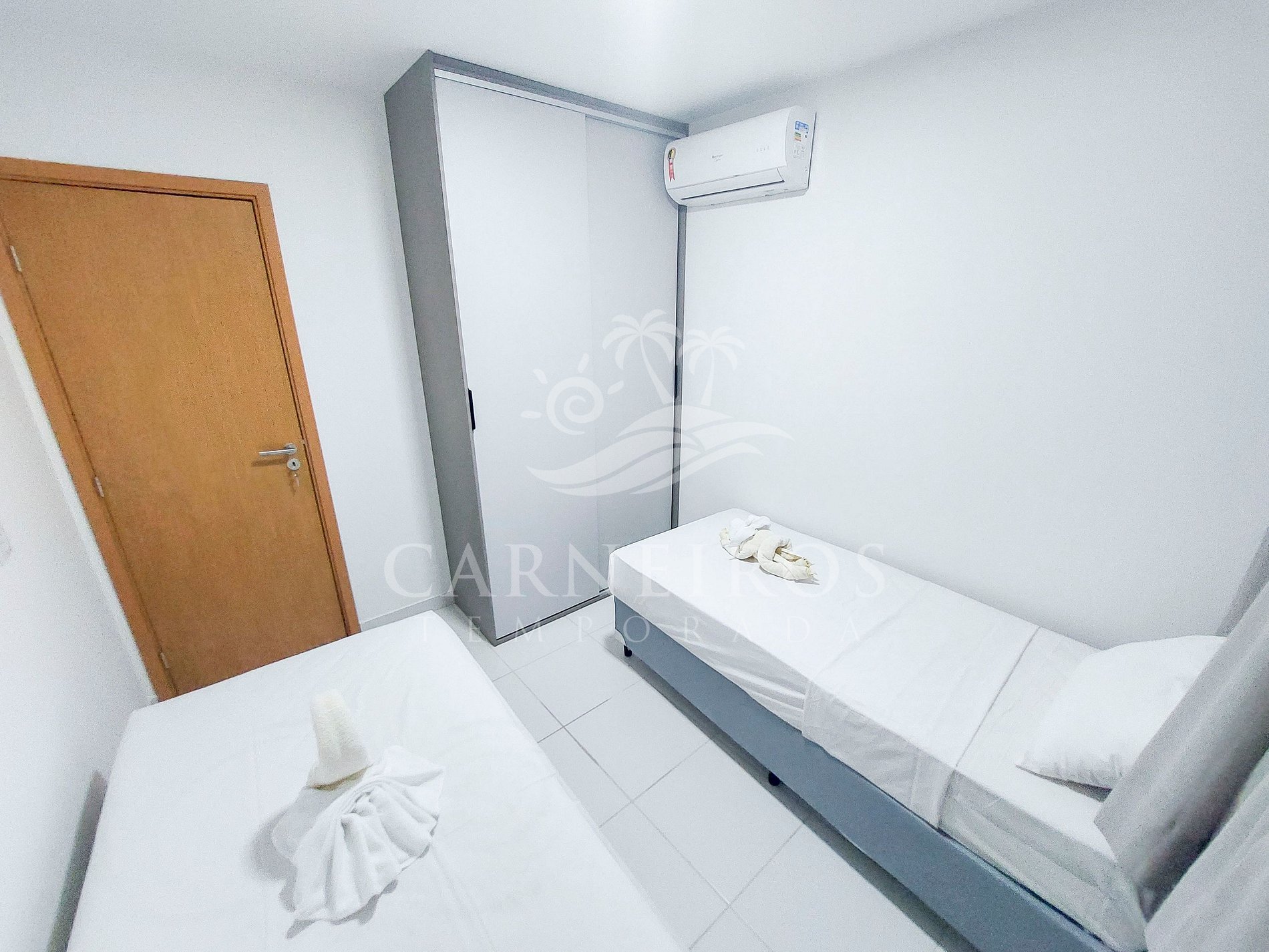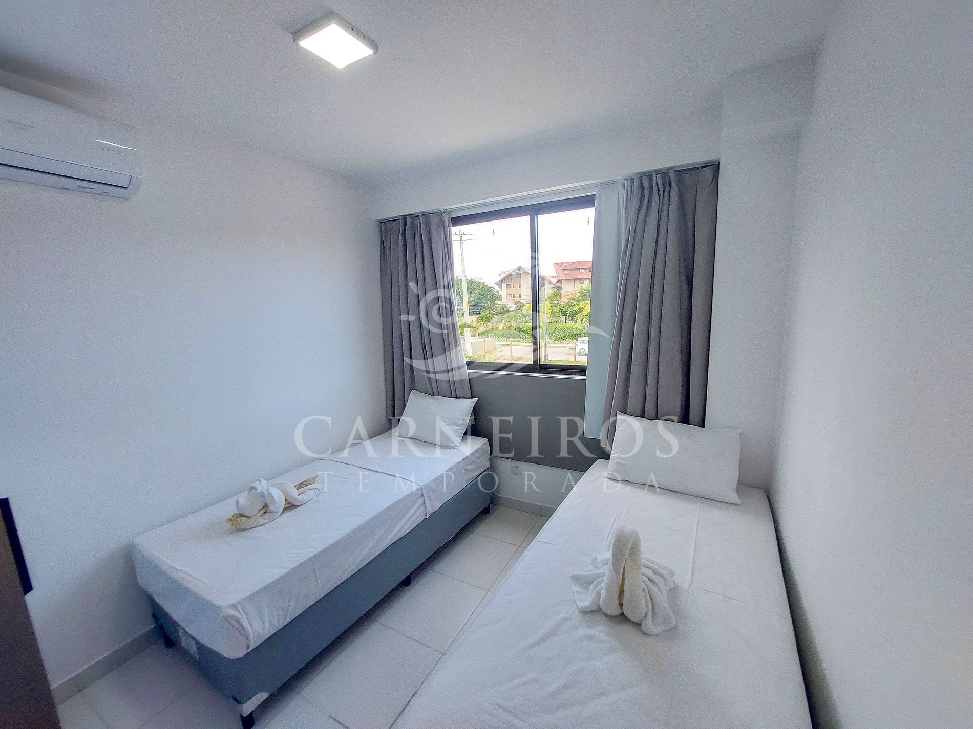 - Quarto 02: 2 camas box de solteiro, armário e ar-condicionado.