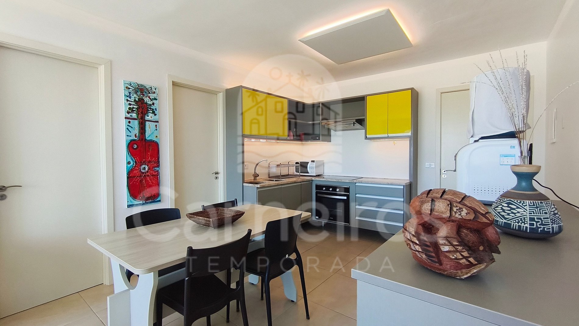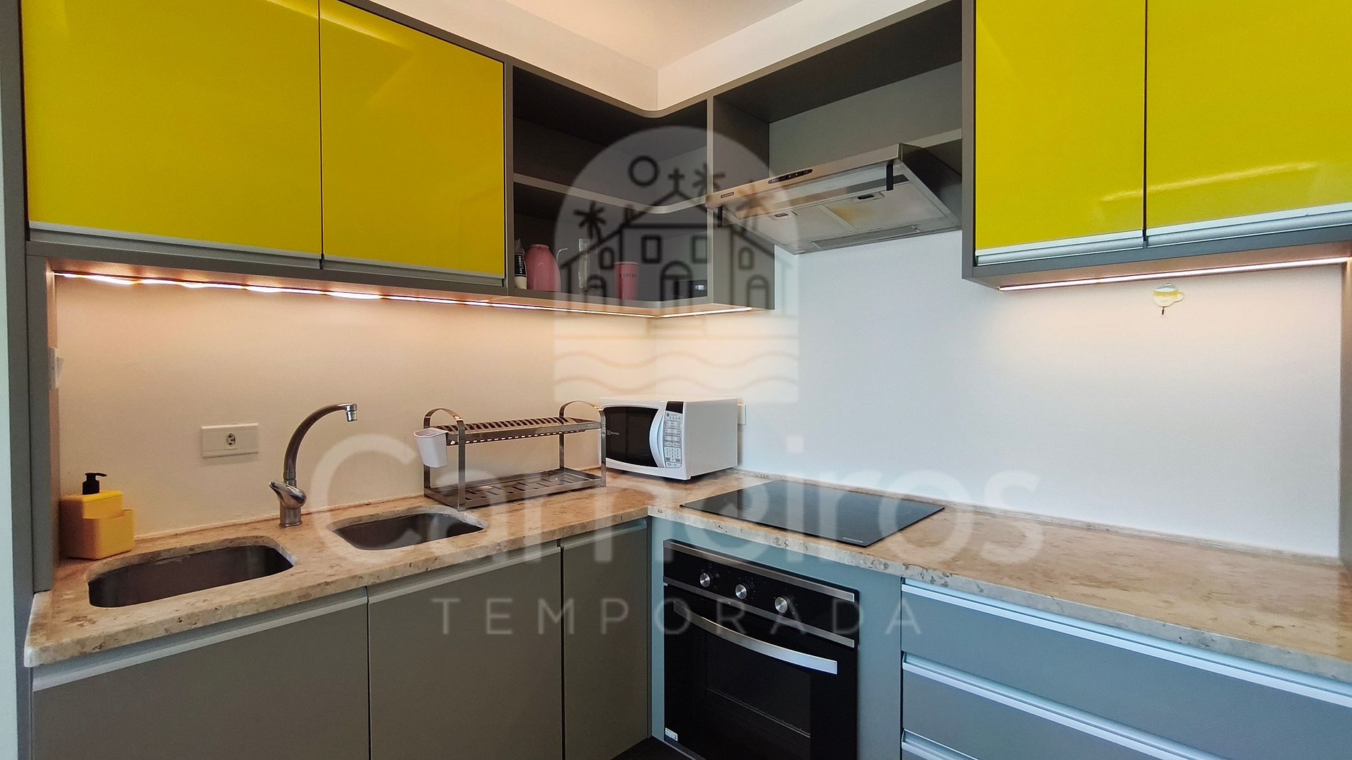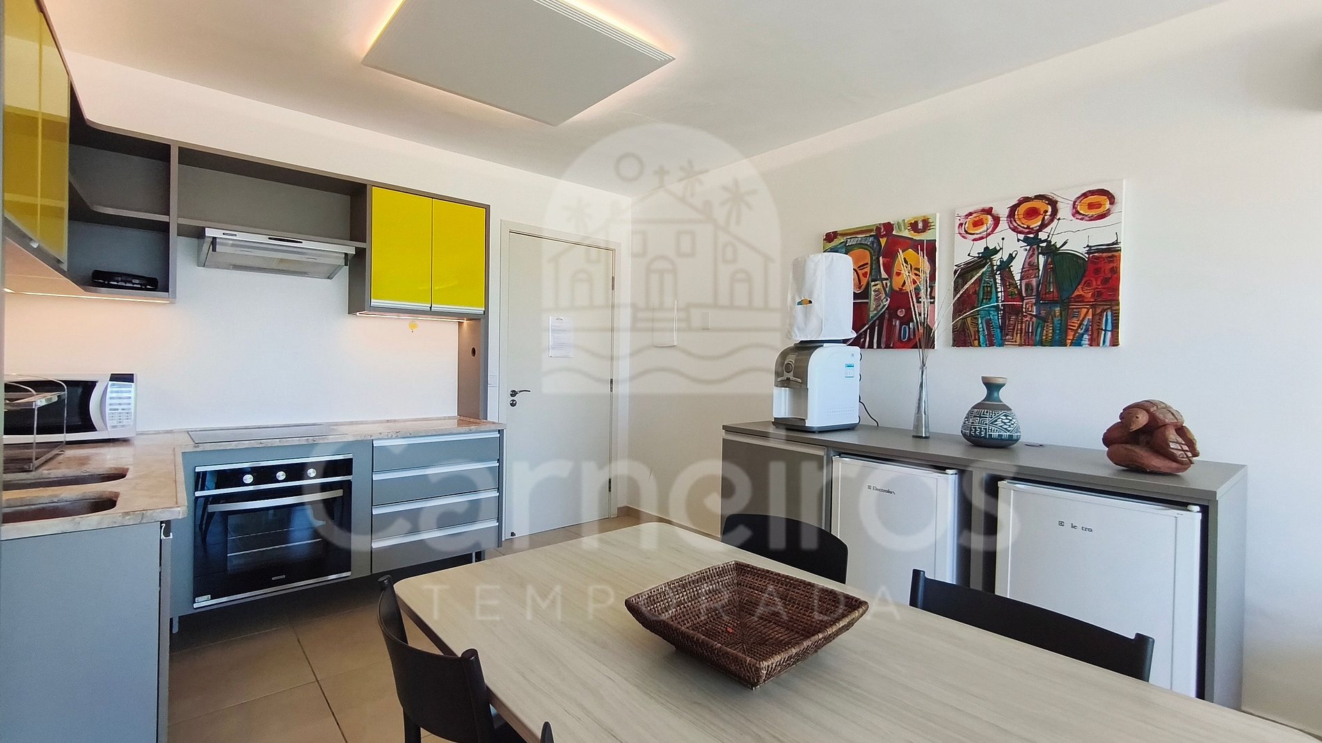 A sala, com decoração moderna, é equipada com sofá, TV e ar-condicionado. A cozinha é completa, contando com louças, panelas, talheres e eletrodomésticos como geladeira, fogão cooktop, forno, liquidificador, cafeteira, micro-ondas, air fryer, entre outros. O imóvel também possui 1 banheiro completo.