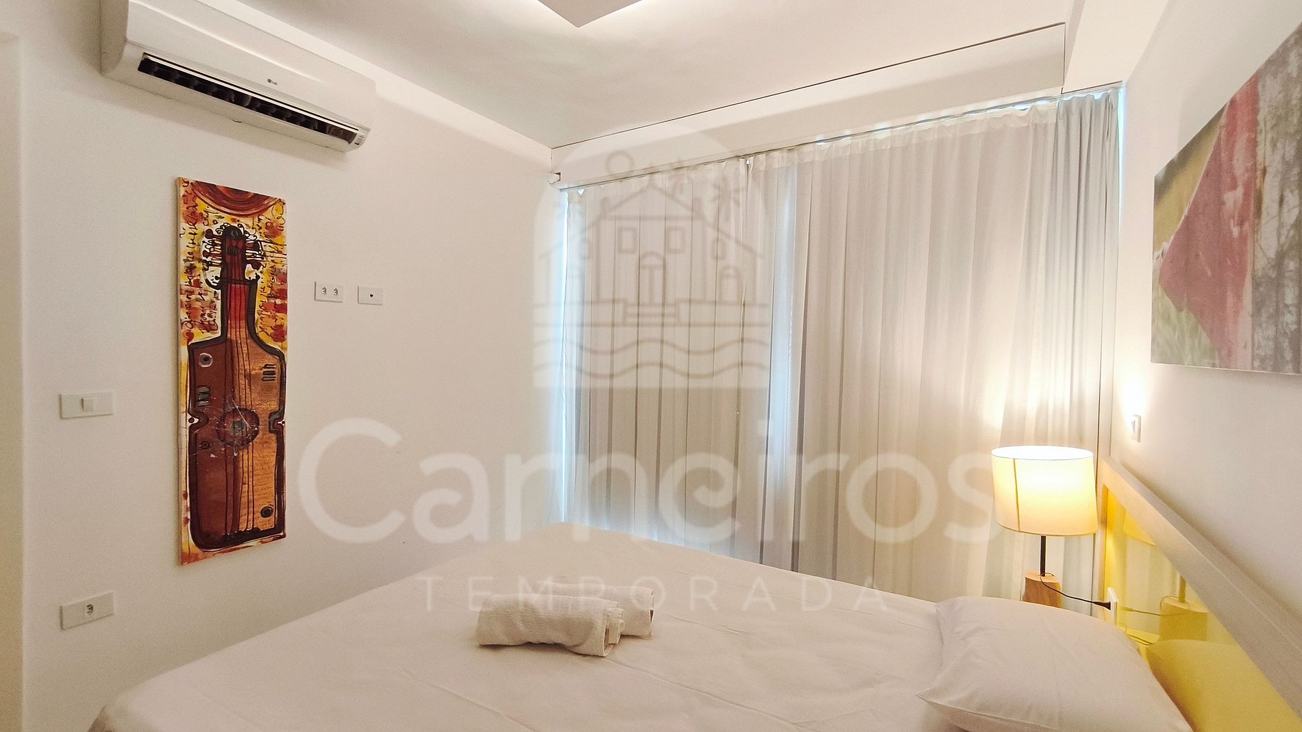 Quarto: 1 cama de casal, armário e ar-condicionado.