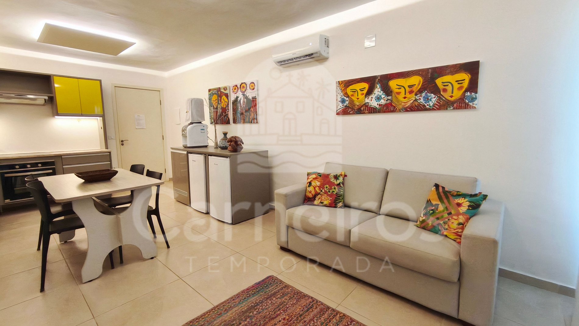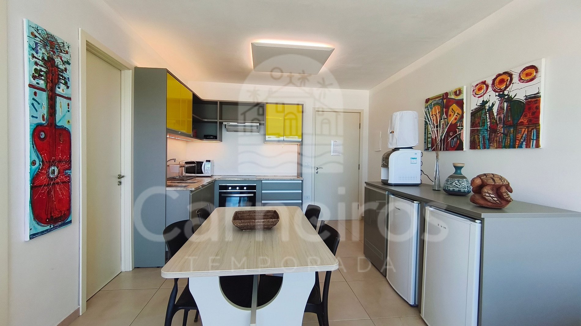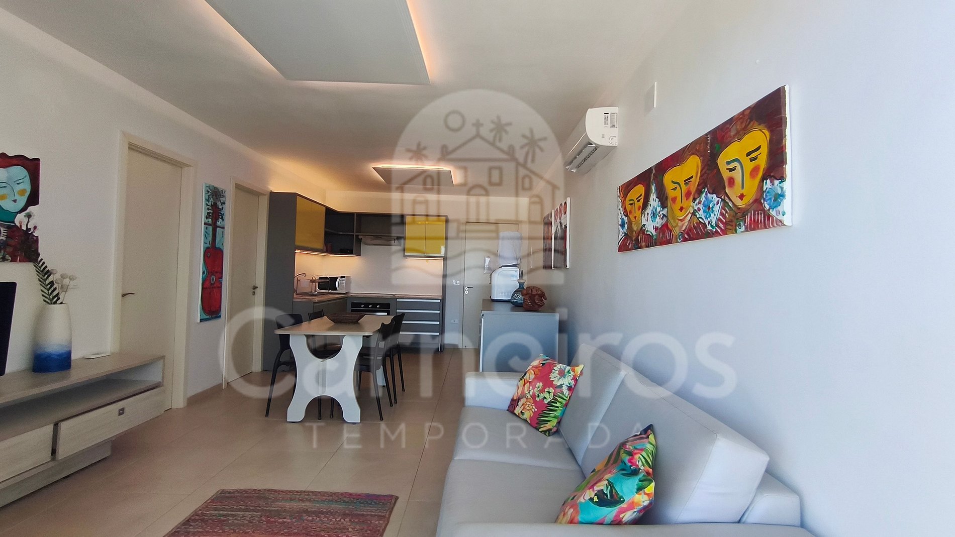 A sala, com decoração moderna, é equipada com sofá, TV e ar-condicionado. A cozinha é completa, contando com louças, panelas, talheres e eletrodomésticos como geladeira, fogão cooktop, forno, liquidificador, cafeteira, micro-ondas, air fryer, entre outros. O imóvel também possui 1 banheiro completo.