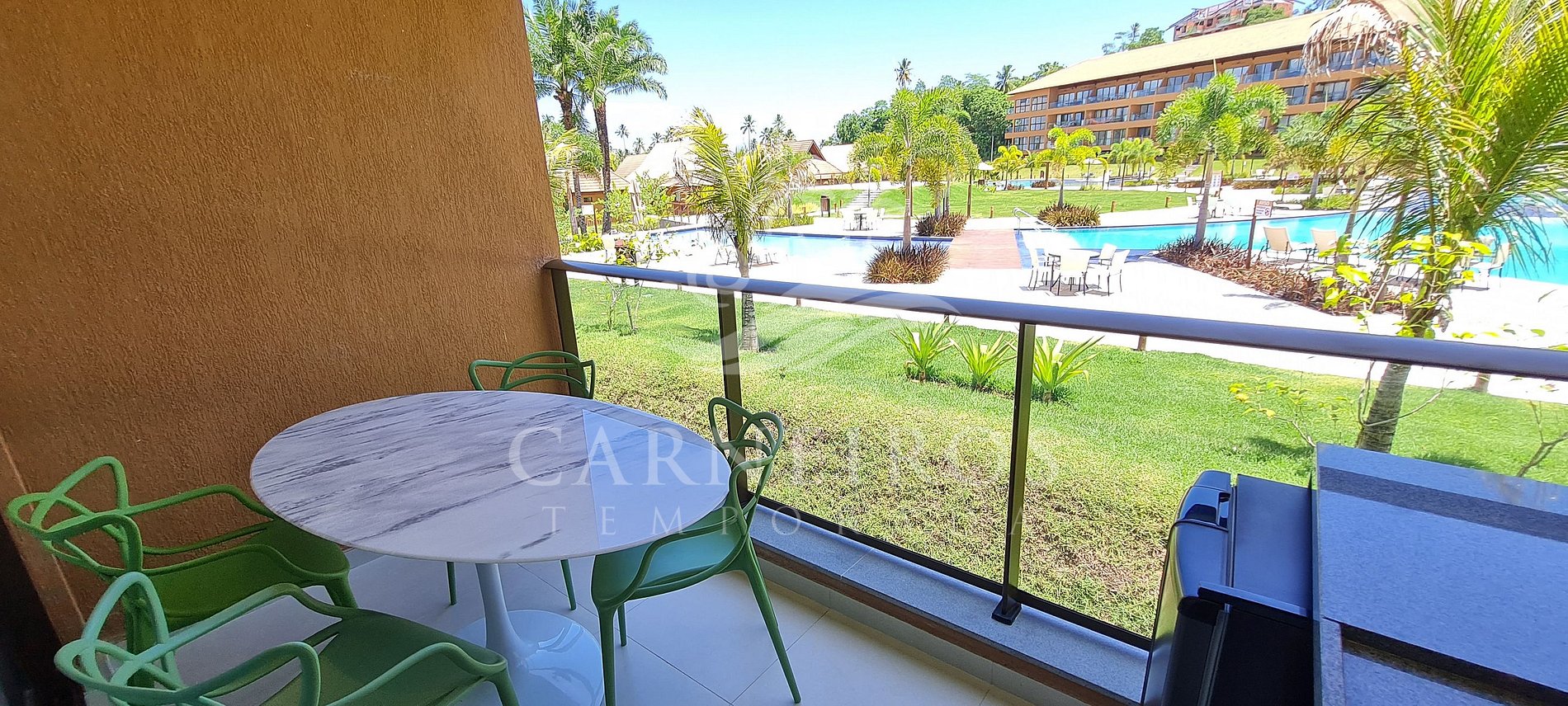 ✹ O flat se localiza no andar térreo, possui uma linda varanda vista piscina com quatro cadeiras, mesa de centro, churrasqueira elétrica e uma adega climatizada ✹