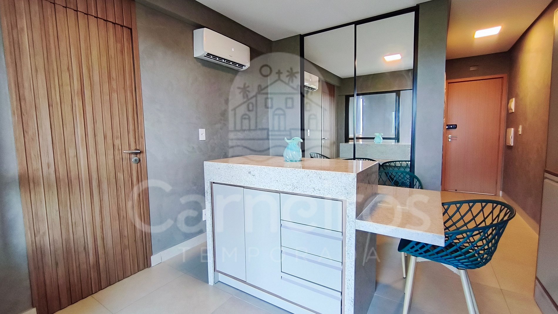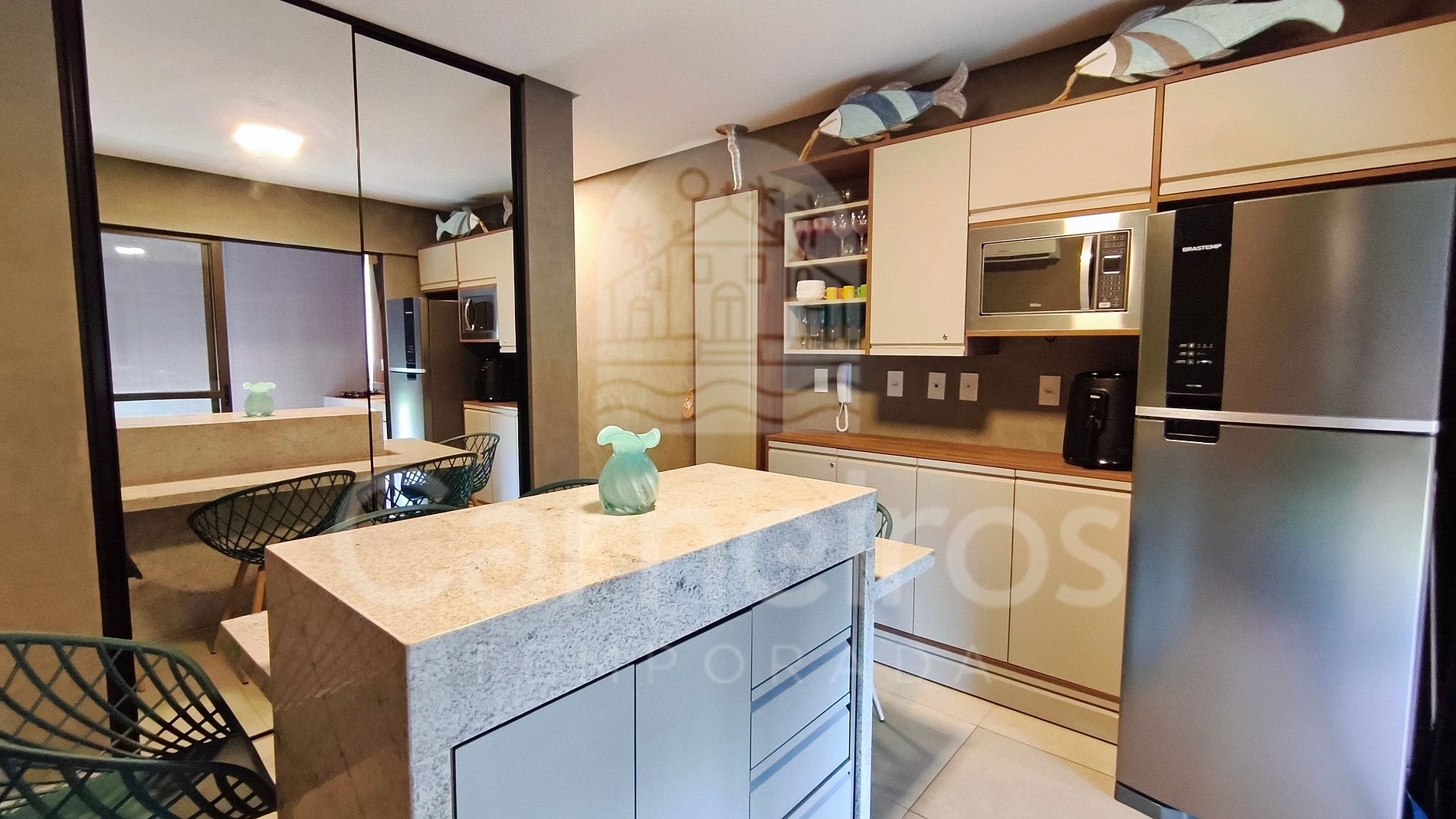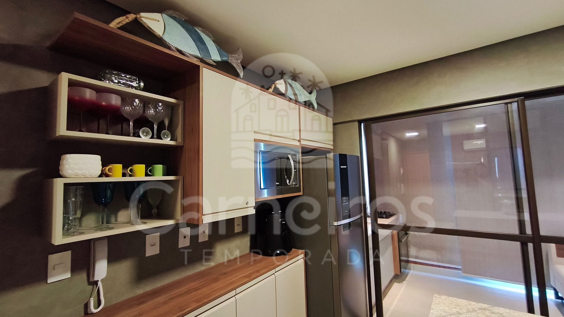 No ambiente, além da decoração agradável temos um sofá, balcão com cadeiras cadeiras, ar-condicionado e uma cozinha completa que possui diversos itens como micro-ondas, fogão cooktop 04 bocas, geladeira, sanduicheira, airfryer, torradeira e diversos utensílios. O flat possui 2 banheiros completos.