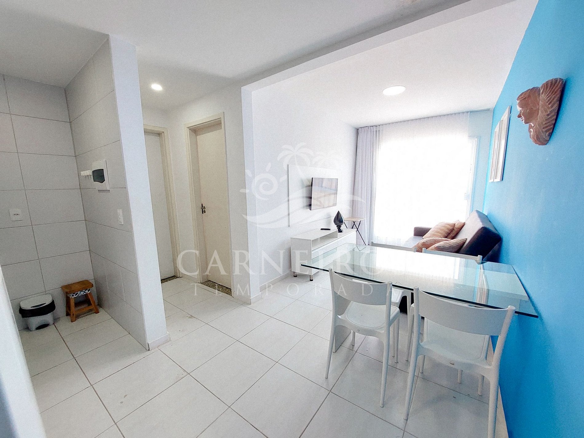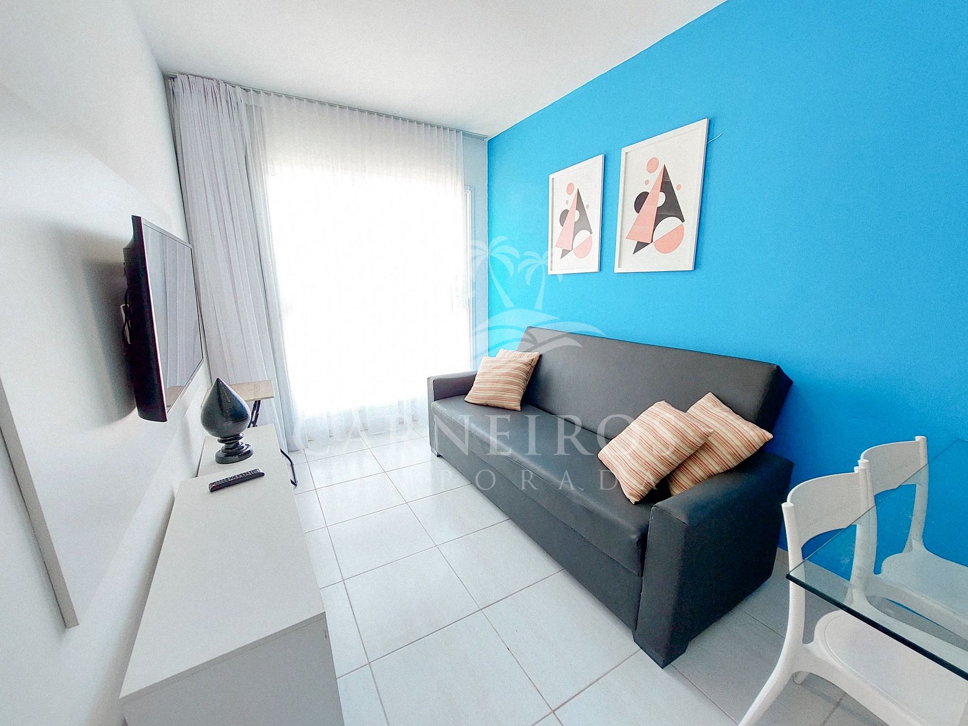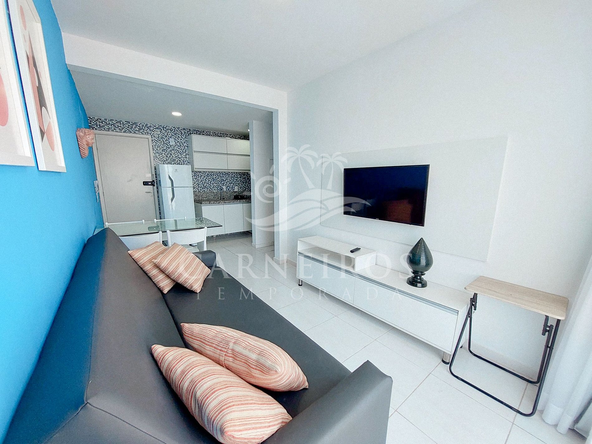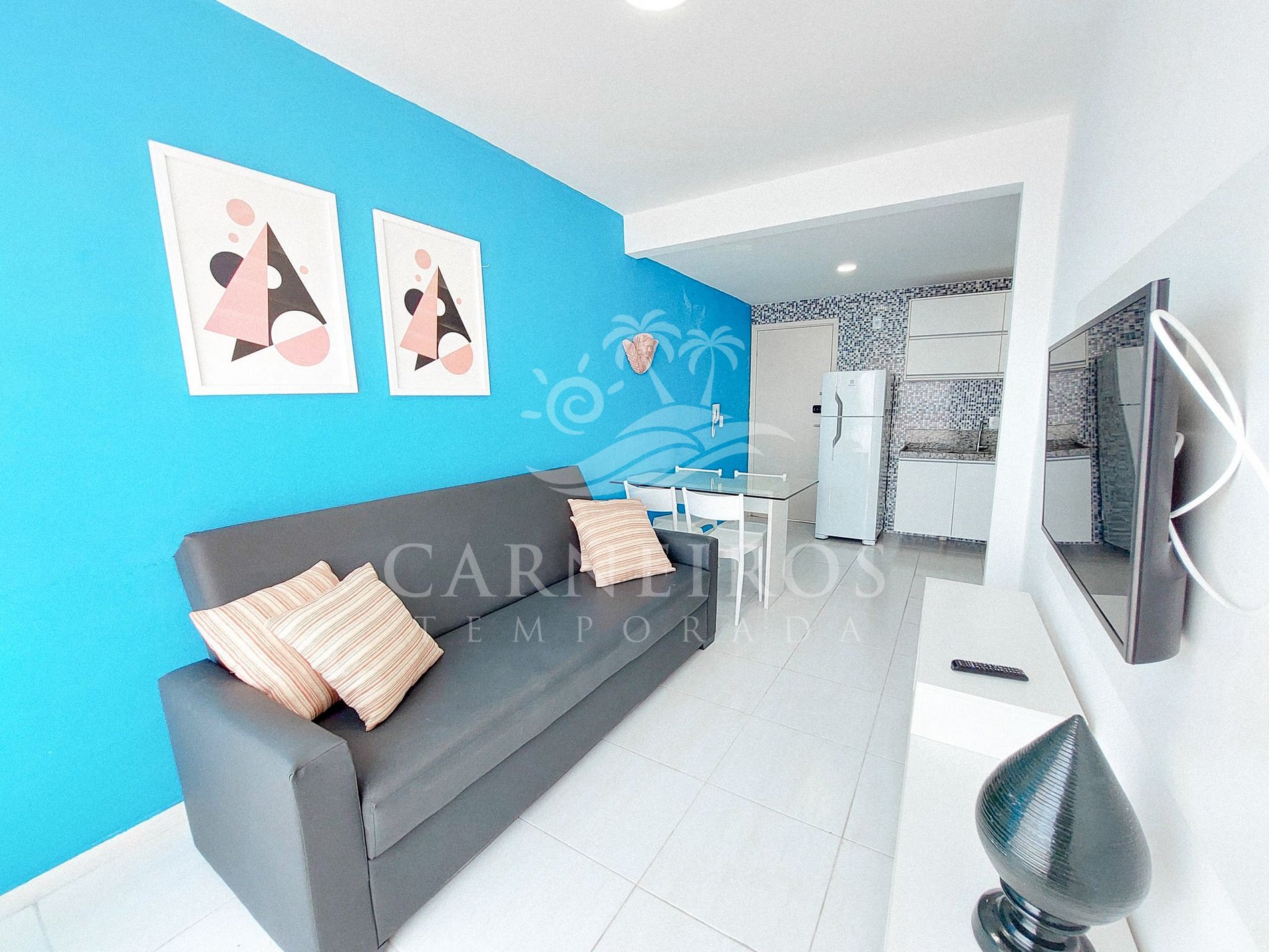 Na sala de estar a decoração minimalista e com tom rústico traz toda calmaria que a praia passa, tendo uma TV, ventilador e sofá-cama de casal. A cozinha é completa e equipada com os principais itens como louça, copos, panelas, talheres, sanduicheira, cafeteira, liquidificador, micro-ondas, fogão 04 bocas com forno, geladeira e diversos utensílios. Além disso, temos uma mesa de vidro com quatro cadeiras. Há também 1 banheiro com ducha quente e armários que atende às necessidades diárias.