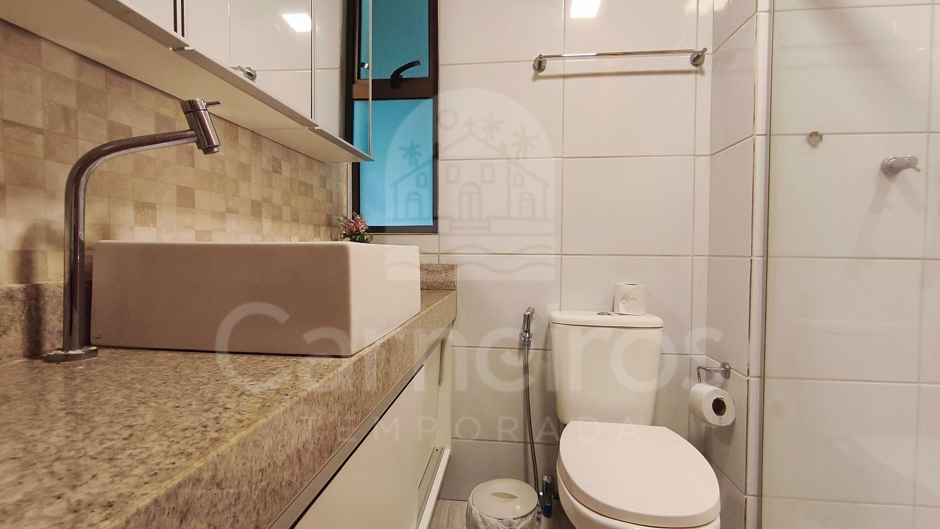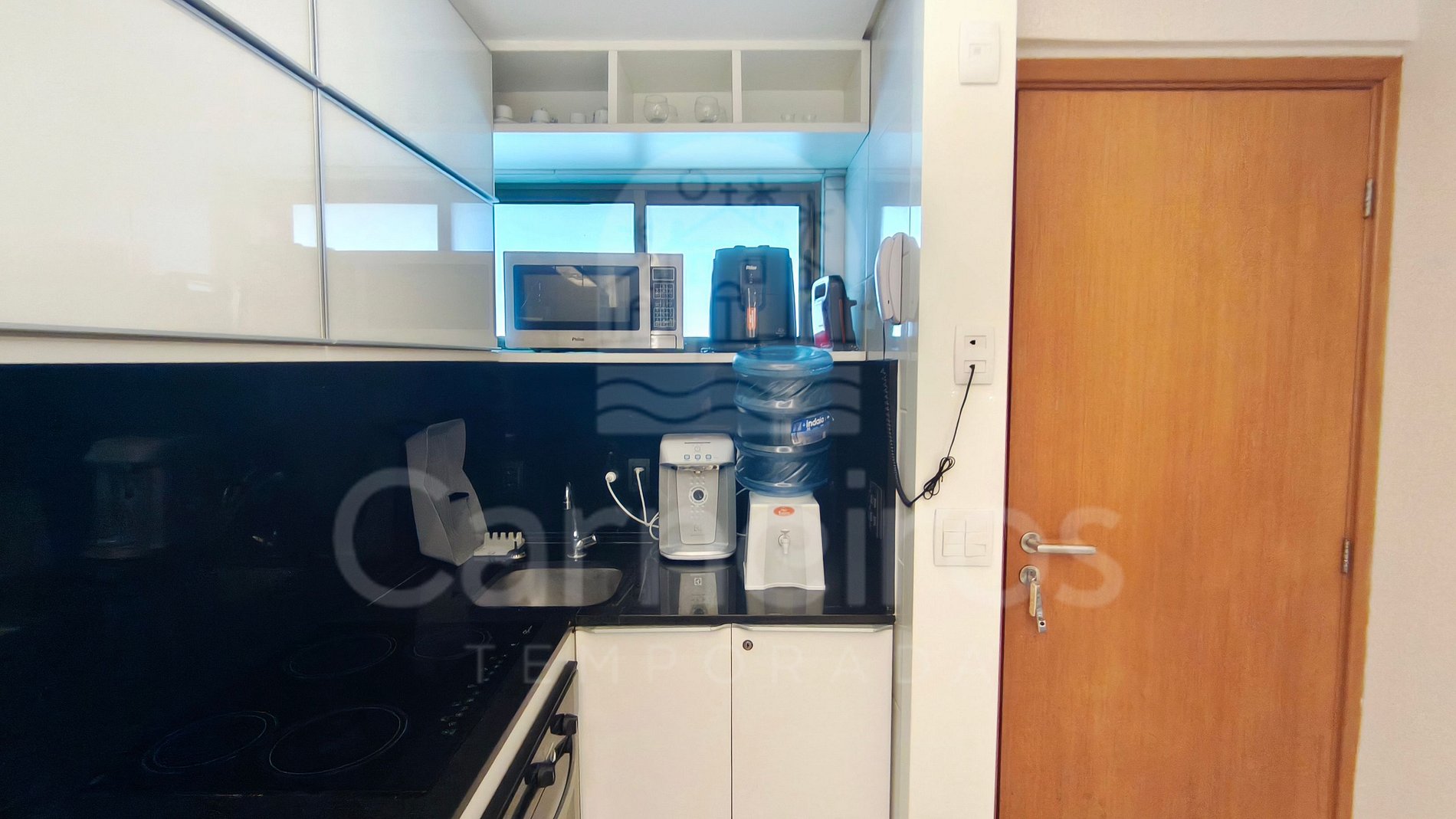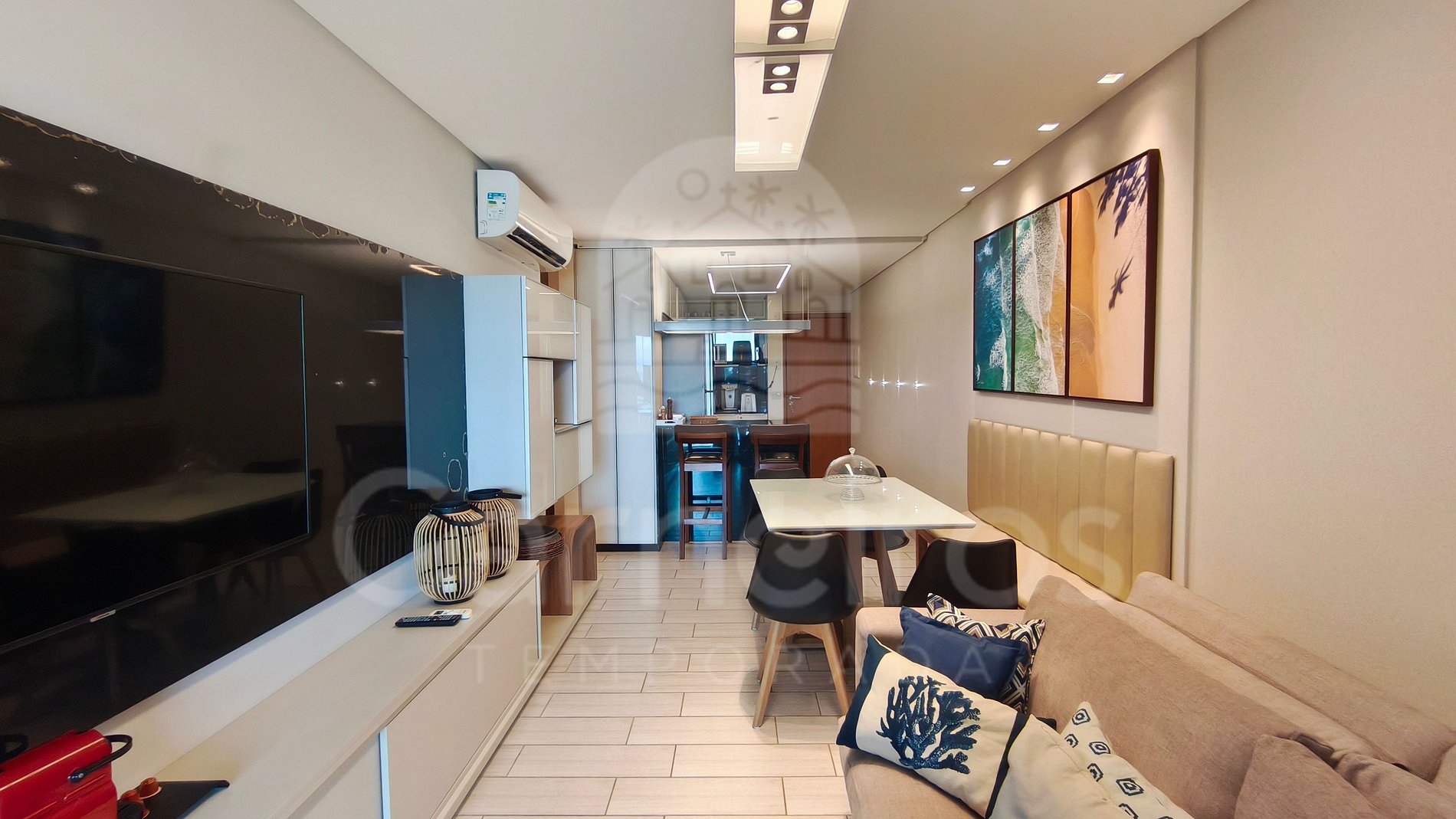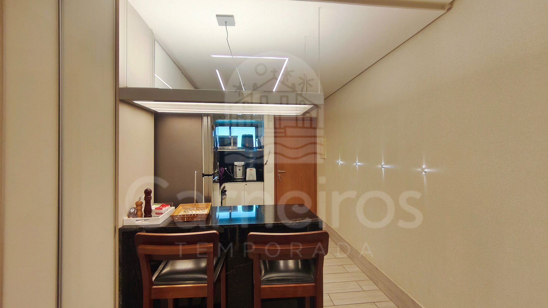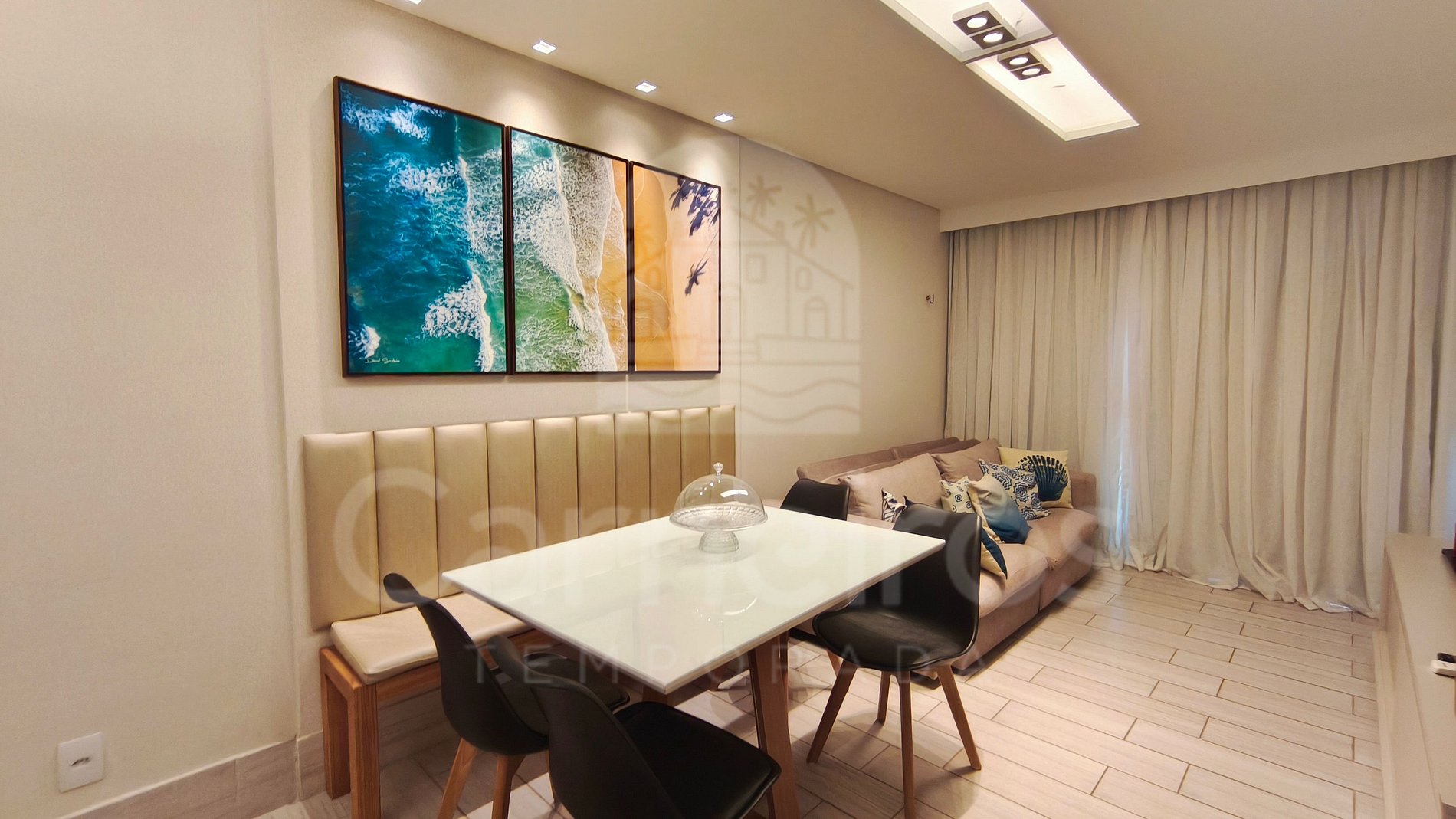 A sala de estar conta com uma decoração aconchegante e minimalista, sofá, TV e mesa de jantar com 4 cadeiras. A cozinha é completa e equipada com os principais utensílios: geladeira, micro-ondas, fogão 04 bocas, forno, liquidificador, bebedouro, sanduicheira e outros. Possui também 2 banheiros, ambos completos com box, ducha higiênica e chuveiro com água aquecida.