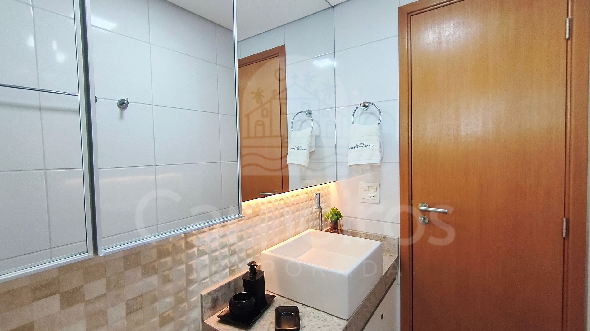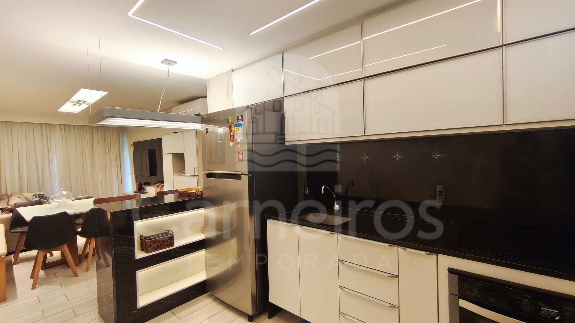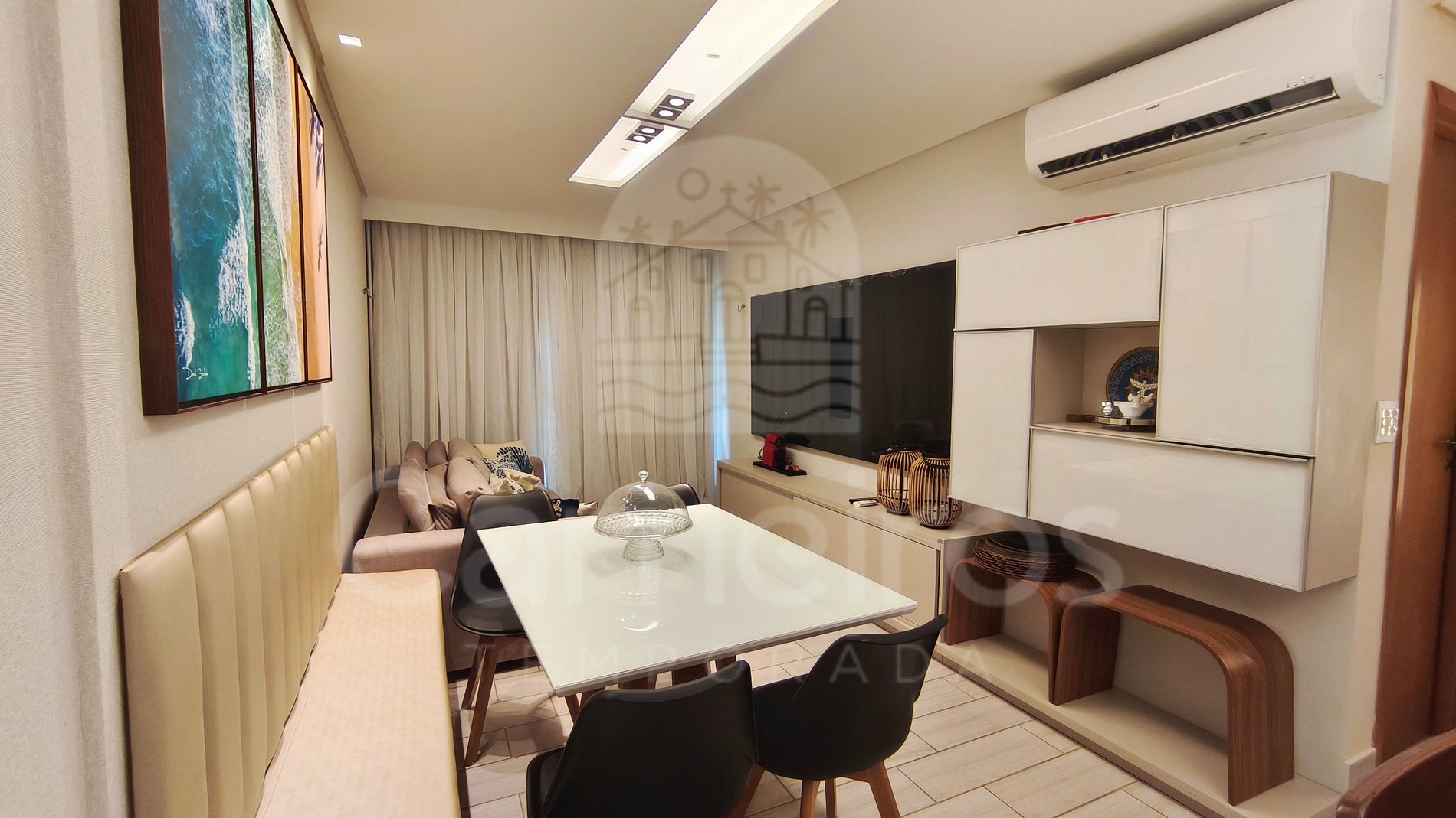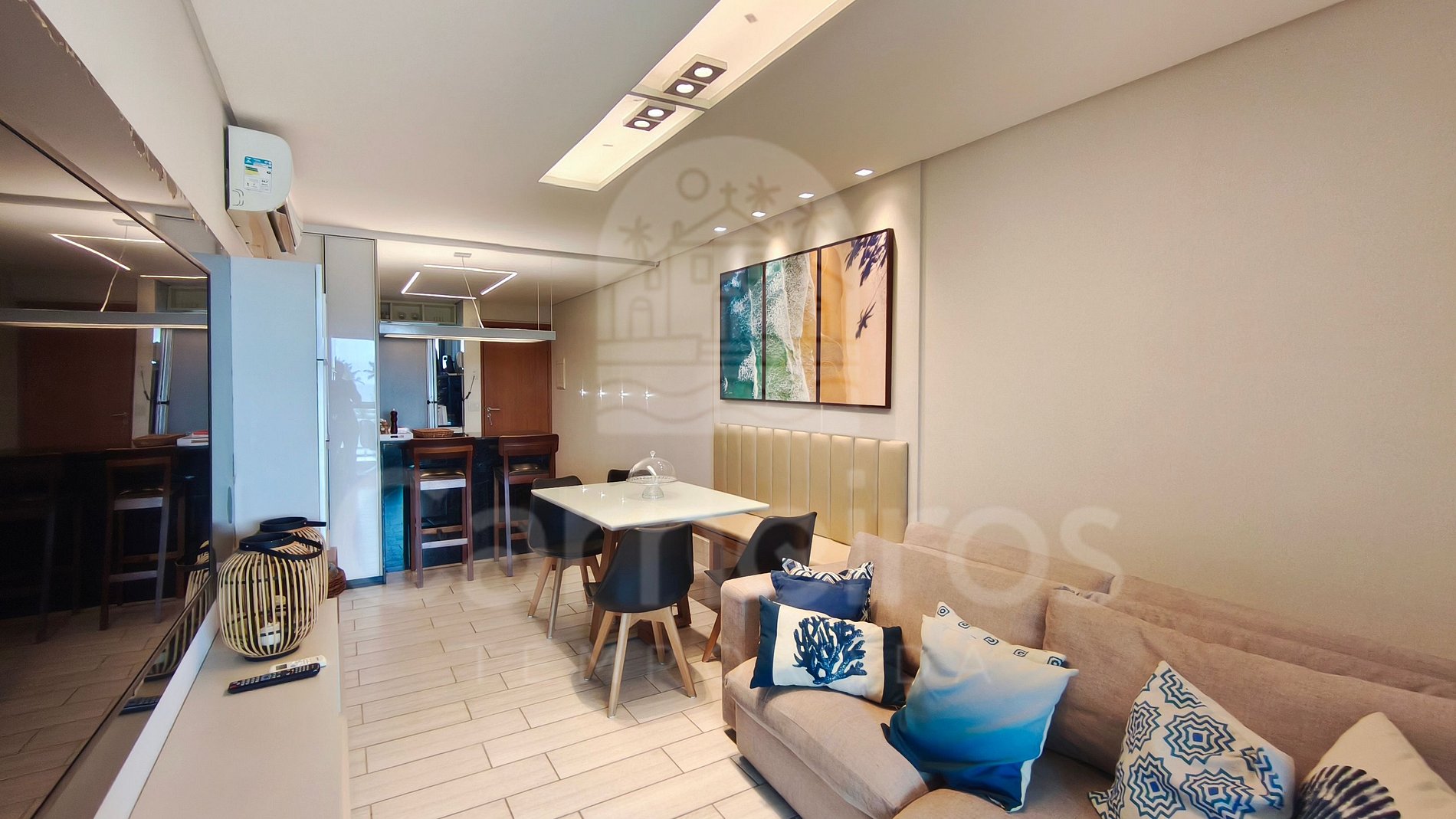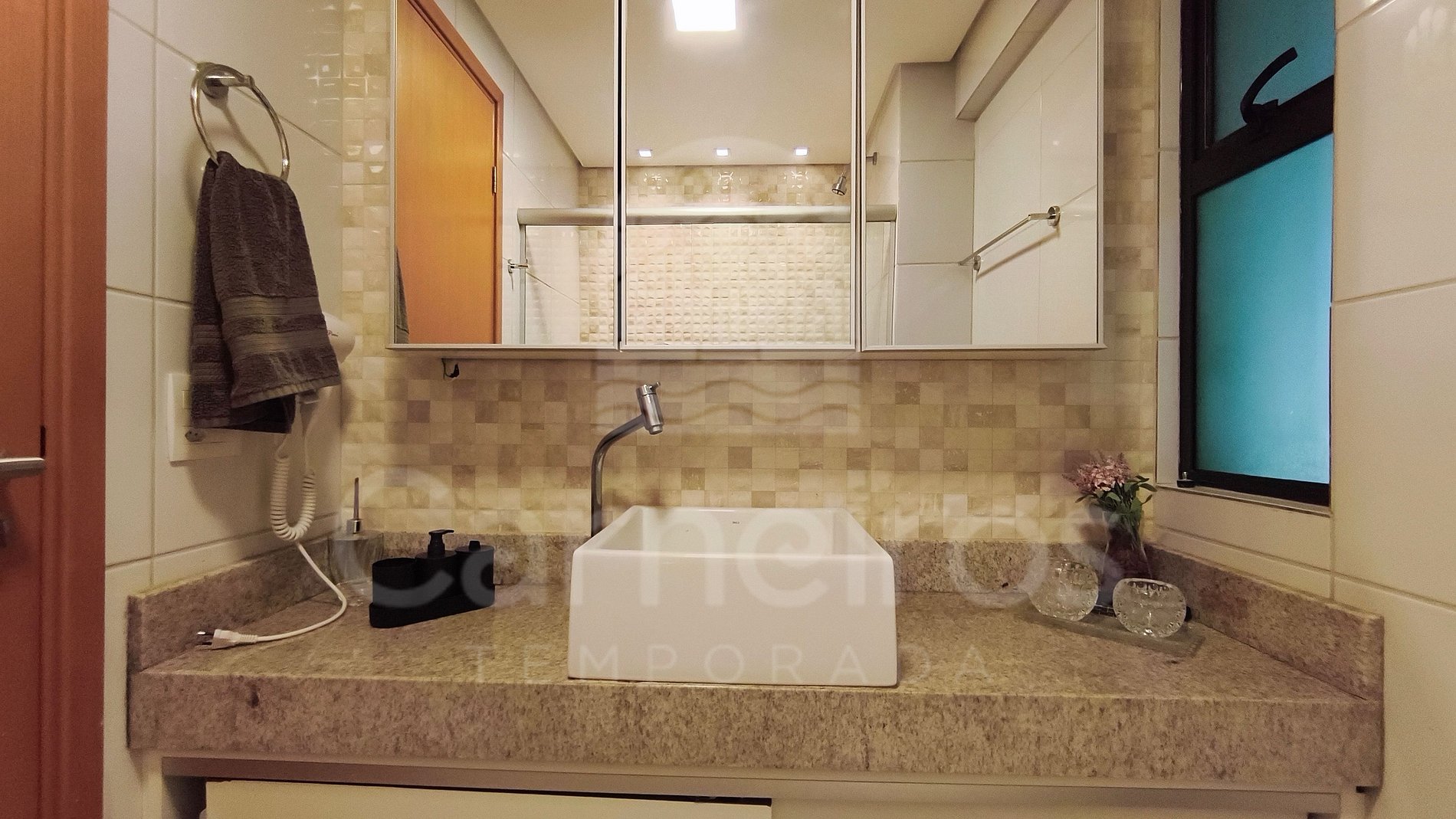 A sala de estar conta com uma decoração aconchegante e minimalista, sofá, TV e mesa de jantar com 4 cadeiras. A cozinha é completa e equipada com os principais utensílios: geladeira, micro-ondas, fogão 04 bocas, forno, liquidificador, bebedouro, sanduicheira e outros. Possui também 2 banheiros, ambos completos com box, ducha higiênica e chuveiro com água aquecida.