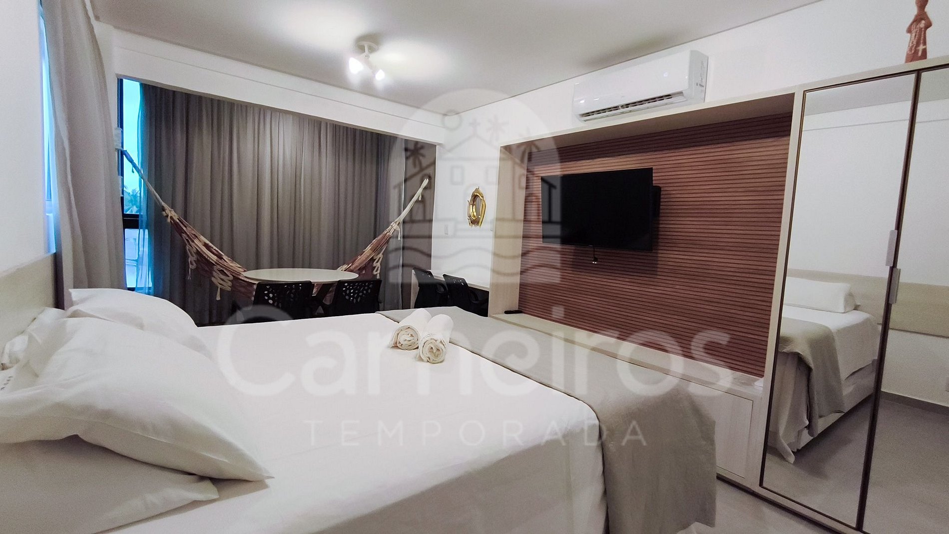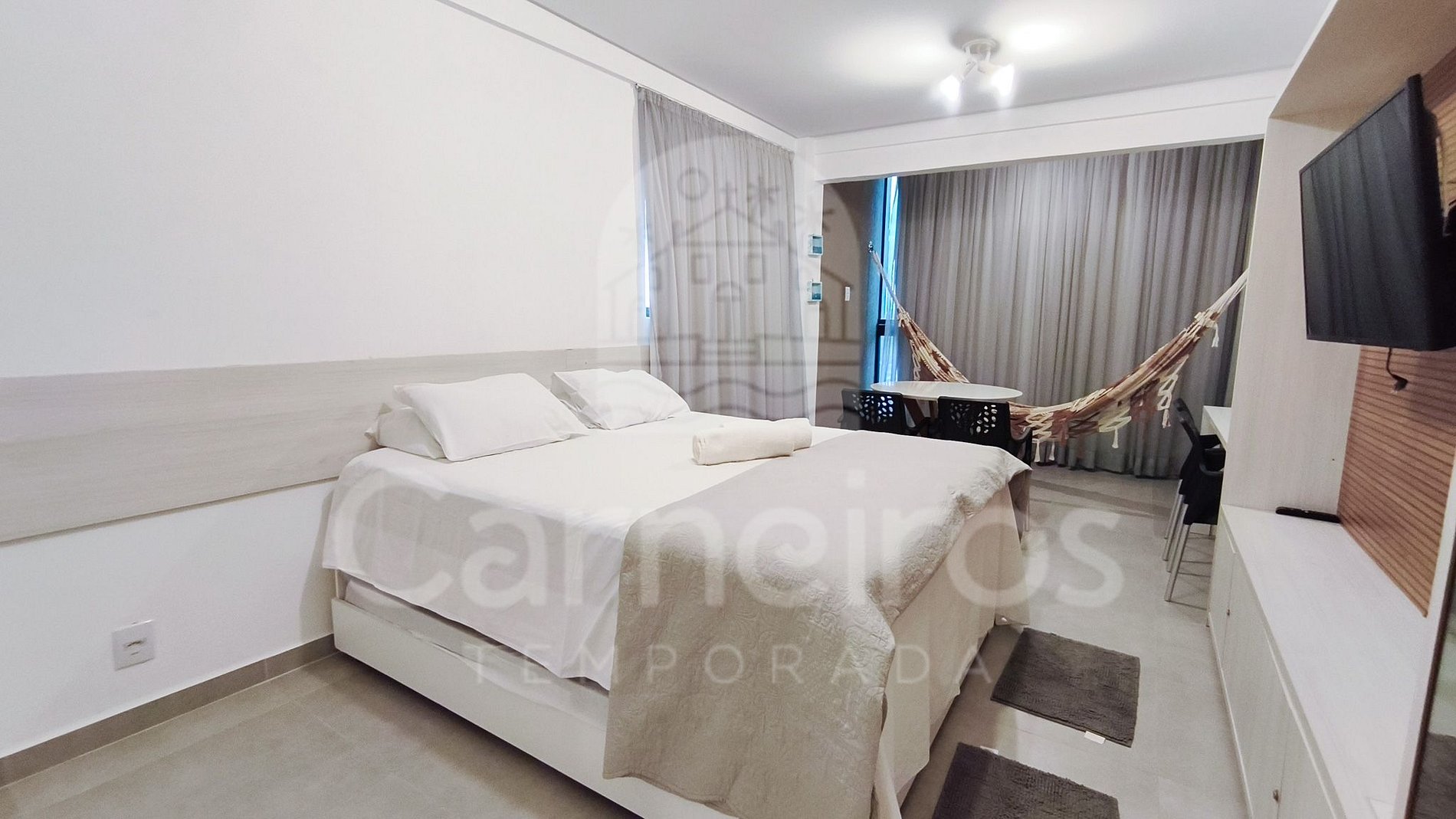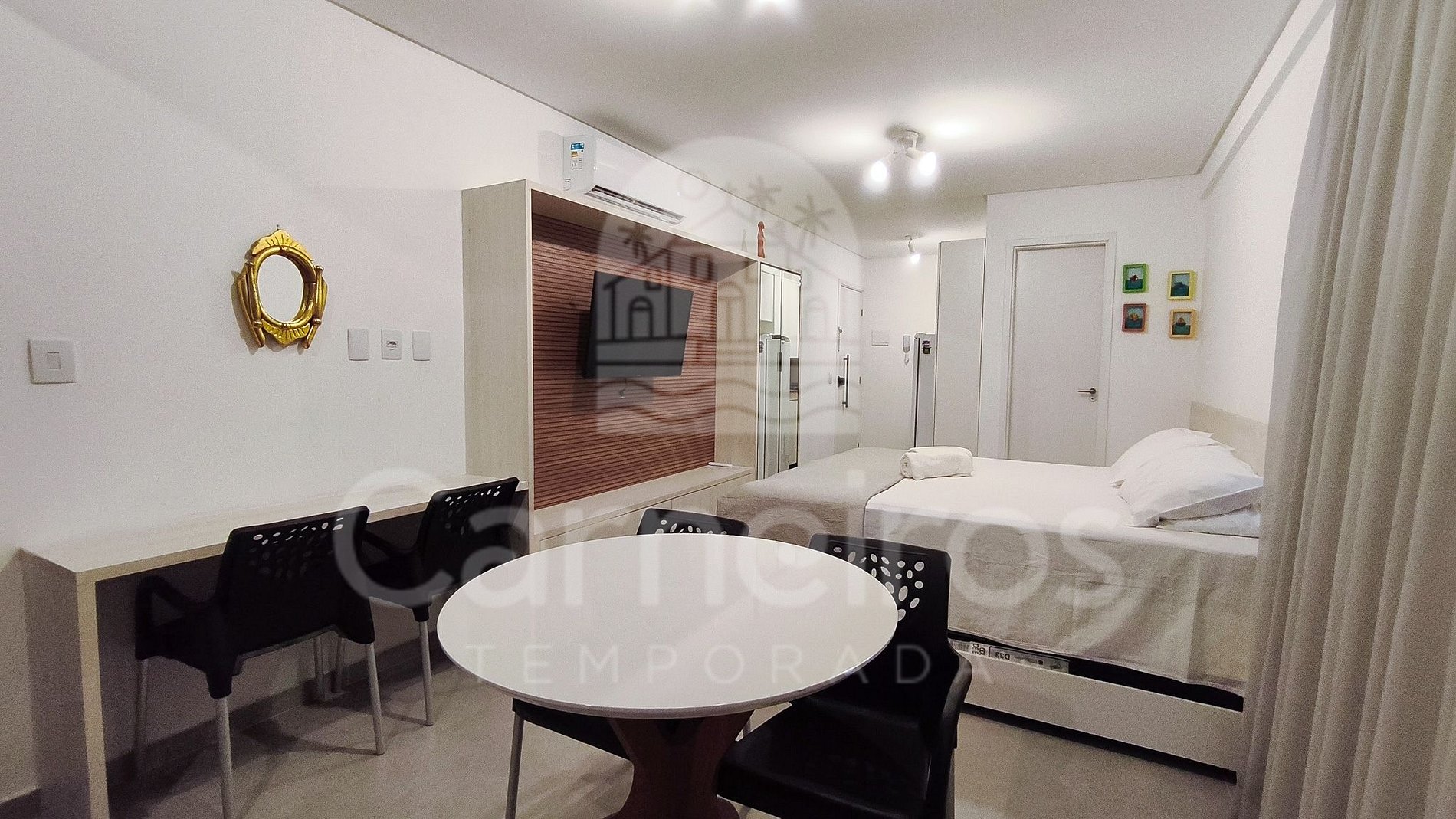 No ambiente, além da decoração moderna, você encontrará uma TV, ar-condicionado e cama com bicamas. A cozinha é completa e equipada com os principais itens como louça, copos, panelas, talheres, sanduicheira, liquidificador, micro-ondas, fogão, geladeira e diversos utensílios. O studio possui 1 banheiro completo.