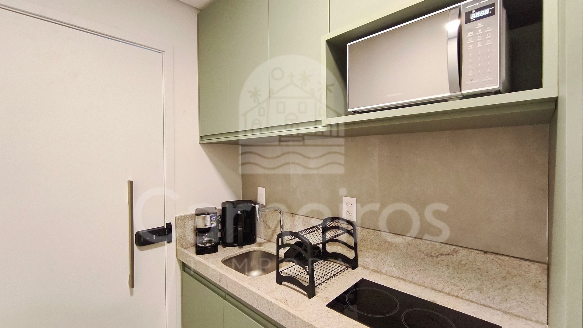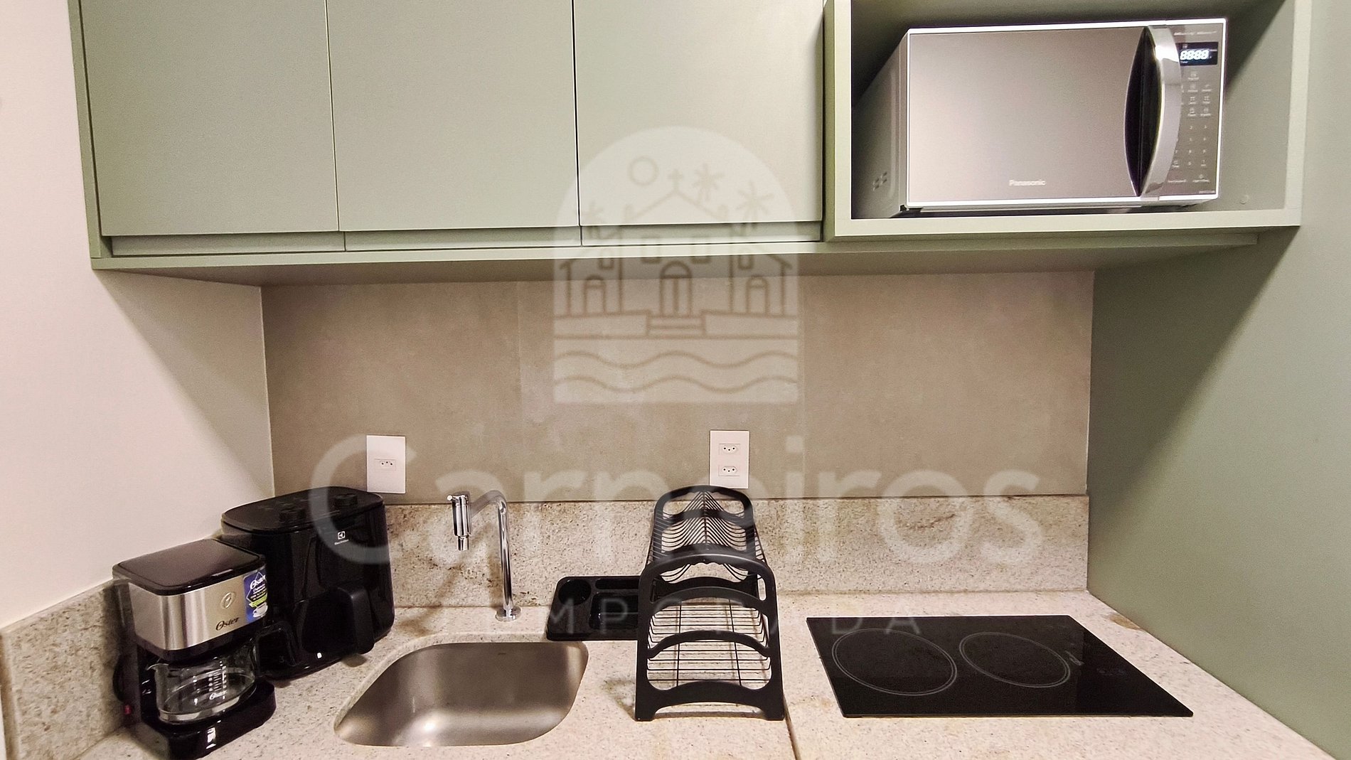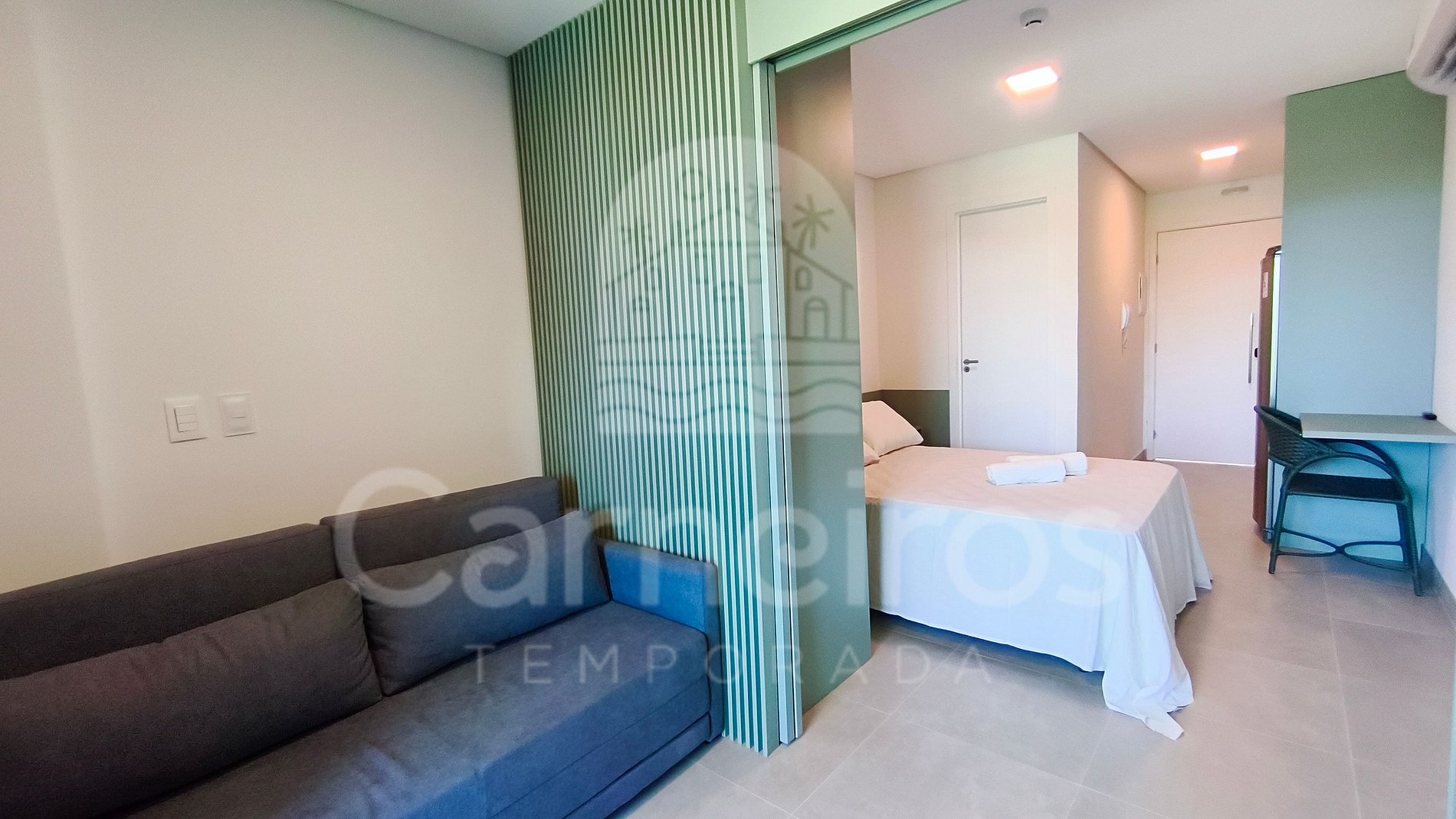 No imóvel, com decoração moderna e aconchegante, você encontrará um sofá-cama, TV (com serviço de streaming), ar-condicionado, cama de casal, armário e muito mais. A cozinha é completa e equipada com os principais itens como louça, copos, panelas, talheres, sanduicheira, liquidificador, micro-ondas, airfryer, fogão cooktop 02 bocas, geladeira e diversos utensílios. Há um divisor no espaço que garante maior privacidade entre a sala e o quarto. Possui 1 banheiro completo.