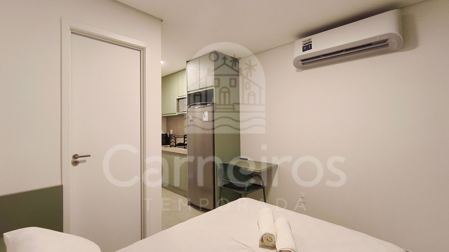 No imóvel, com decoração moderna e aconchegante, você encontrará um sofá-cama, TV (com serviço de streaming), ar-condicionado, cama de casal, armário e muito mais. A cozinha é completa e equipada com os principais itens como louça, copos, panelas, talheres, sanduicheira, liquidificador, micro-ondas, airfryer, fogão cooktop 02 bocas, geladeira e diversos utensílios. Há um divisor no espaço que garante maior privacidade entre a sala e o quarto. Possui 1 banheiro completo.