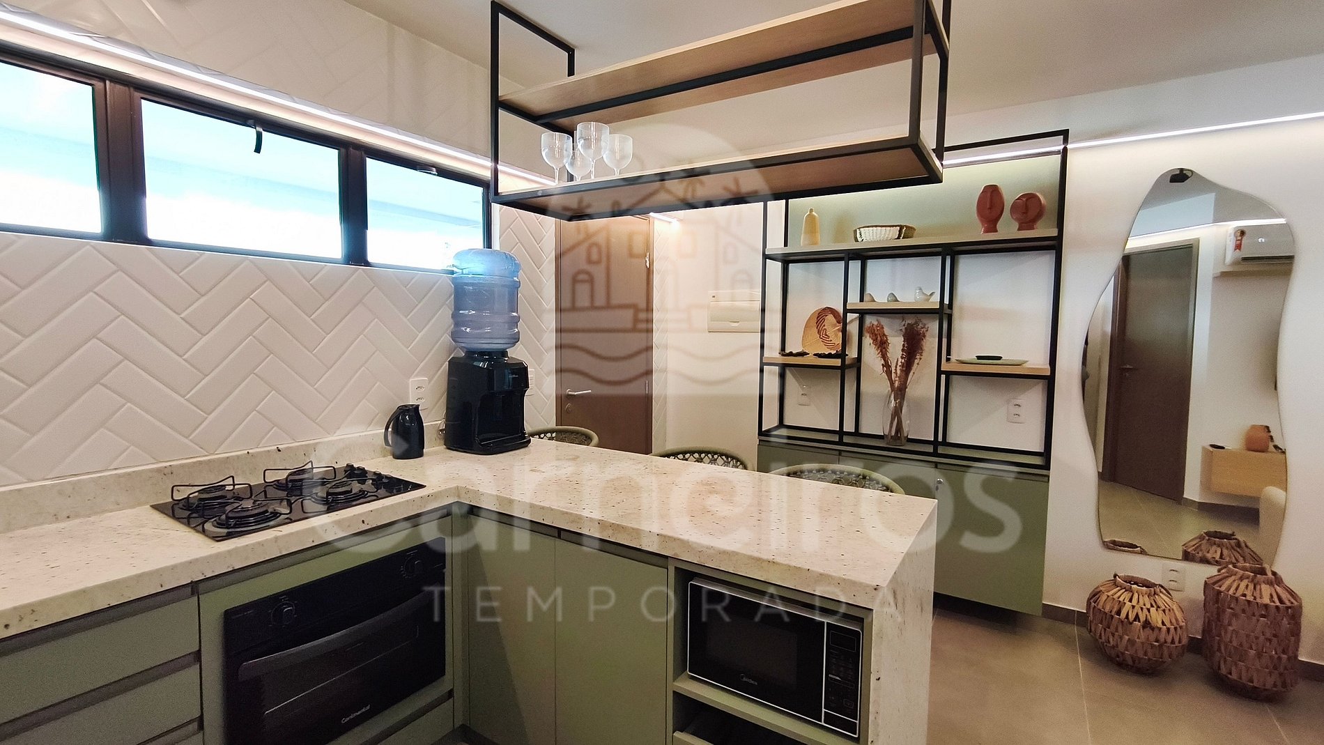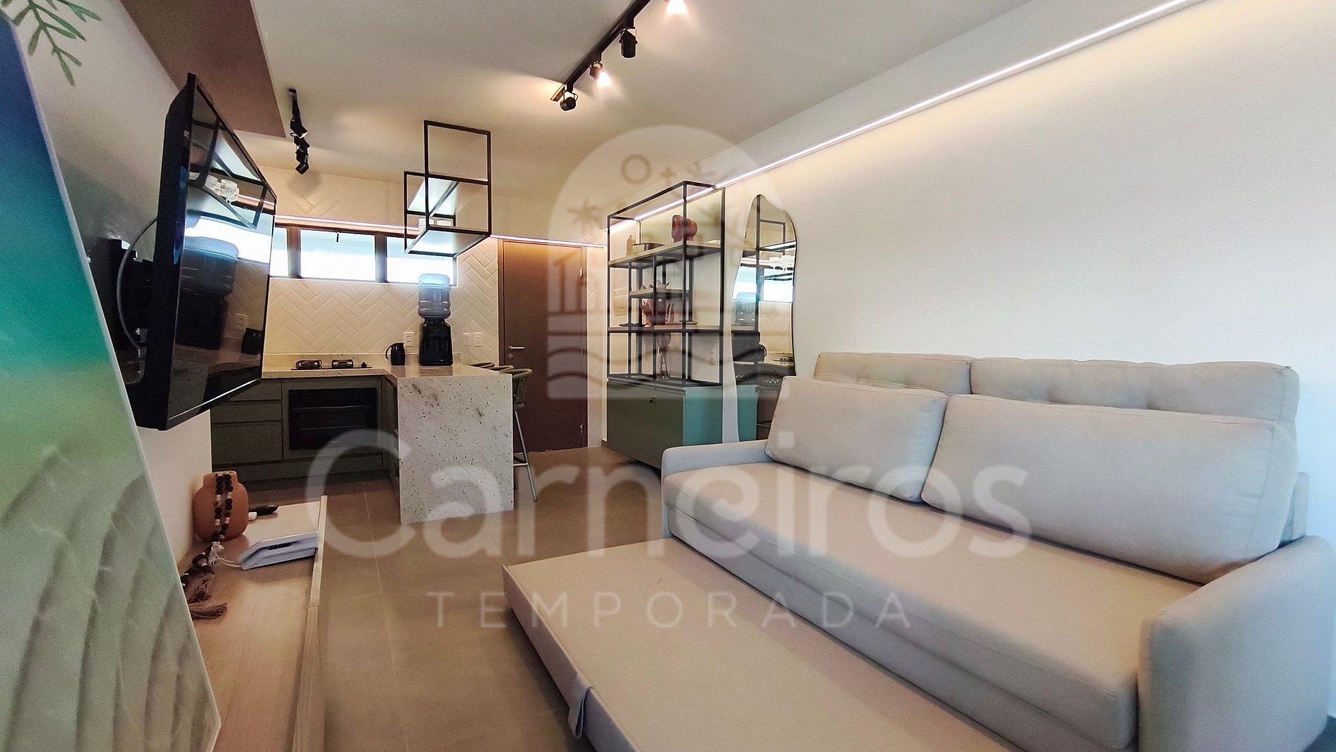 A sala de estar conta com decoração moderna e possui TV (com serviço de streaming), sofá-cama de casal e ar-condicionado. A cozinha é equipada com os principais utensílios como louça, copos, panelas, talheres, liquidificador, micro-ondas, fogão, forno, geladeira, airfryer e diversos utensílios. O flat possui 1 banheiro completo.
