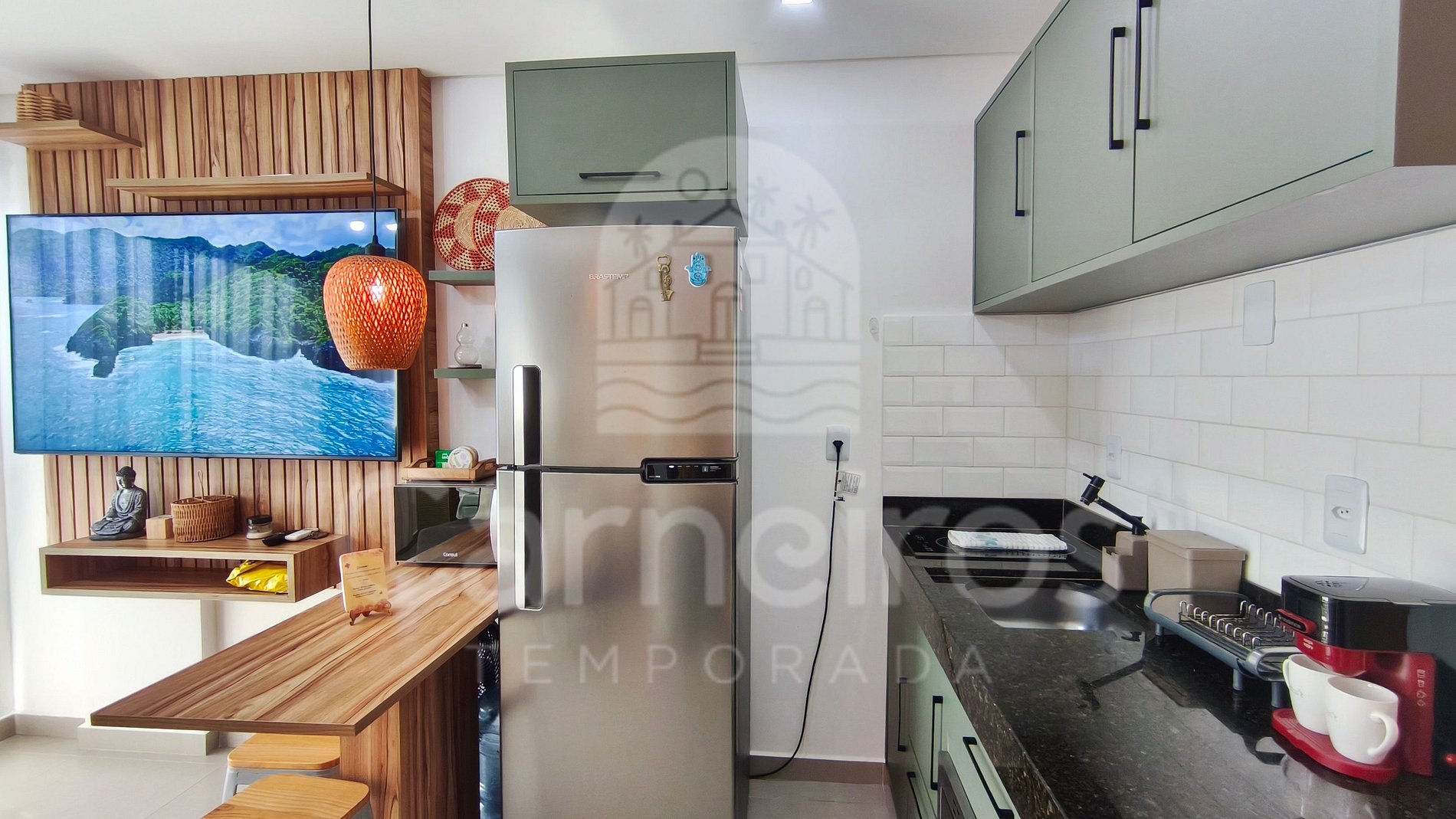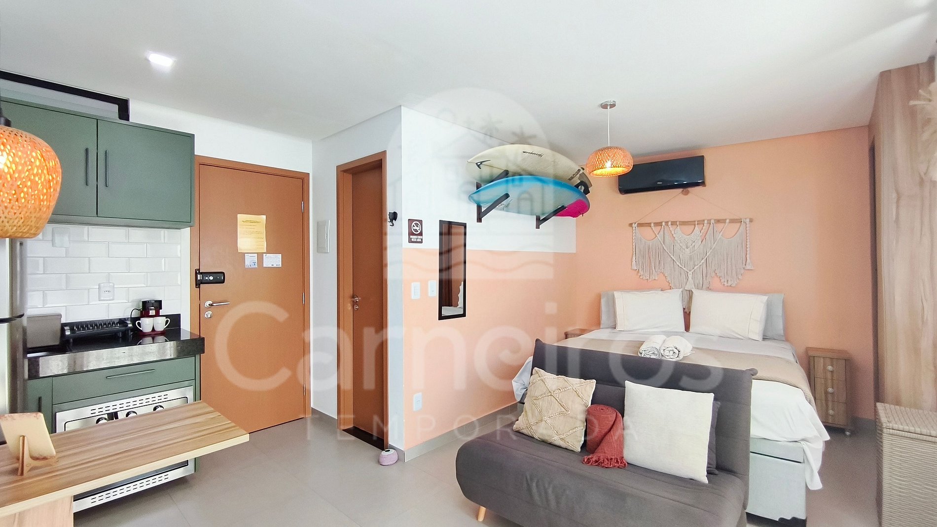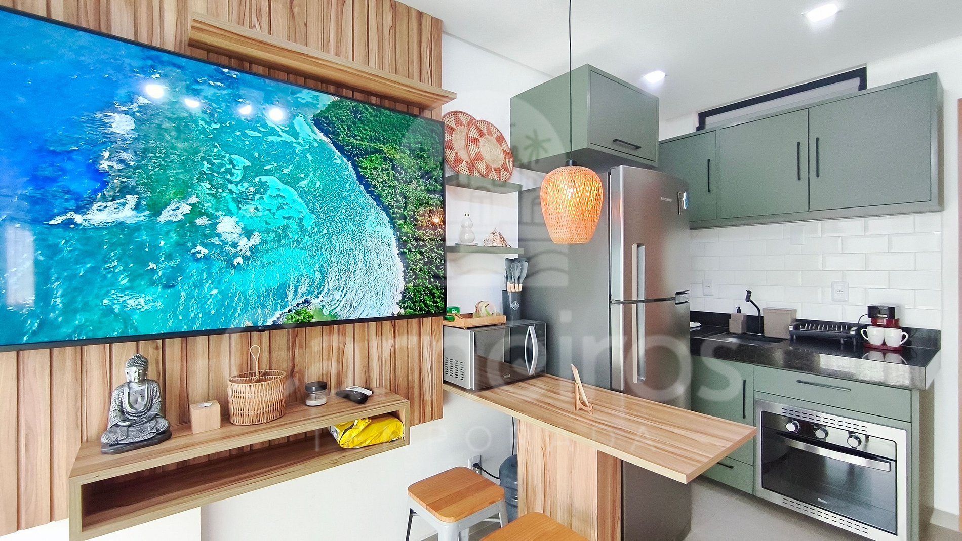 ✹ O flat se encontra no segundo andar do prédio e possui uma linda varanda ✹O ambiente conta com uma decoração moderna e agradável que traz calmaria e conforto, contendo um sofá-cama, TV, cama Queen e ar-condicionado. A cozinha é completa e equipada com os principais utensílios como louças, copos, talheres, geladeira, fogão, forno, liquidificador, micro-ondas, cafeteira e outros. O imóvel possui1 banheiro completo.