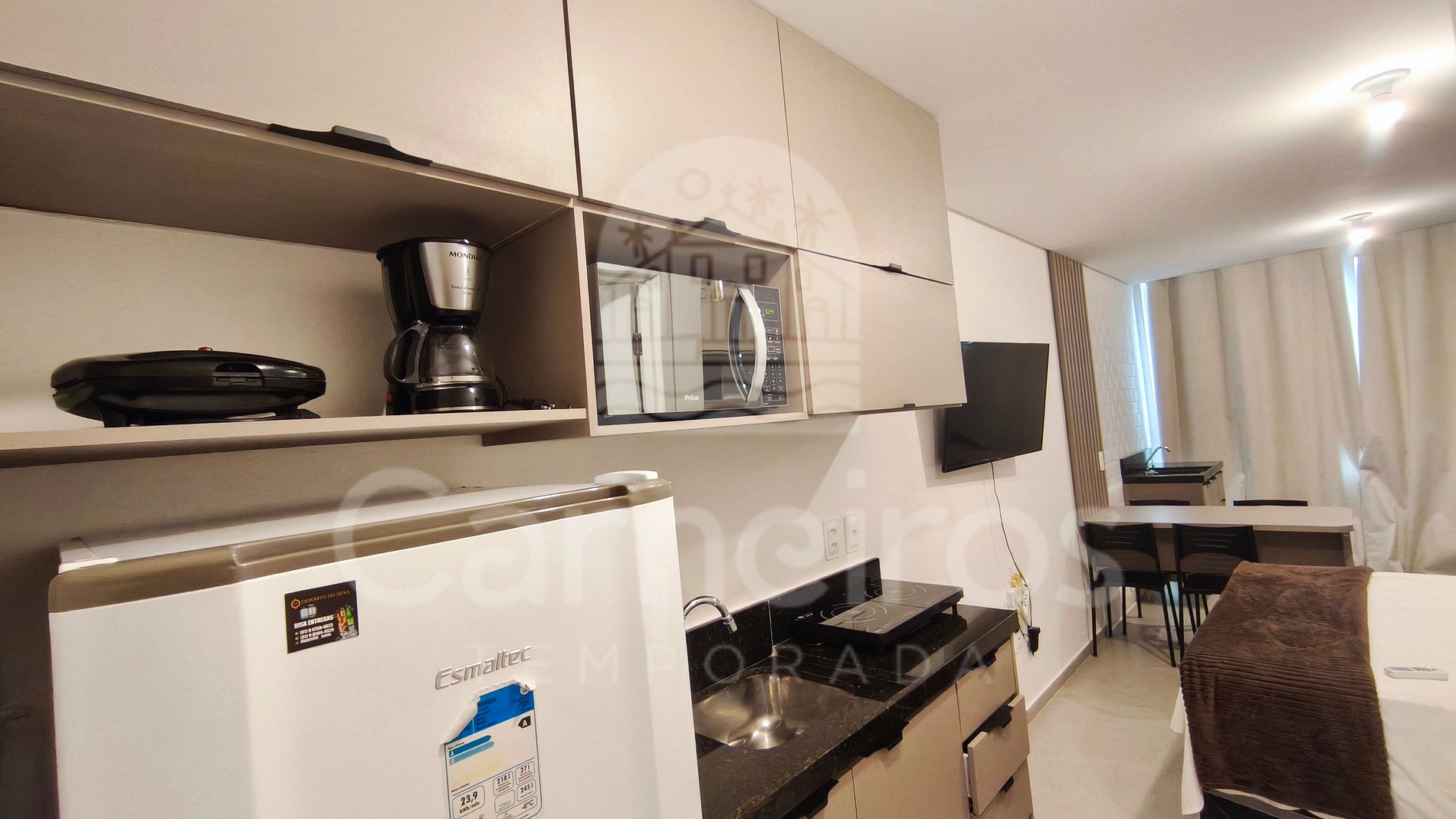 No ambiente integrado você encontrará uma decoração agradável, TV, mesa e cadeiras e ar-condicionado. A cozinha é completa e possui diversas comodidades como louça, copos, panelas, talheres, micro-ondas, fogão cooktop 02 bocas, geladeira, sanduicheira, cafeteira e diversos utensílios. O estúdio possui 01 banheiro completo e conta com ferro de passar roupas.