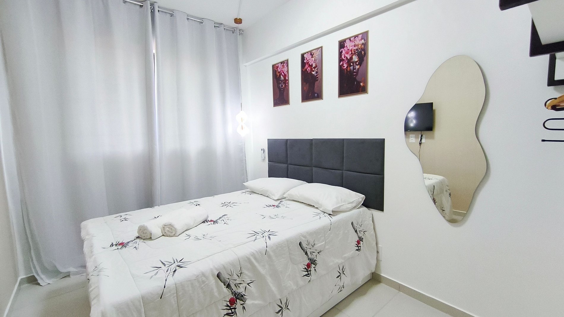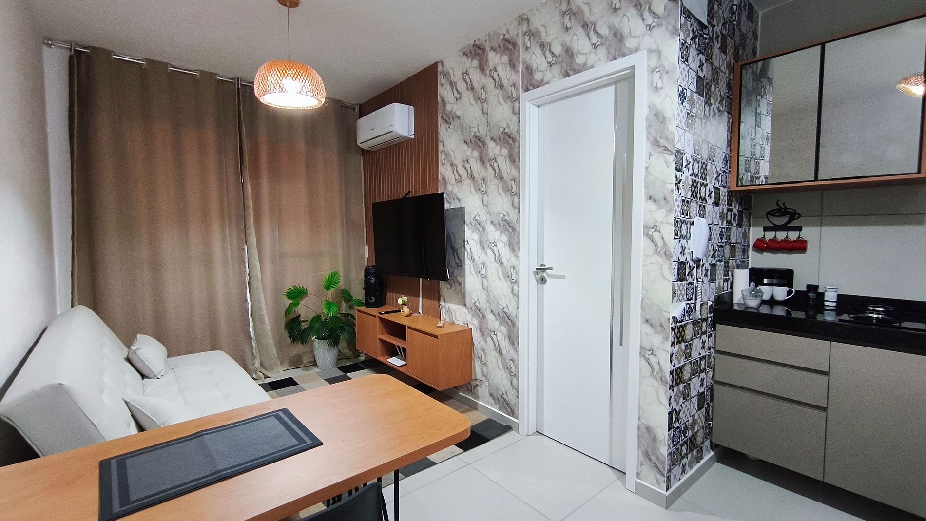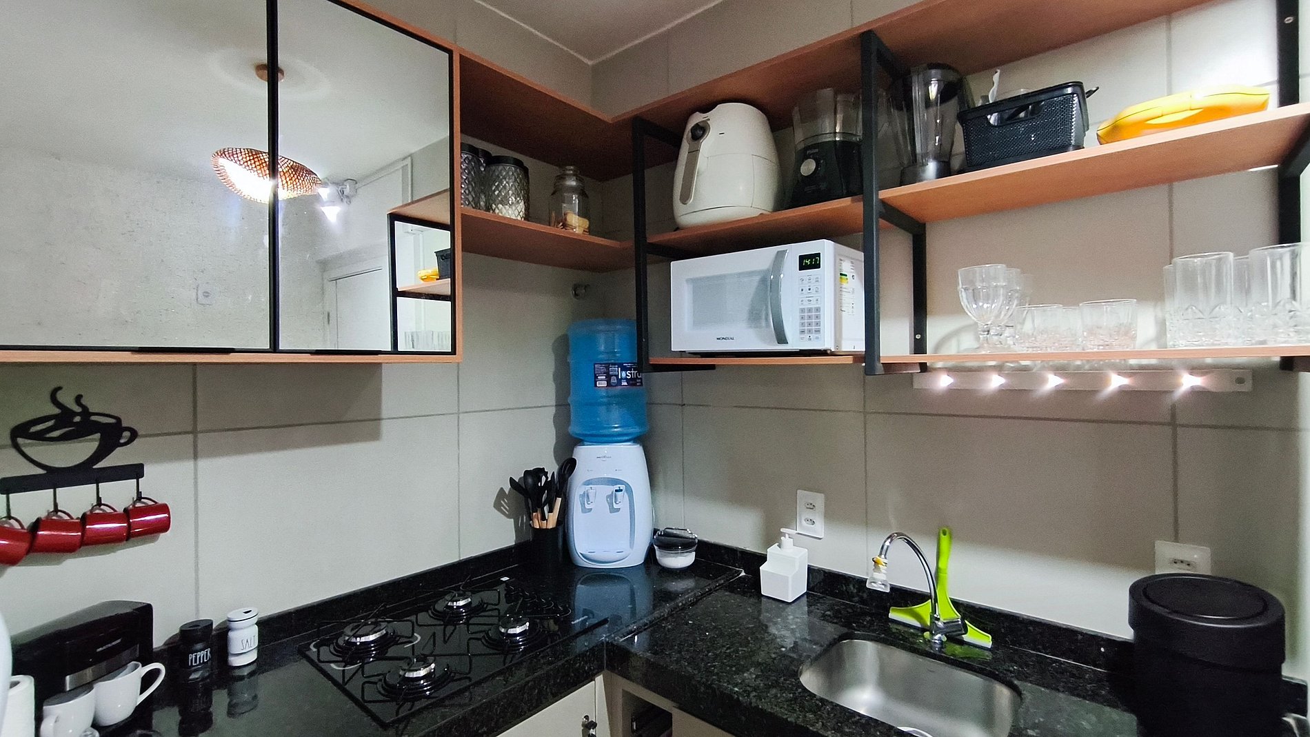 No imóvel você encontrará uma decoração agradável e moderna com TV, sofá-cama e ar-condicionado. A cozinha é completa e possui diversas comodidades como louça, copos, panelas, talheres, sanduicheira, cafeteira, micro-ondas, fogão, torradeira, geladeira, liquidificador e diversos utensílios. Possui também 01 banheiro completo.