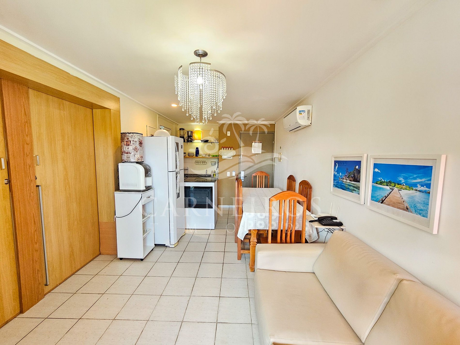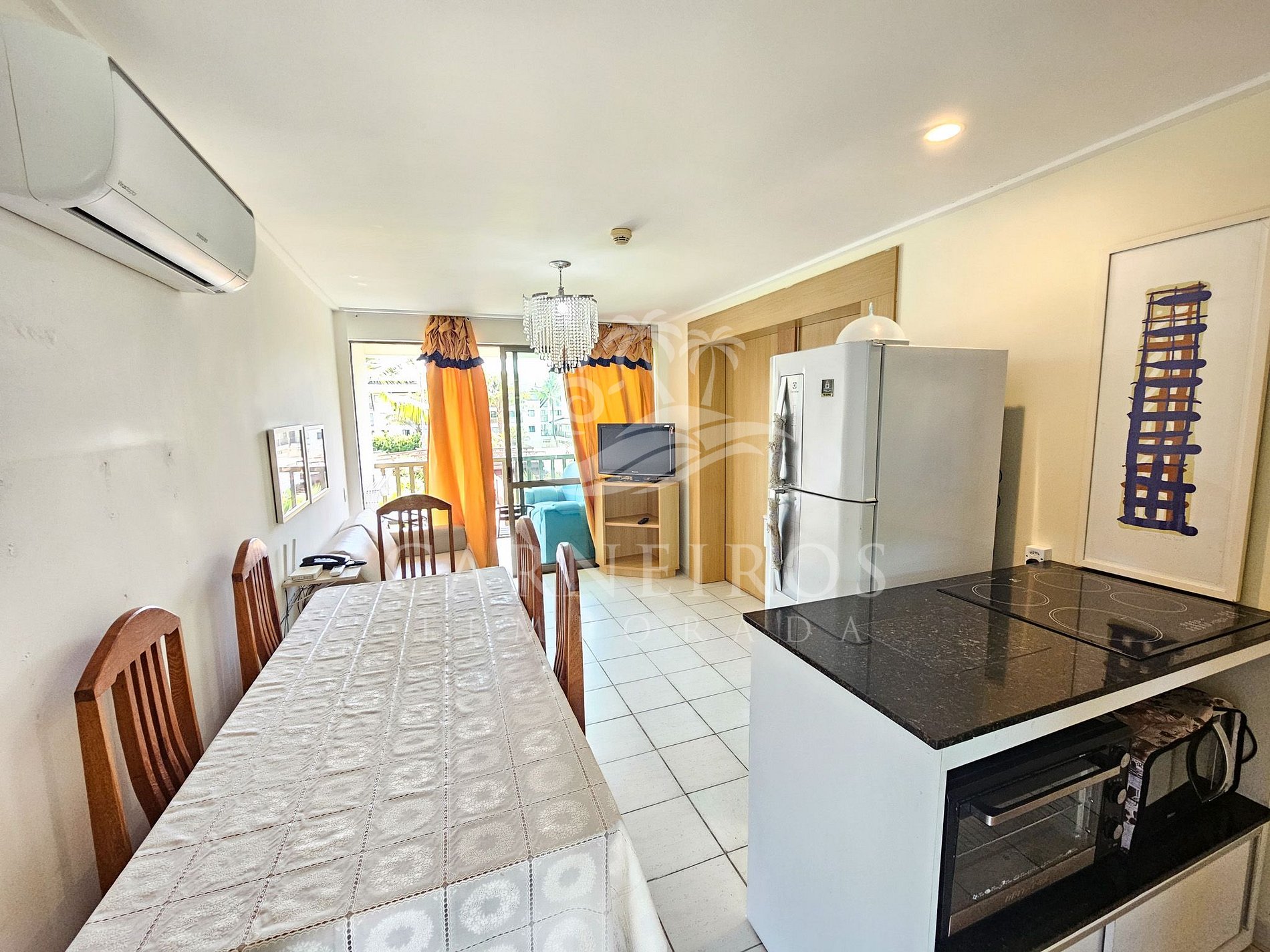 A sala de estar com uma decoração agradável conta com uma TV, sofá-cama de casal e ar-condicionado. A cozinha é completa e equipada com os principais utensílios como louça, copos, panelas, talheres, geladeira, fogão, forno, micro-ondas, liquidificador, cafeteira, bebedouro, botijão de água e outros. Além disso, temos uma mesa de jantar com duas cadeiras de madeira e seis cadeiras adicionais de plástico. Possui também 1 banheiro completo com acesso pela cozinha e quarto de casal.