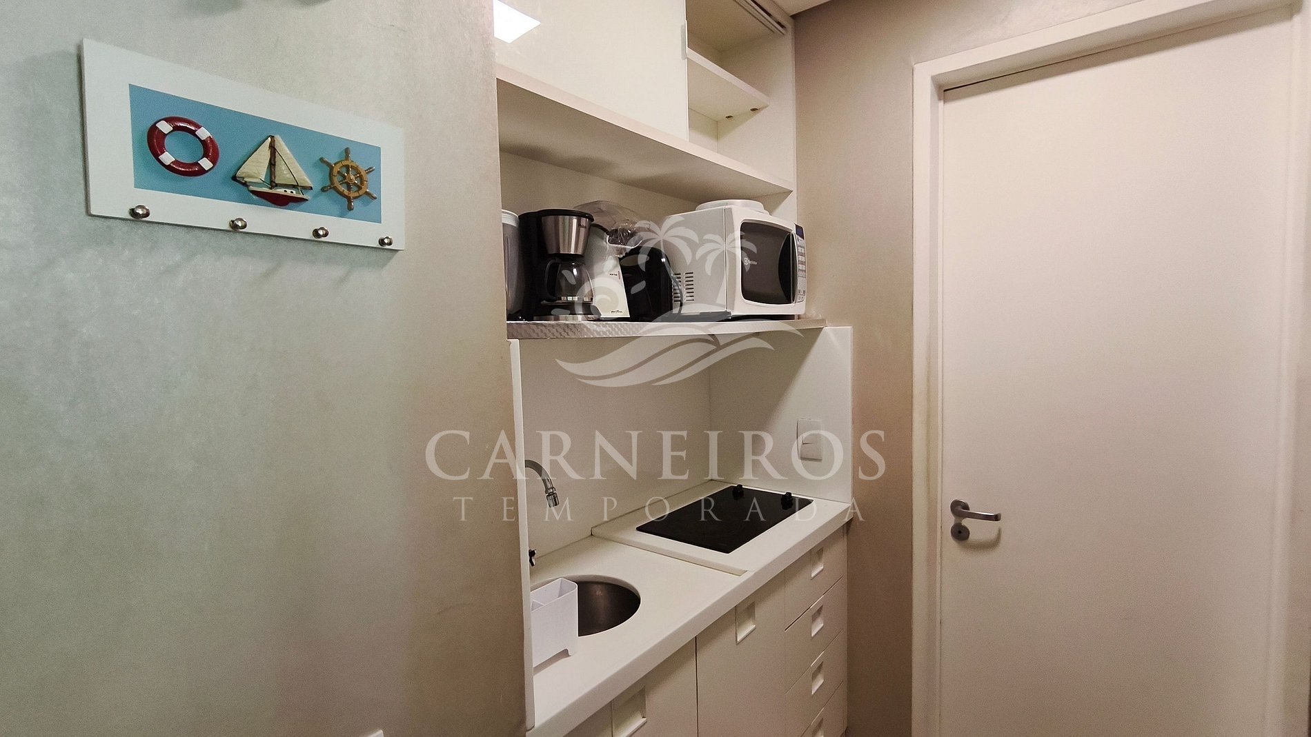 A sala de estar com uma decoração agradável, TV, sofá-cama de casal e ar-condicionado. A cozinha é completa e equipada com os principais utensílios como louça, copos, panelas, talheres, geladeira, fogão 2 bocas cooktop indução, micro-ondas, liquidificador, cafeteira, bebedouro, Air fryer, pipoqueira e outros. Possui também 1 banheiro completo.