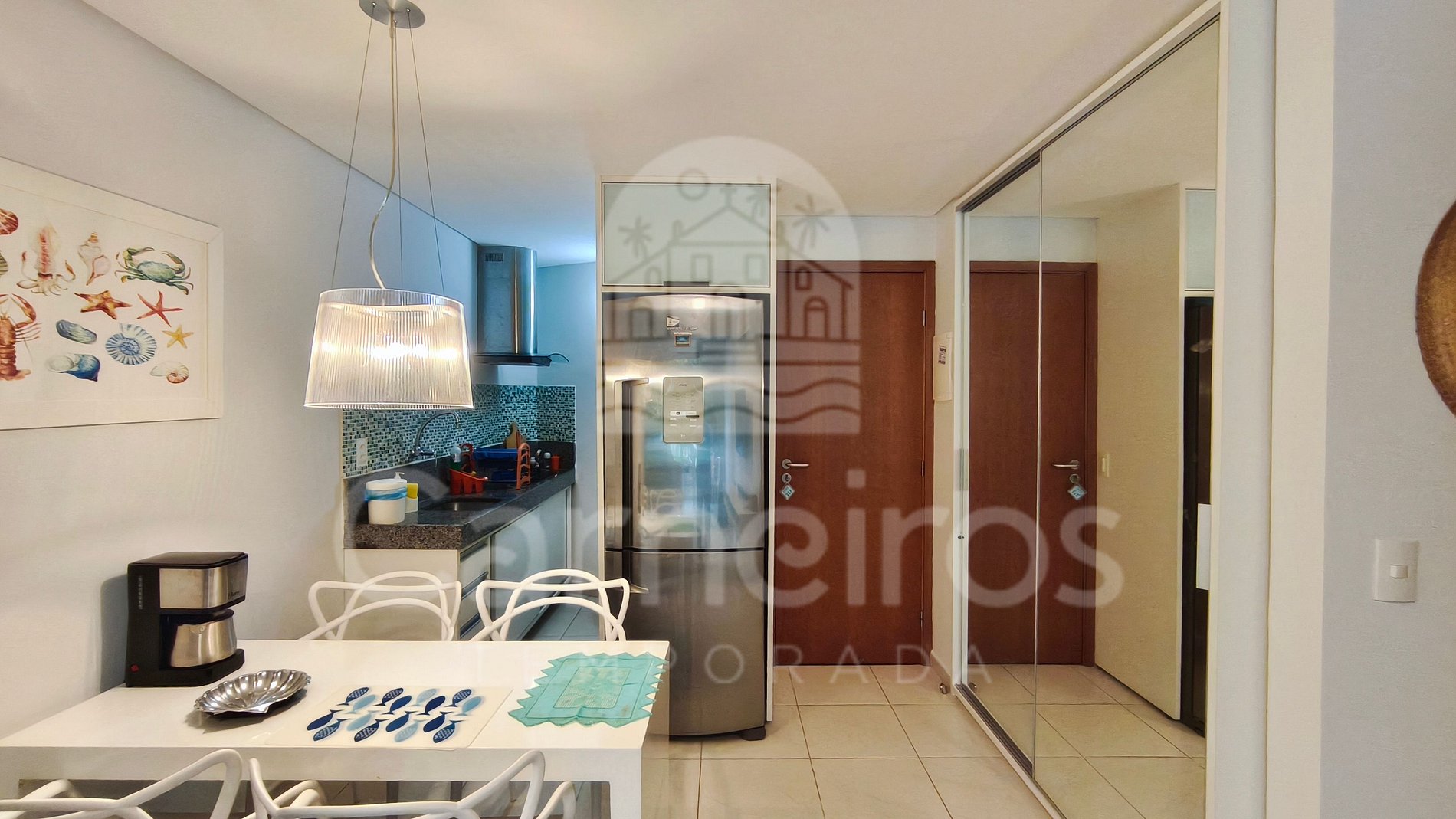 A sala de estar, com uma decoração moderna e aconchegante, conta com uma TV, sofá confortável e ar-condicionado. A cozinha é completa e possui diversos itens como louça, copos, panelas, talheres, sanduicheira, micro-ondas, geladeira, airfryer, liquidificador e diversos utensílios. O flat possui 1 banheiro completo.