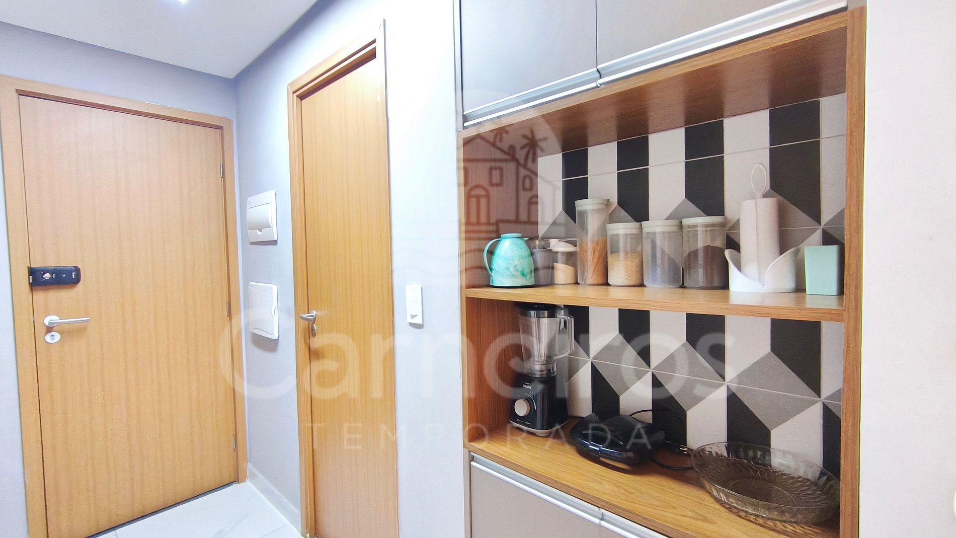 Na sala temos uma TV, balcão com 05 cadeiras e o ar-condicionado. A cozinha é completa e possui diversos itens como micro-ondas, fogão 04 bocas, geladeira e diversos utensílios. O flat possui 1 banheiro com box, armário e chuveiro quente à gás.